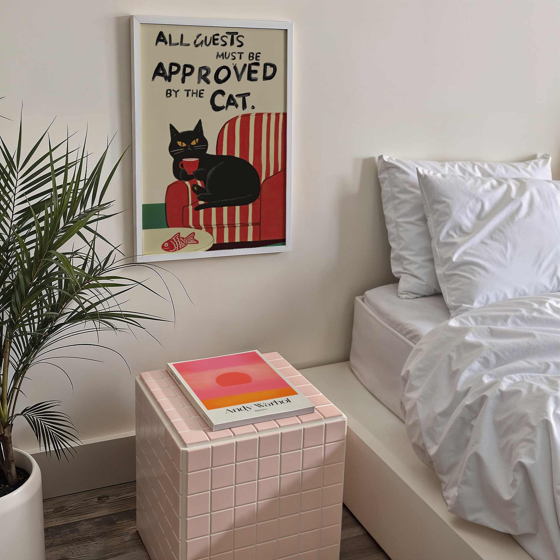 Add a touch of humor and charm to your space with this playful "All Guests Must be Approved by the Cat" print. Featuring a witty cat illustration, this wall art brings a fun, daring vibe that cat lovers will adore. Perfect for sparking smiles and setting a lighthearted tone in any room.