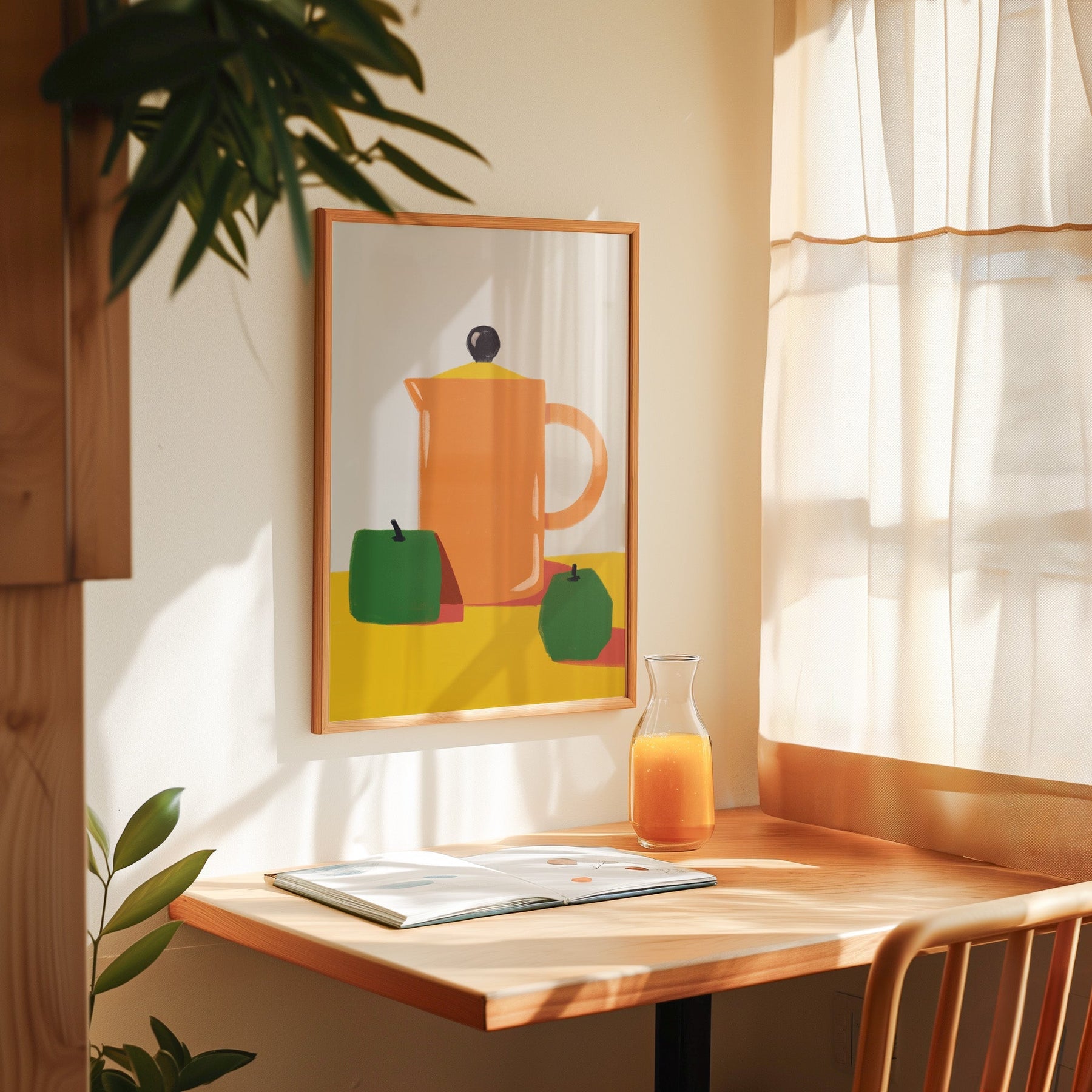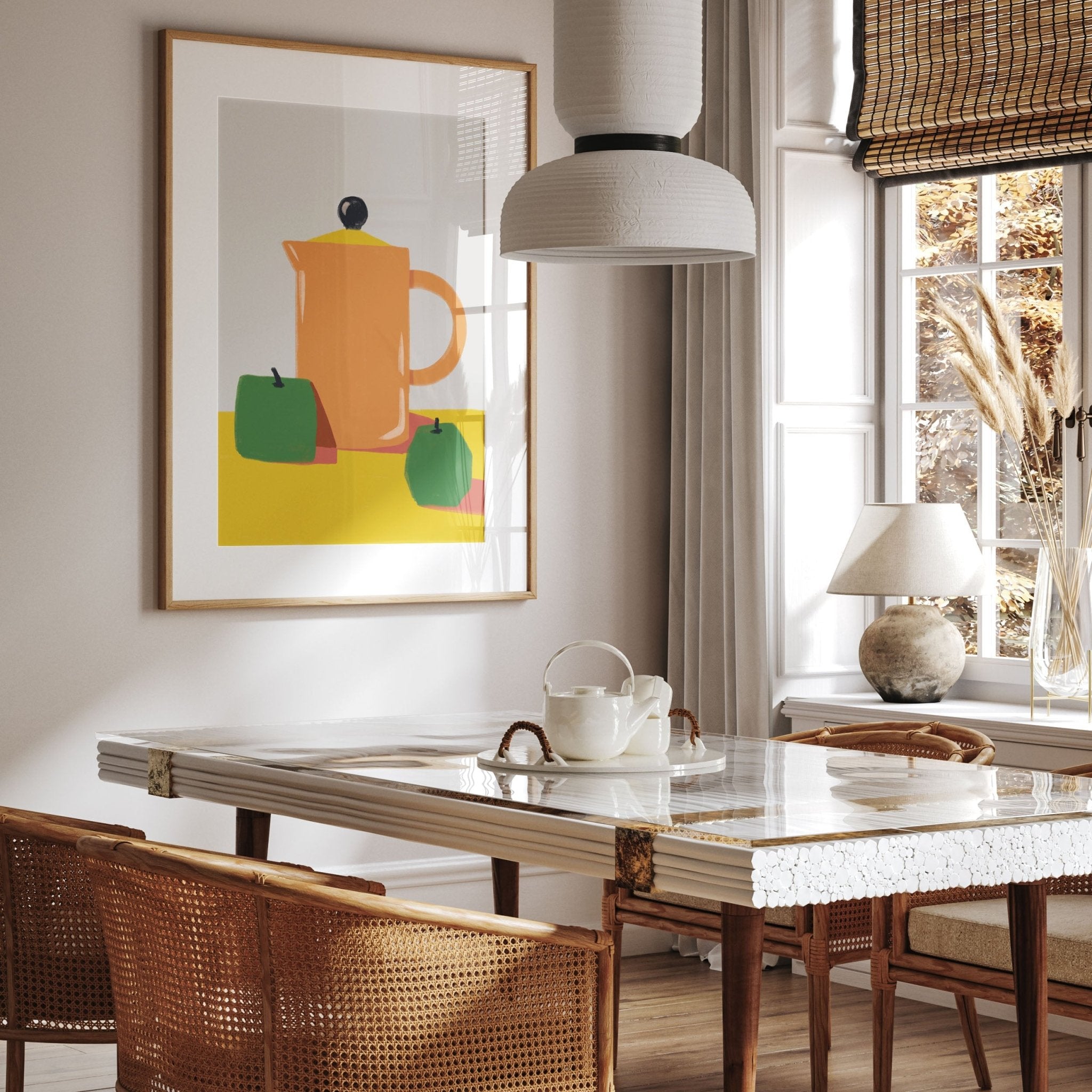 This vibrant Apples and Orange Kitchen Jug print will bring the fun and charm of a countryside kitchen into your home. The bold colors and playful design are perfect for displaying in your living room, kitchen, or bedroom. Add a touch of rustic charm to any room with this delightful poster.