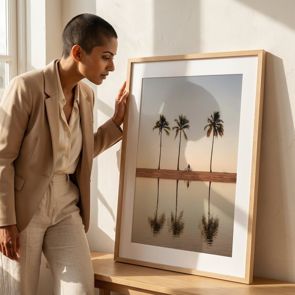 Capture the essence of coastal freedom with this striking photograph by Colton Jones. The composition masterfully frames a solitary cyclist navigating between three towering palm trees, set against the warm, golden hues of a beach sunset. The interplay of light and shadow creates depth and movement, while the natural elements—sand, sea, and sky—establish a serene yet dynamic atmosphere. This piece evokes a sense of adventure and tranquility, making it an ideal focal point for spaces seeking to inspire wanderlust and contemplation. Perfect for modern interiors, coastal-themed rooms, or anywhere you want to infuse a touch of natural beauty and motion.