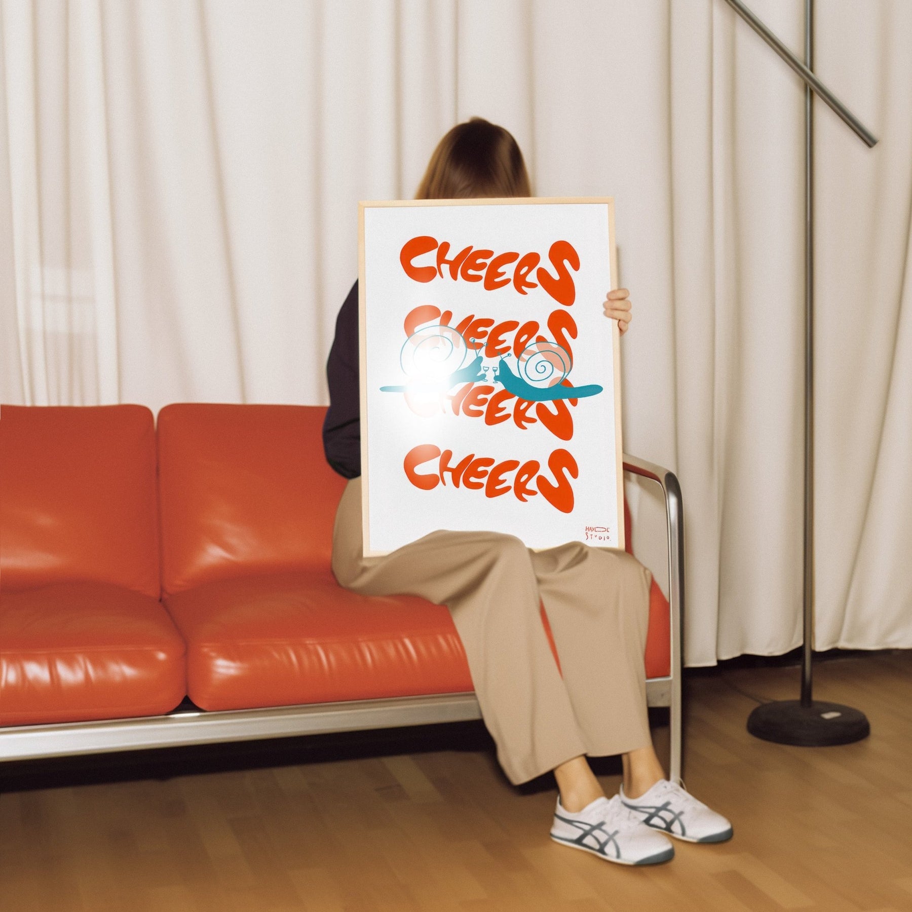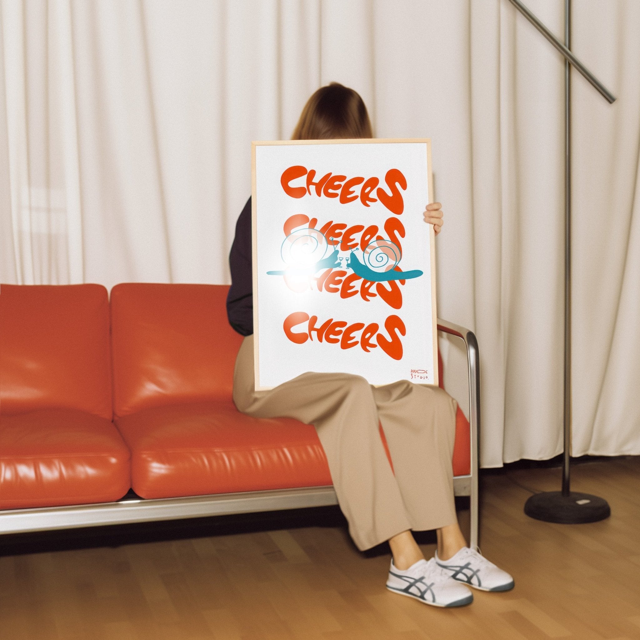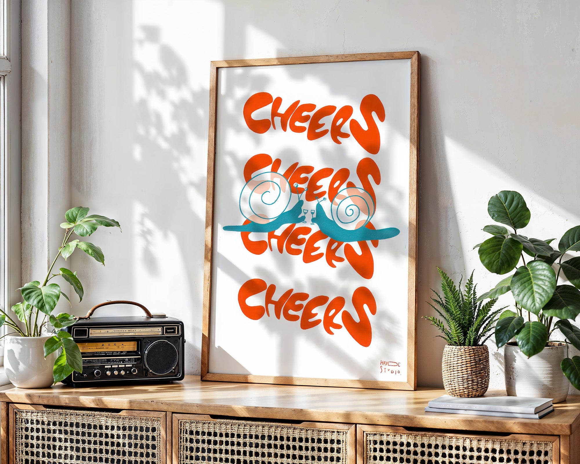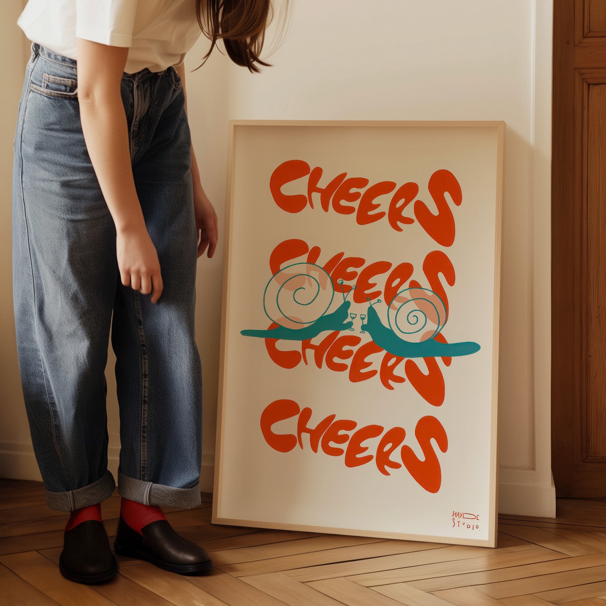 Add a splash of whimsy to any space with "Cheers Snails" by Hayde Nizard. This playful poster brings charming snails raising a toast, perfect for brightening up your living room, kitchen, or bedroom. Its lighthearted design invites smiles and adds a fun, quirky touch to your walls. Embrace cheerful vibes and let this artwork spark joy in your home.