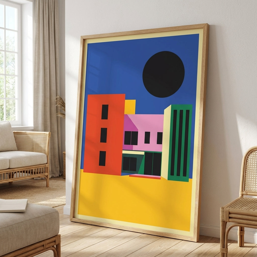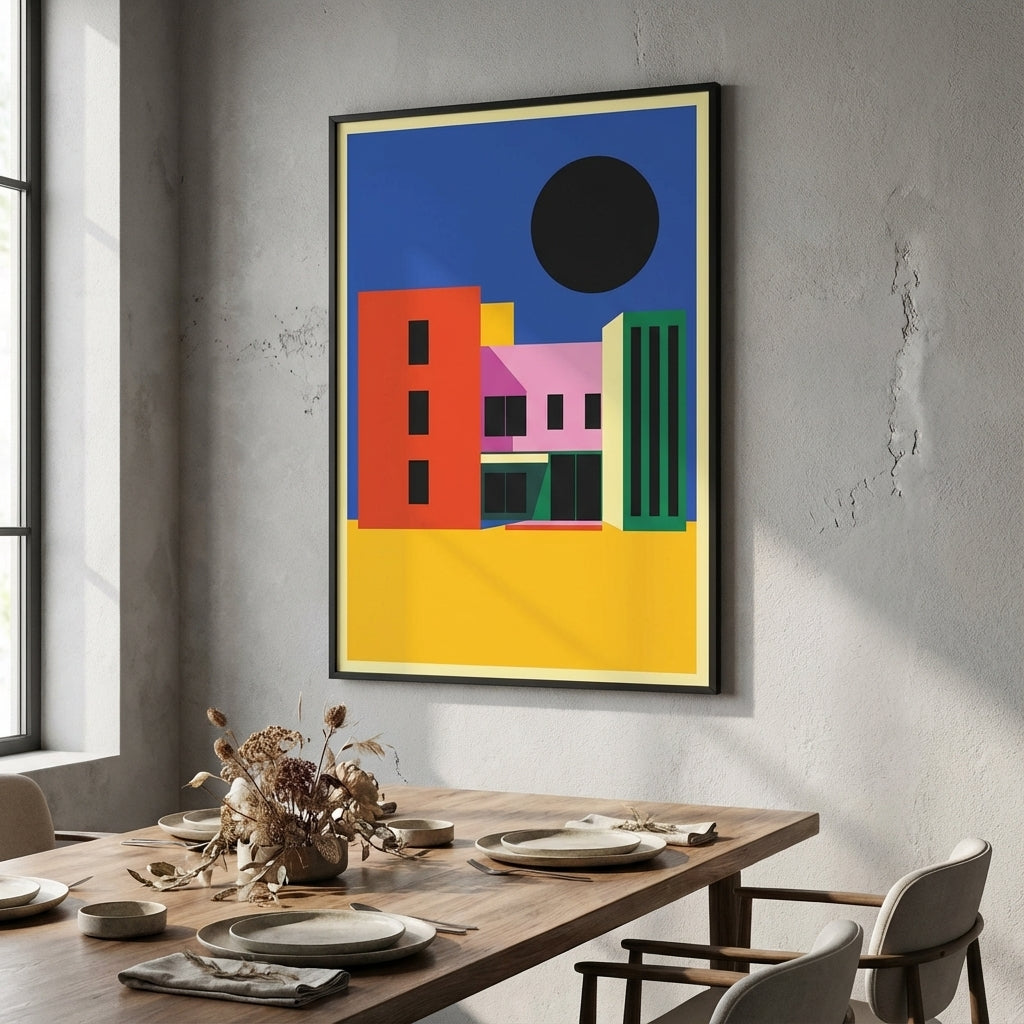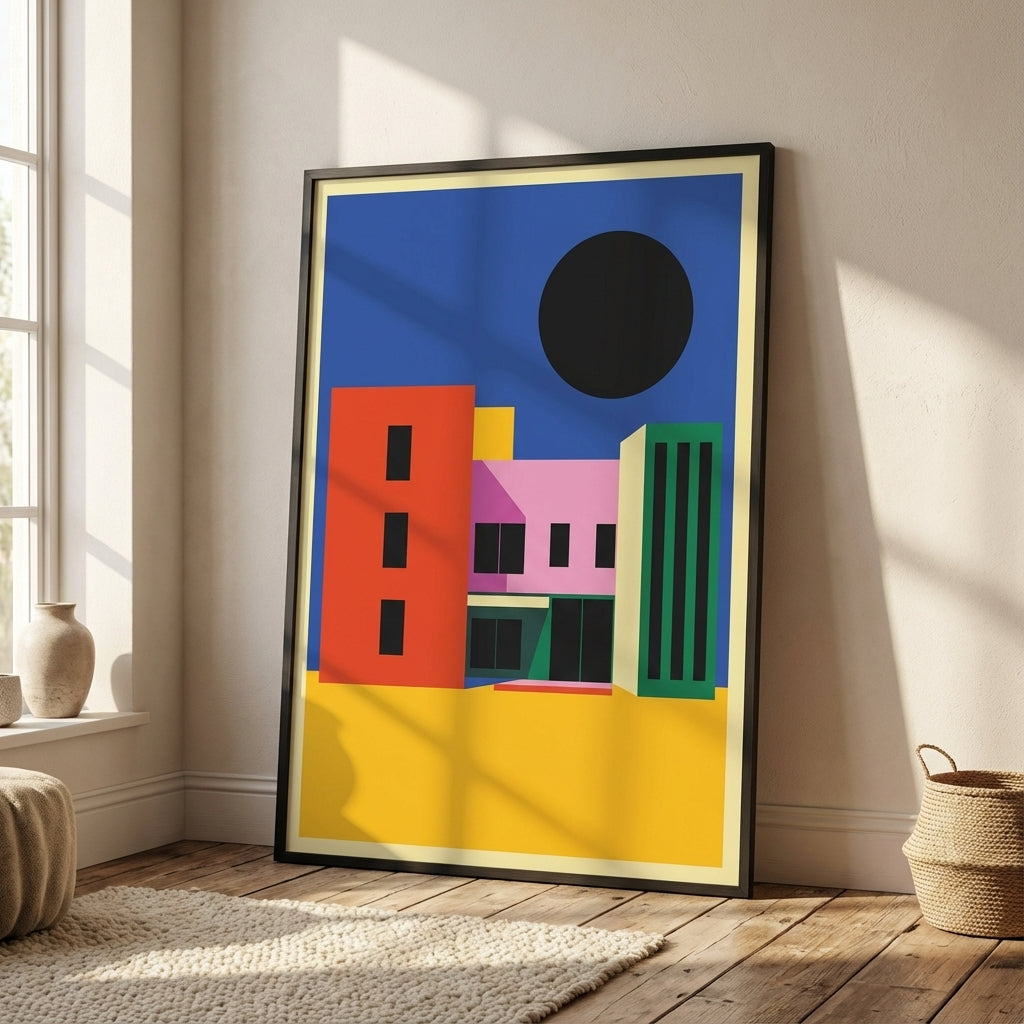 City of Colour captures the vibrancy of urban architecture through bold geometric forms and striking colour contrasts. This artwork features a dynamic composition of colourful buildings set against a serene blue sky, anchored by a distinctive black circle that adds visual depth and contemporary edge. Perfect for modern interiors, this piece brings energy and sophistication to any space, celebrating the intersection of art and architecture with confident, expert-level design.
