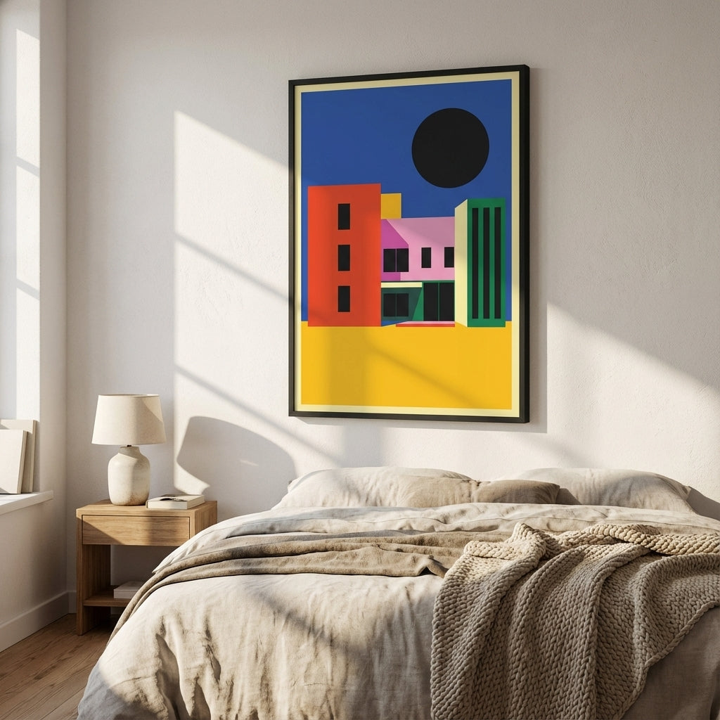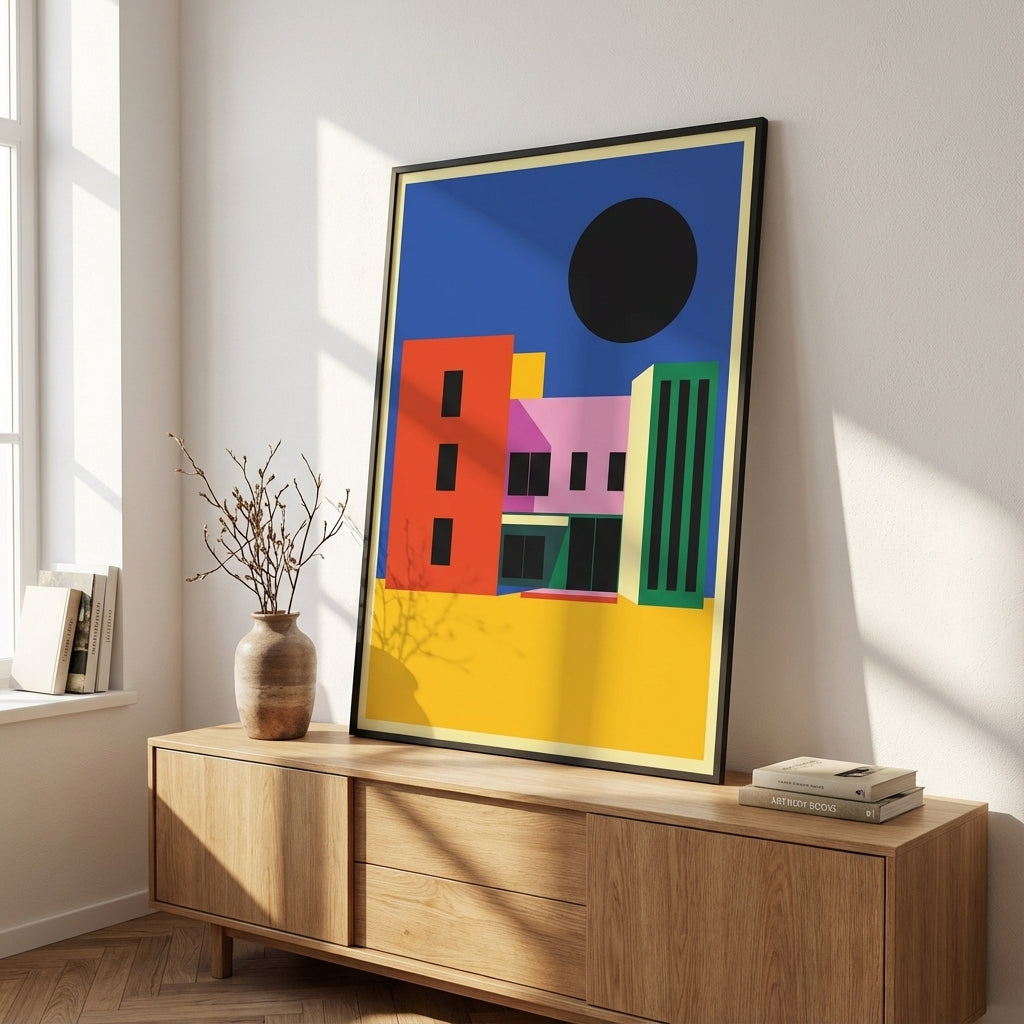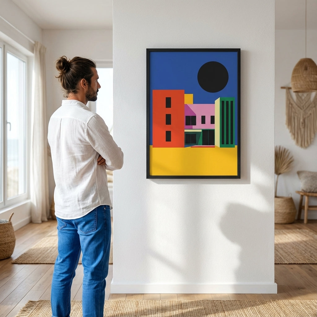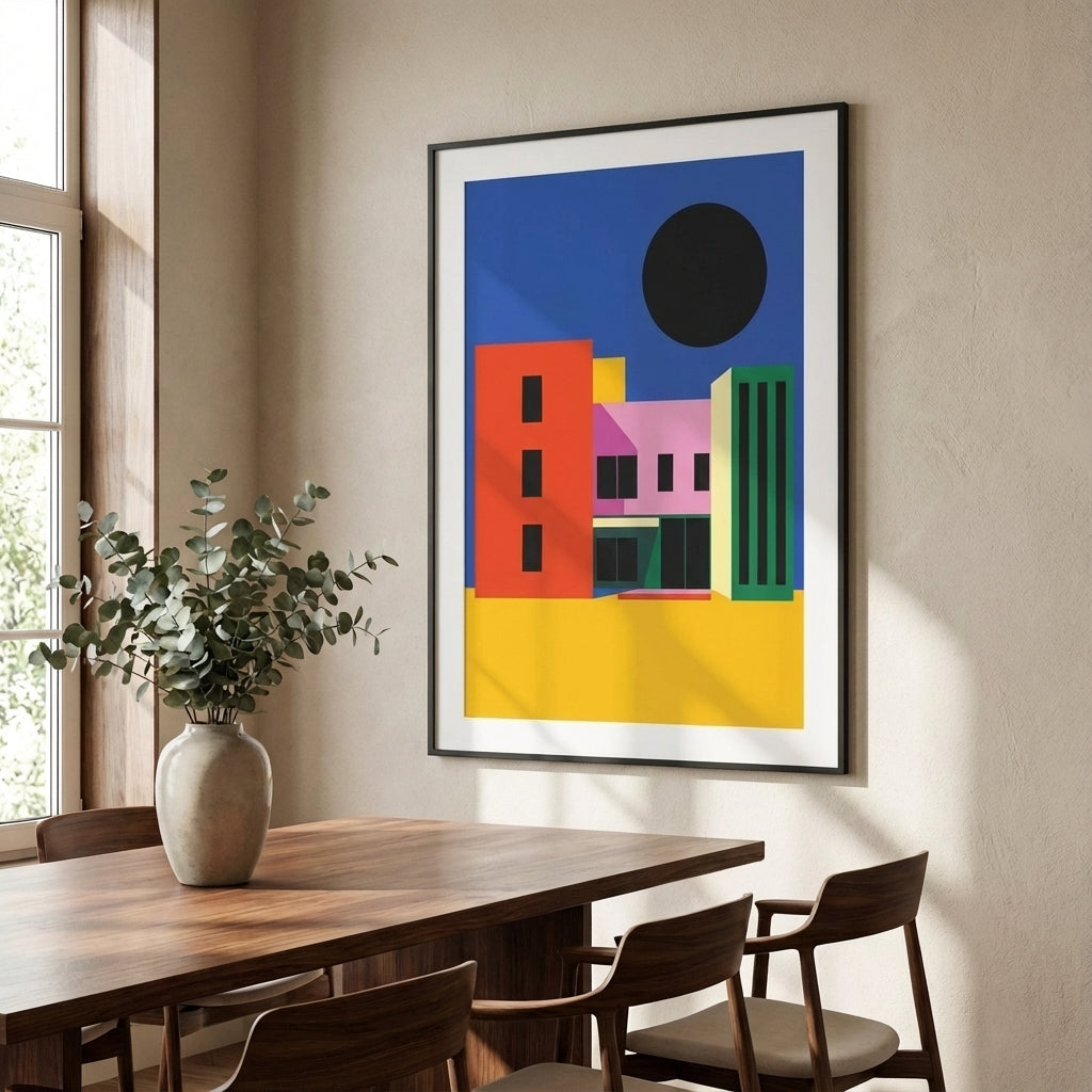 City of Colour captures the vibrancy of urban architecture through bold geometric forms and striking colour contrasts. This artwork features a dynamic composition of colourful buildings set against a serene blue sky, anchored by a distinctive black circle that adds visual depth and contemporary edge. Perfect for modern interiors, this piece brings energy and sophistication to any space, celebrating the intersection of art and architecture with confident, expert-level design.