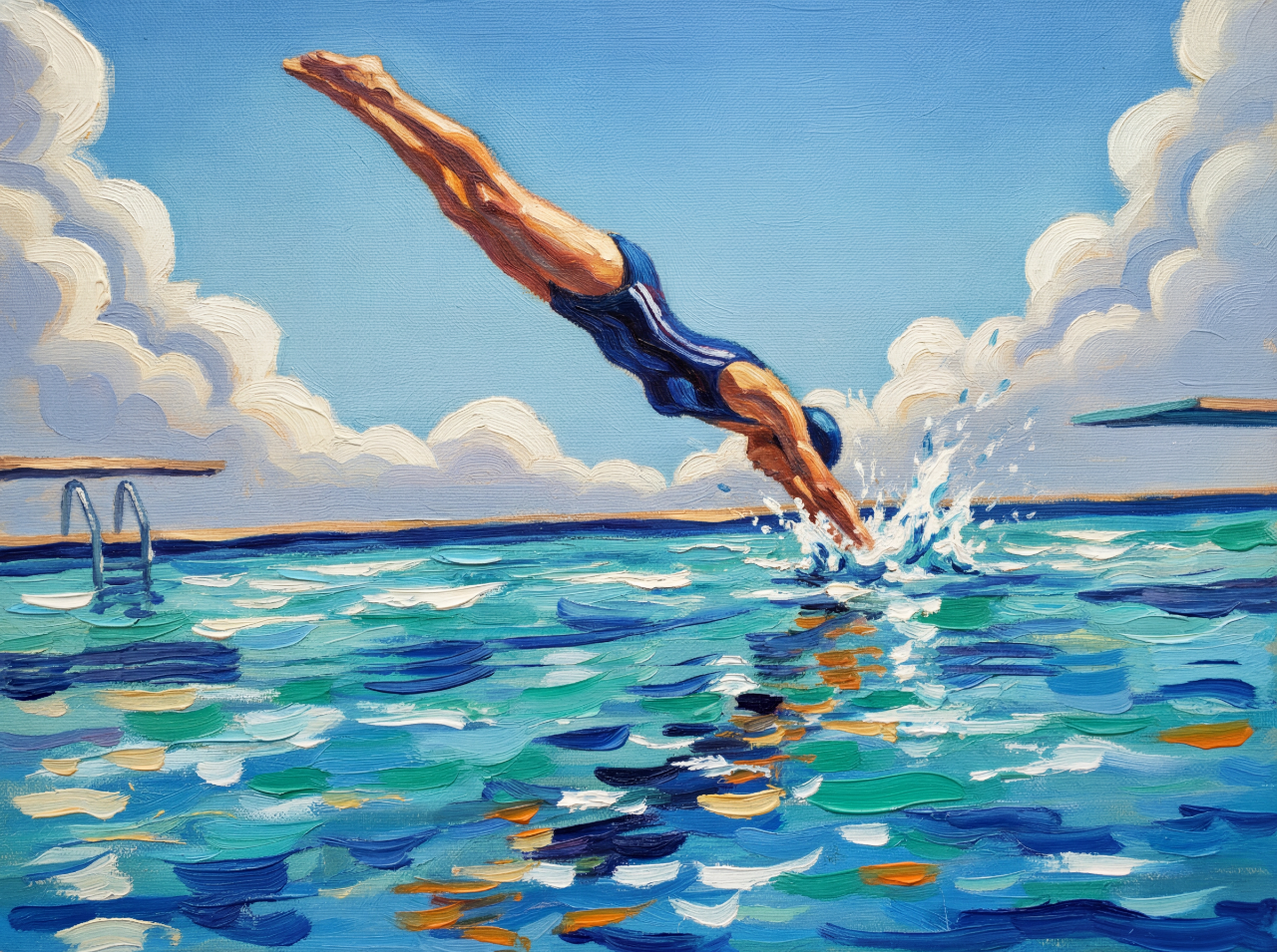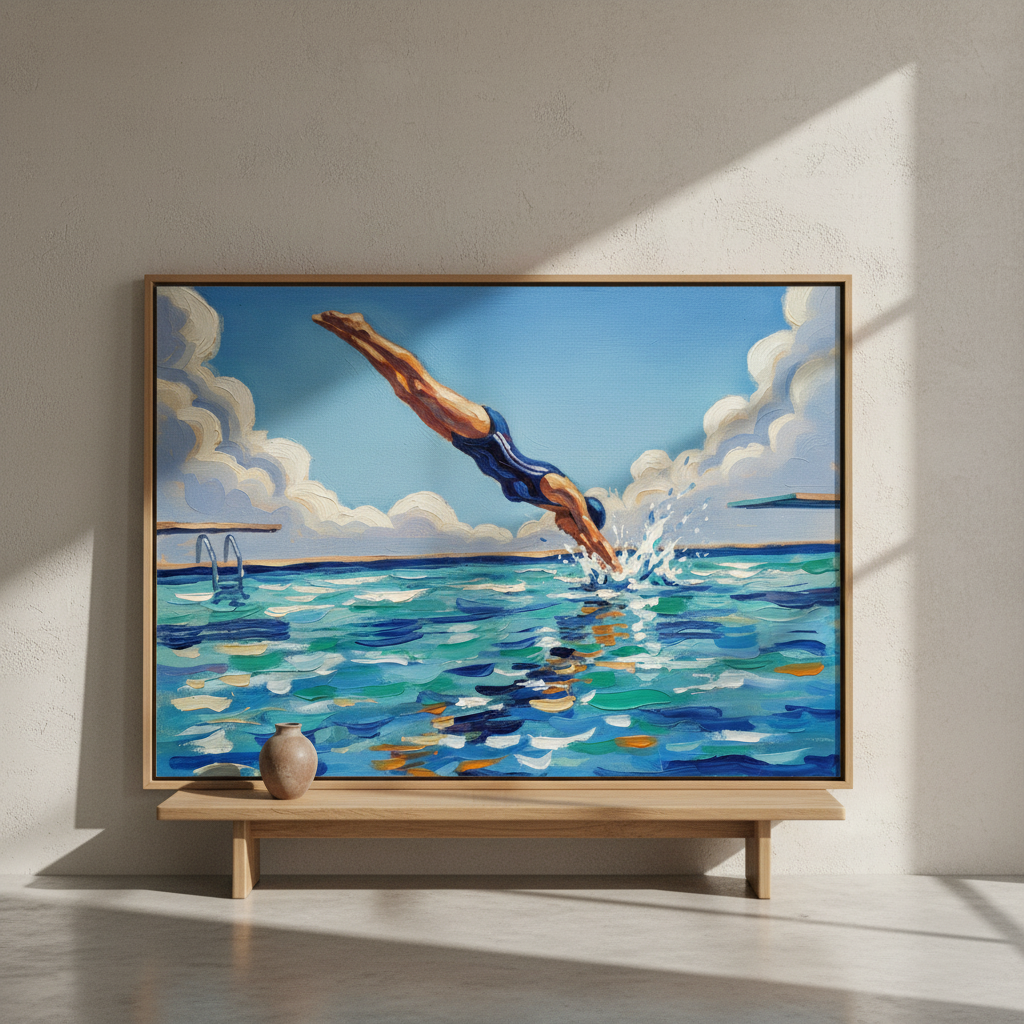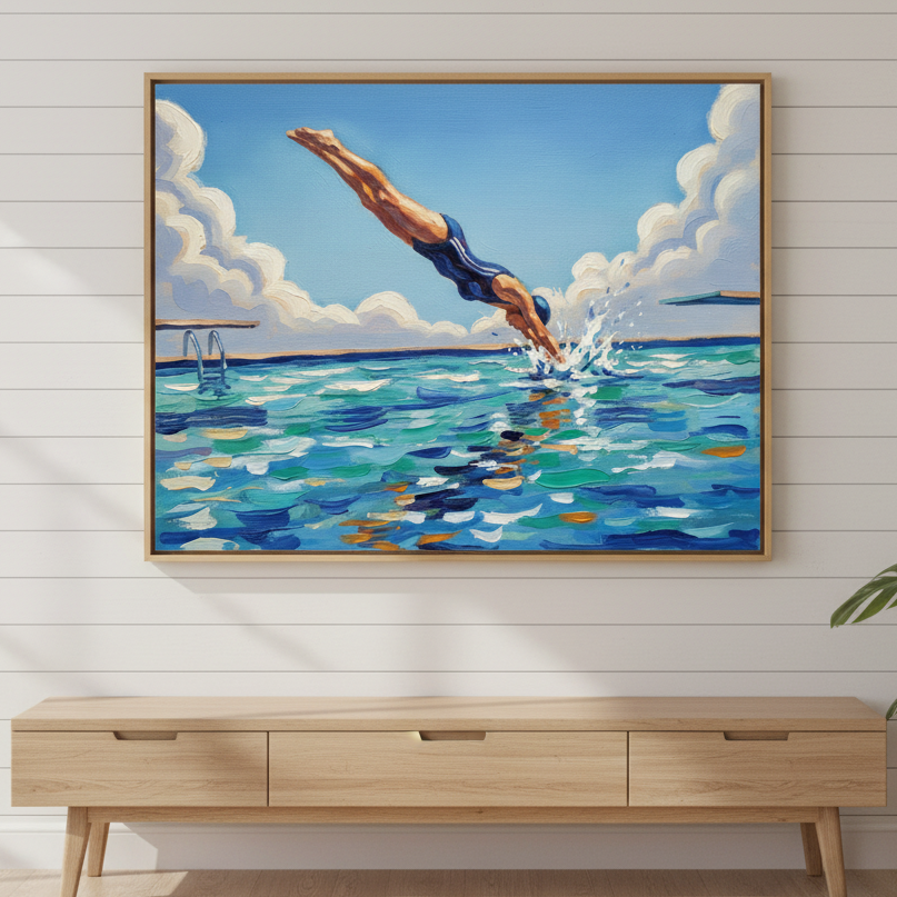 Capture the fluid motion and serene beauty of this landscape print, where bold brushstrokes depict a figure diving into tranquil waters. The dynamic composition balances movement with calm, rendered in a contemporary painting style that brings gallery-quality depth to your space. Perfect for creating a focal point in living areas, bedrooms, or creative studios, this print celebrates the intersection of nature and human connection. Ideal for art collectors and those seeking statement pieces that inspire contemplation and conversation.