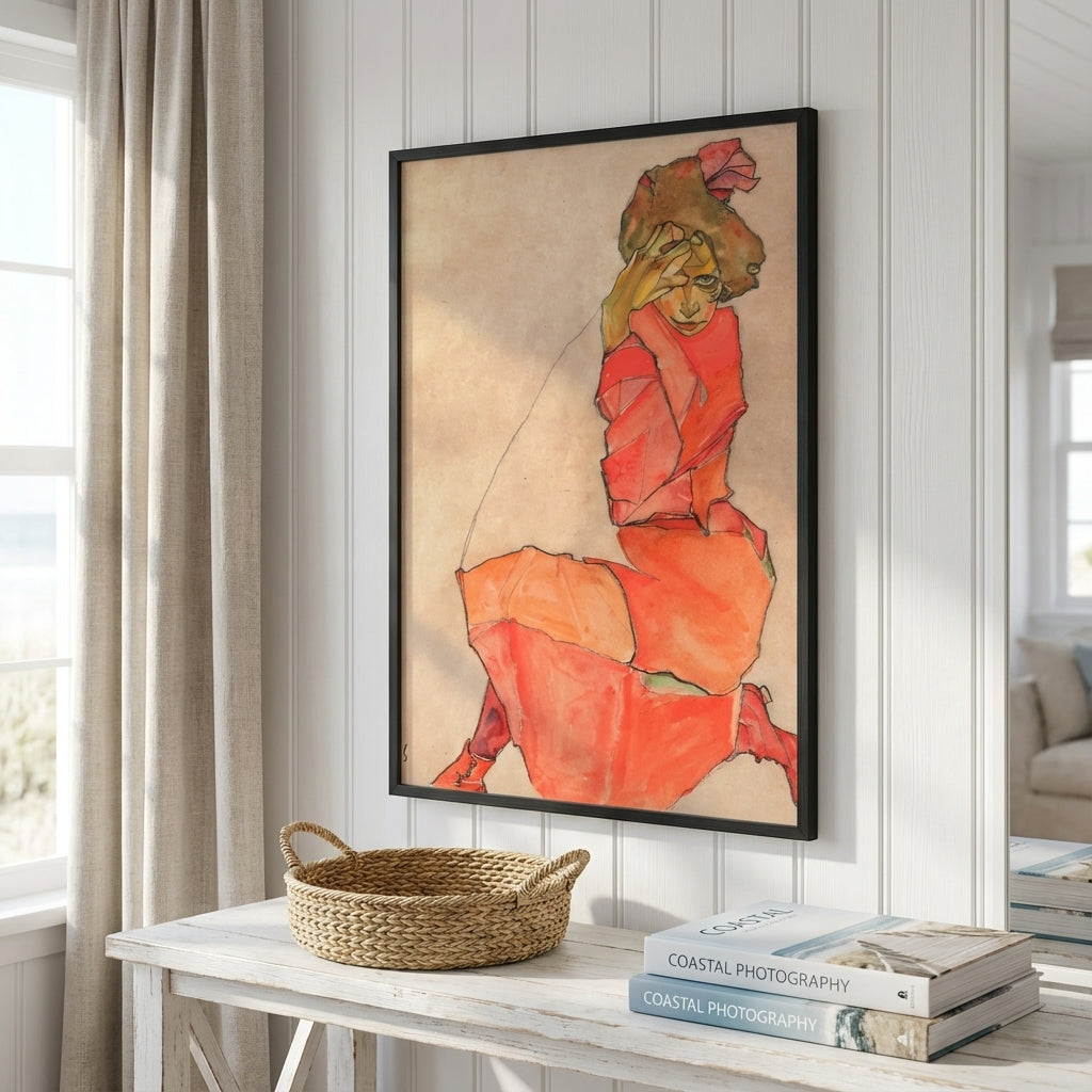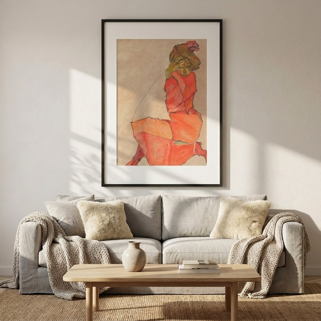 Egon Schiele's "Kneeling Female in Orange Red Dress" (1910) exemplifies the Austrian Expressionist master's distinctive approach to figurative art. This striking composition features a solitary female figure rendered in Schiele's characteristic angular, gestural style, her vibrant red-orange garment commanding visual attention against the restrained beige background. The work demonstrates Schiele's psychological intensity and formal innovation, capturing both physical presence and emotional vulnerability through bold contour lines and expressive distortion. A compelling addition to any collection celebrating early 20th-century modernism and the raw emotional power of Expressionist portraiture.