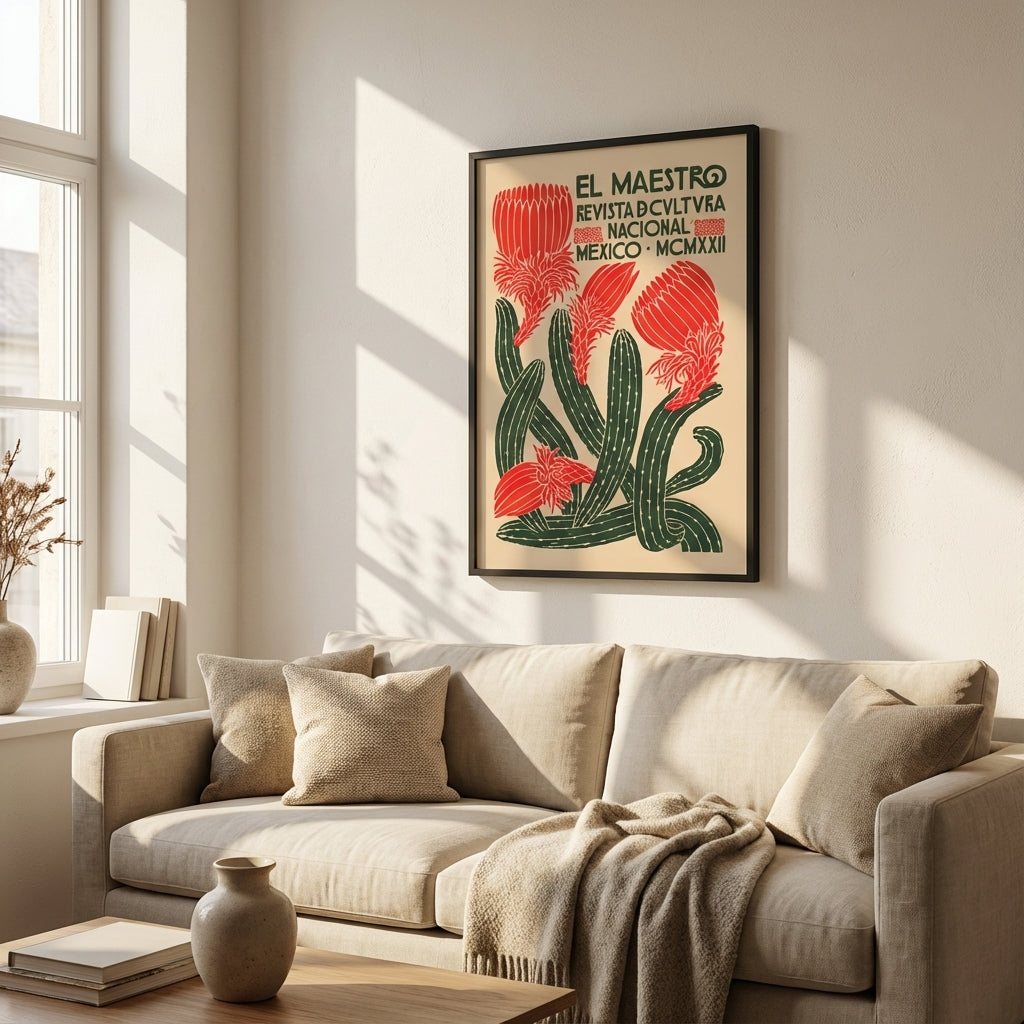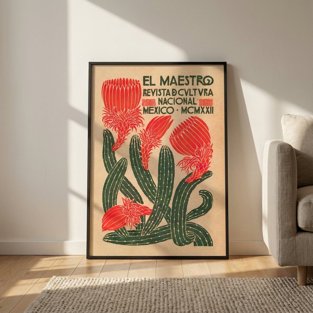 El Maestro Mexican Vintage Magazine captures the essence of early 20th-century Mexican cultural journalism. This striking reproduction features a sophisticated design with vibrant red flowers and verdant foliage set against a warm beige backdrop, evoking the aesthetic of 1922 publication design. The prominent "El Maestro" masthead and "Revista de Cultura Nacional Mexico MCMXXII" text authenticate its historical character. Ideal for collectors of vintage Mexican ephemera, cultural historians, or those seeking authentic period décor that celebrates Mexico's rich artistic heritage. A distinguished addition to any gallery wall or study.