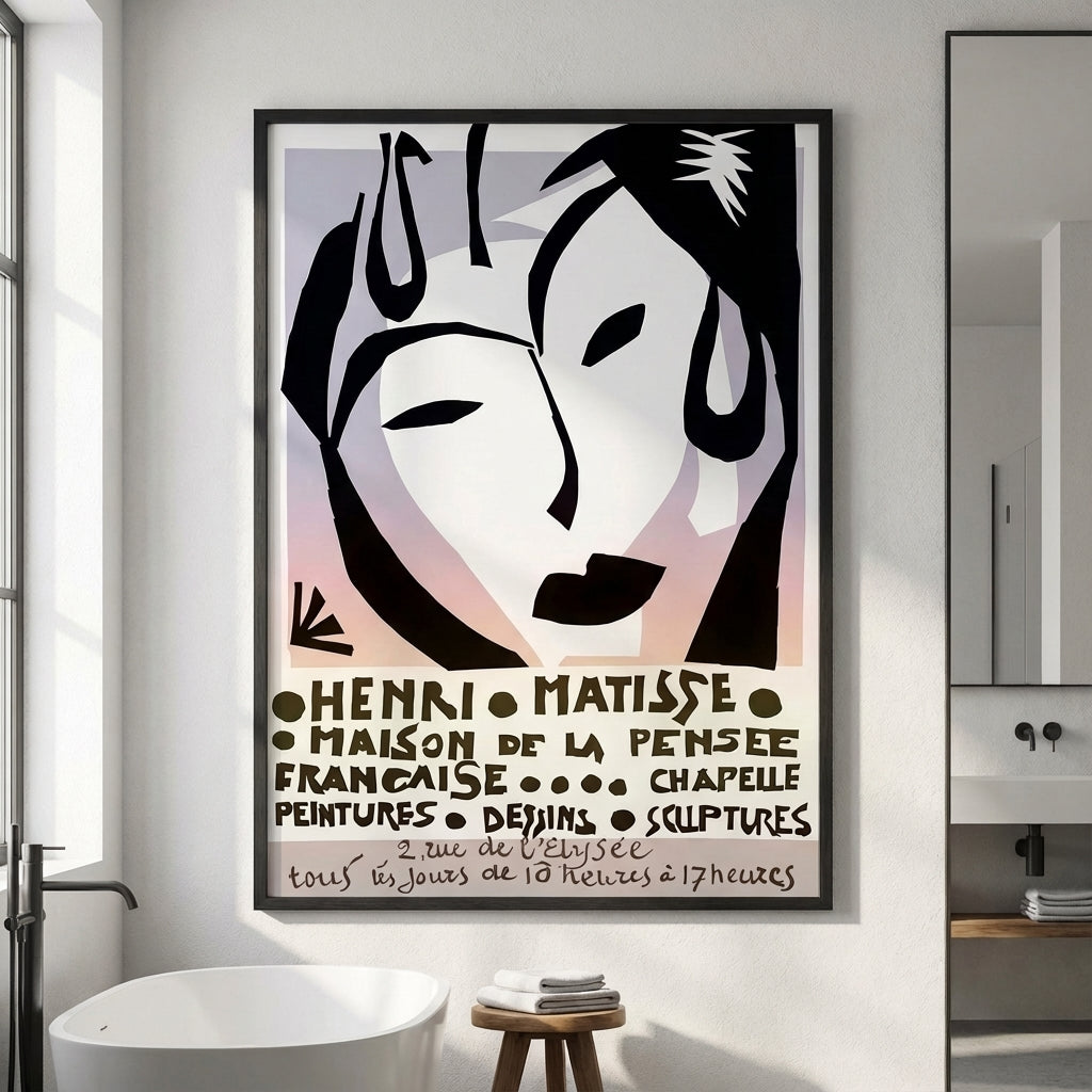 Celebrate modernist artistry with this striking exhibition poster featuring Henri Matisse's iconic abstract portraiture. The composition merges bold geometric forms with expressive facial features, showcasing the artist's revolutionary approach to colour and shape. A masterpiece of 20th-century graphic design, this vintage poster captures the essence of Matisse's groundbreaking exhibition. Perfect for art enthusiasts, collectors, and those seeking to infuse their space with cultural sophistication and creative inspiration. An authentic tribute to one of art history's most influential figures.