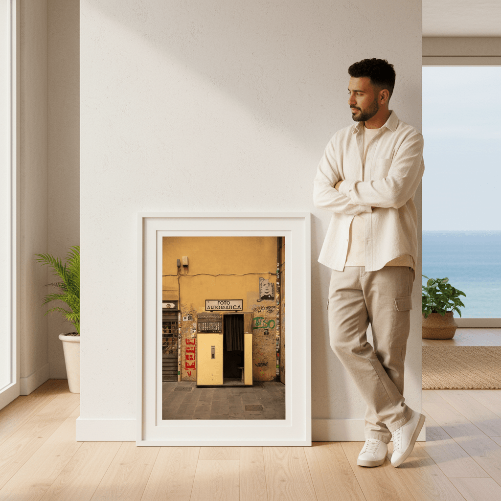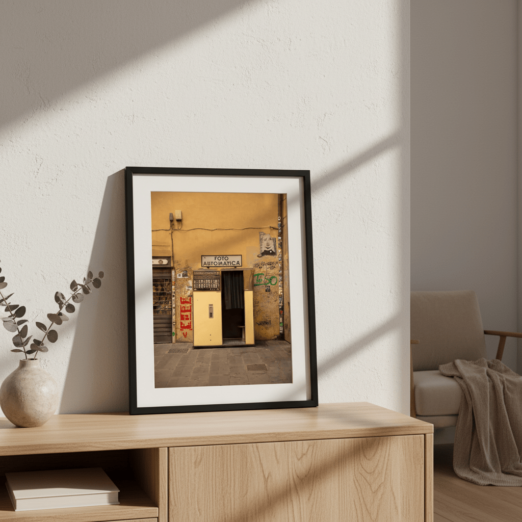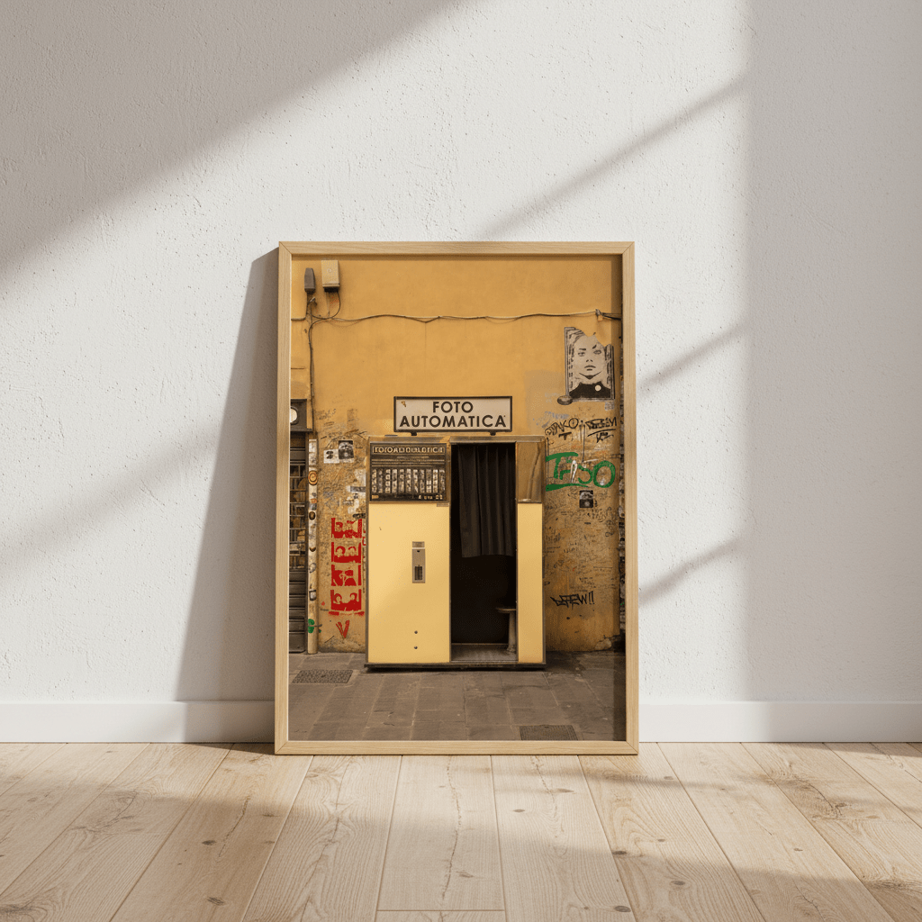 Capture the nostalgic charm of urban street culture with this striking photograph by Colton Jones. The image showcases a vintage photo booth emblazoned with the iconic "FOTO AUTOMATICA" sign, set against a vibrant yellow wall adorned with authentic graffiti. Perfect for adding character and artistic flair to contemporary interiors, this piece celebrates the intersection of retro design and modern street art. An ideal choice for collectors who appreciate documentary-style photography and urban aesthetics.
