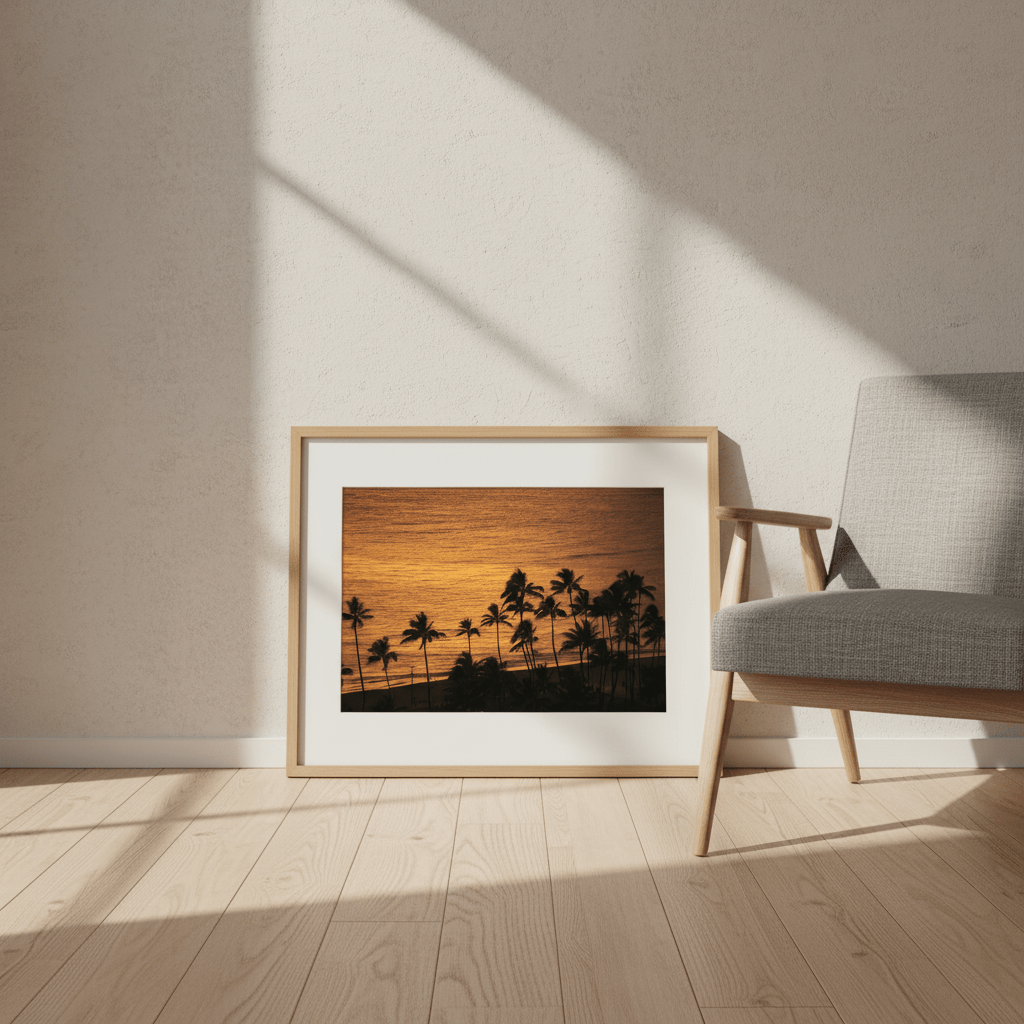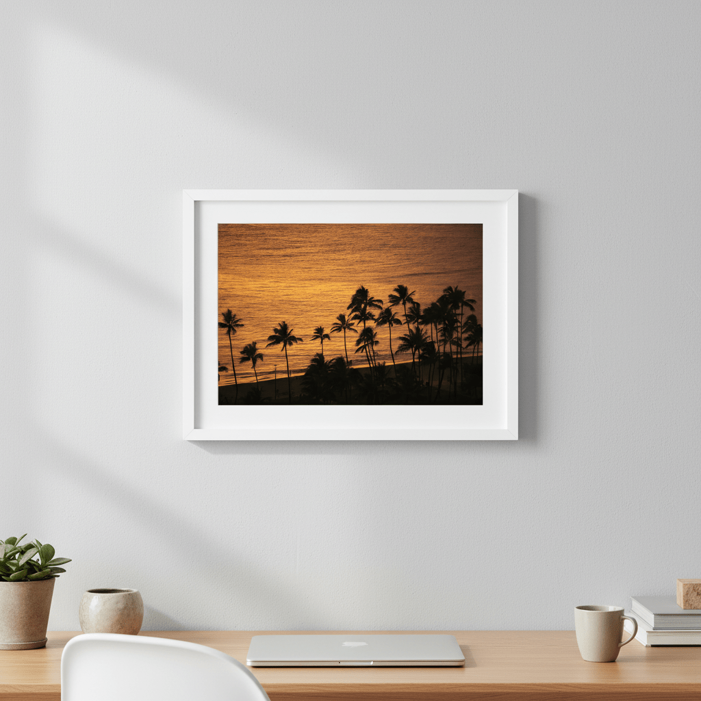 Experience the serene beauty of tropical landscapes with this evocative photograph by Colton Jones. Golden captures the ethereal moment where silhouetted palm trees frame a luminous sunset reflected across tranquil waters. The interplay of warm golden tones and deep shadows creates a contemplative atmosphere, making this piece ideal for spaces seeking coastal elegance and natural tranquility. A sophisticated choice for those who appreciate landscape photography that balances drama with peaceful sophistication.