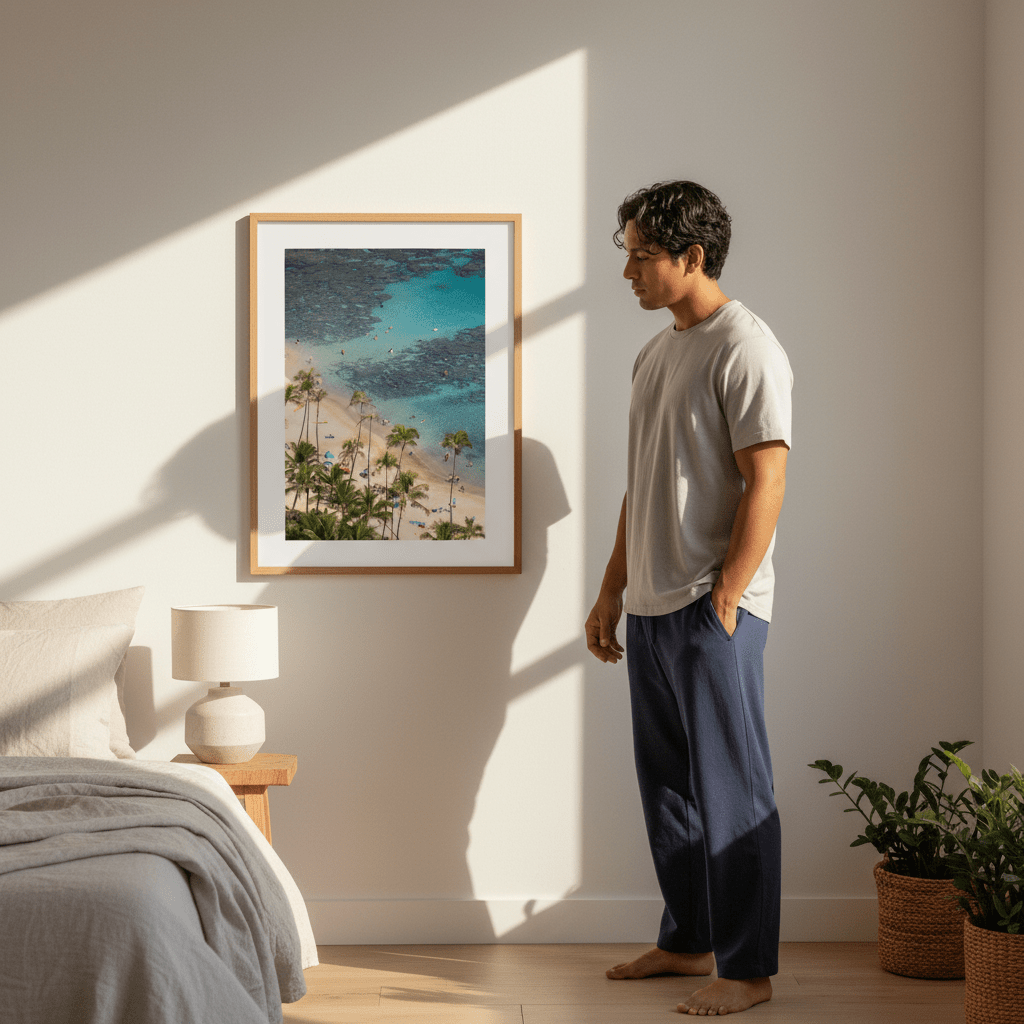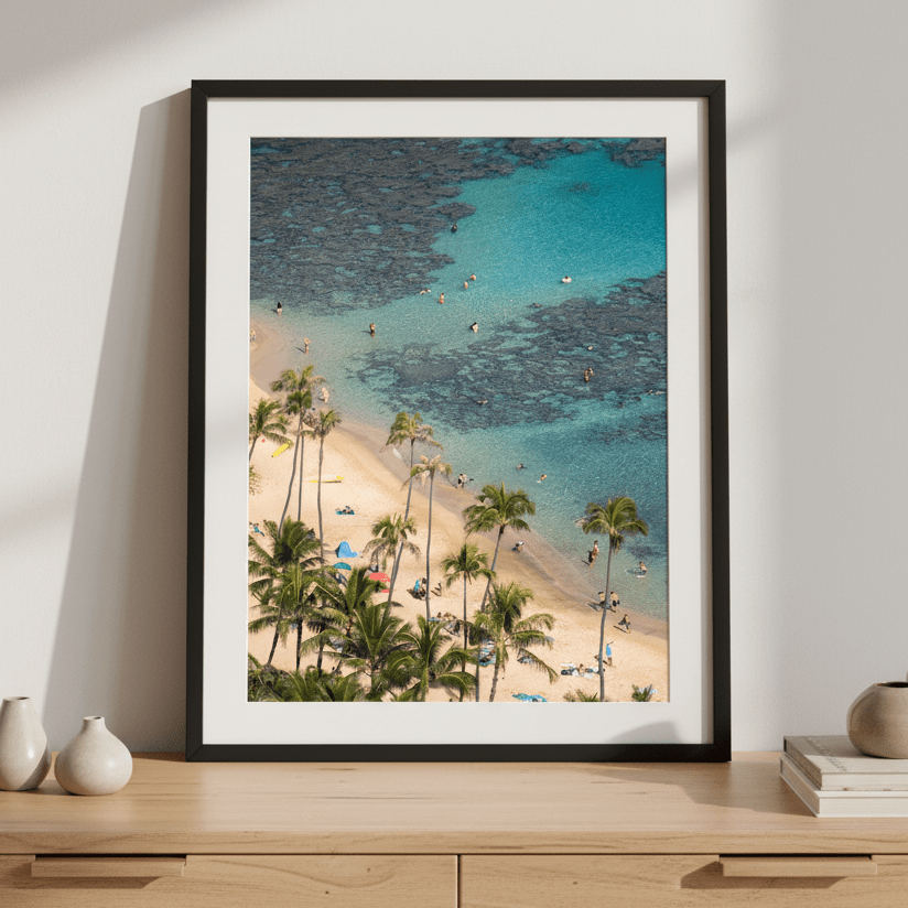 Hanauma Bay by Colton Jones captures the serene beauty of Hawaii's most iconic coastal destination. This stunning photograph showcases a picturesque beach scene where swaying palm trees frame crystal-clear waters teeming with swimmers and sunbathers. The composition masterfully balances the lush tropical landscape with the vibrant energy of beachgoers, creating a sense of paradise and relaxation. Perfect for bringing warmth and wanderlust to any space, this artwork transports viewers to one of the world's most cherished tropical havens. An ideal choice for those seeking to infuse their home or office with the essence of island living and natural beauty.