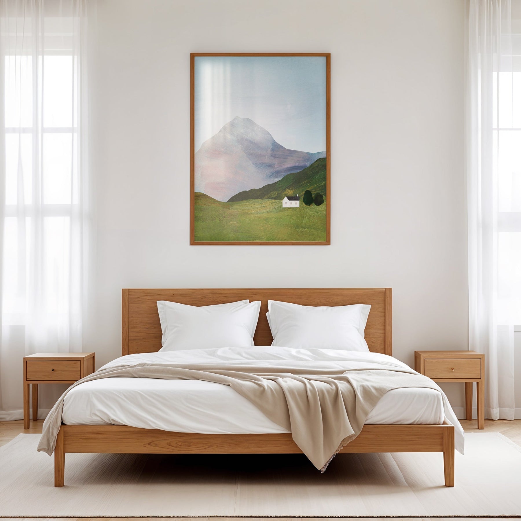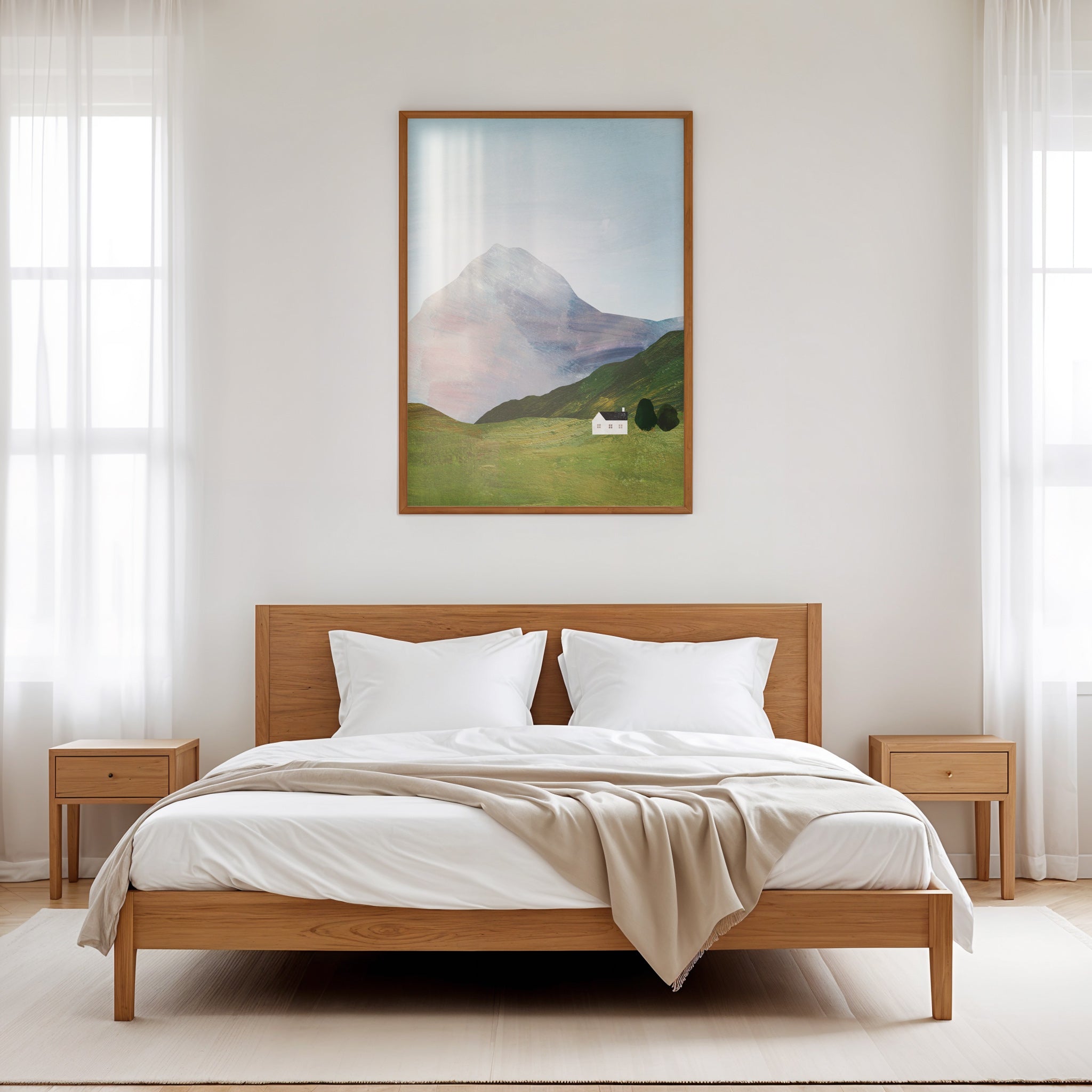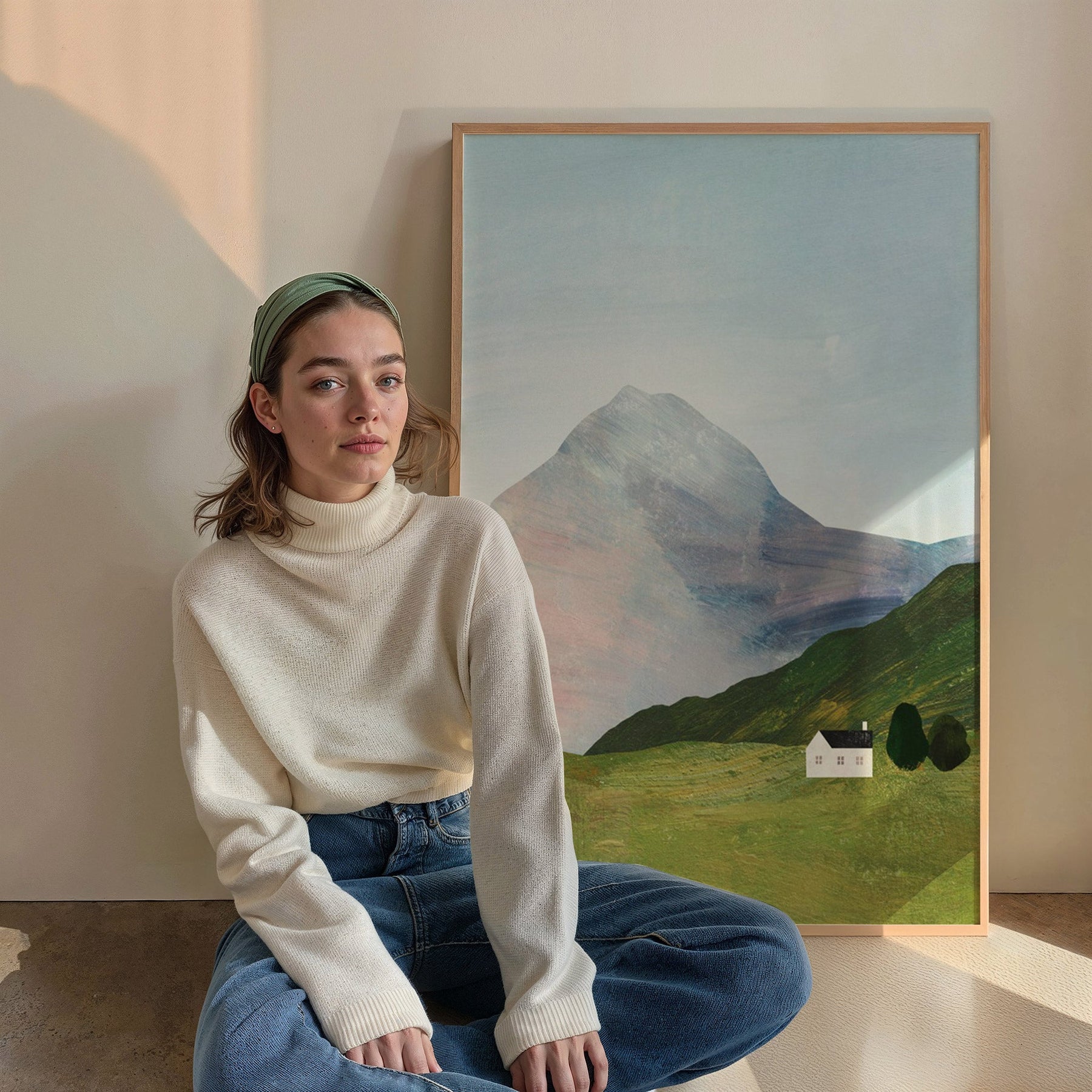 Experience the serene beauty of remote landscapes with "Highlands" by Henry Rivers. This sophisticated artwork features a solitary cottage set against rolling verdant hills, anchored by a majestic mountain rendered in ethereal blues and soft pinks. The painterly technique creates atmospheric depth, with layered brushwork that captures the misty quality of distant peaks beneath a luminous sky. An exceptional choice for those seeking contemplative, landscape-focused art that evokes tranquility and isolation in nature's grandeur.