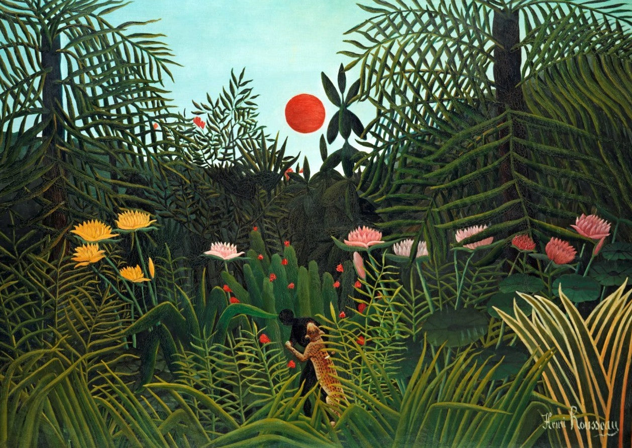 Immerse yourself in the dreamlike atmosphere of this striking forest composition, where a solitary figure emerges amidst verdant foliage and blooming flora. The commanding crimson sun dominates the sky, casting an otherworldly glow across the densely layered landscape. This modernist interpretation of nature captures the tension between civilization and wilderness through bold geometric forms and vibrant colour contrasts. The interplay of natural elements—towering vegetation, delicate flowers, and the luminous orb—creates a composition that transcends mere representation, inviting contemplation of humanity's place within the natural world. A captivating statement piece for those who appreciate avant-garde artistic vision.