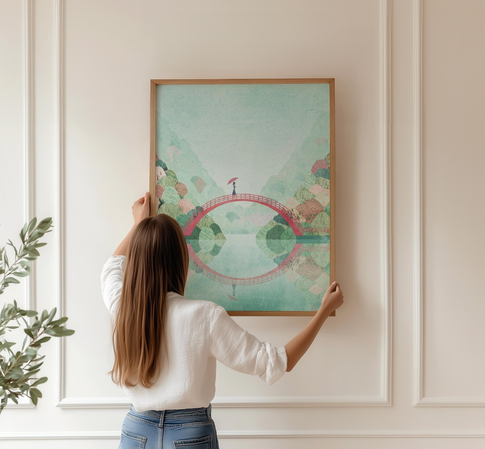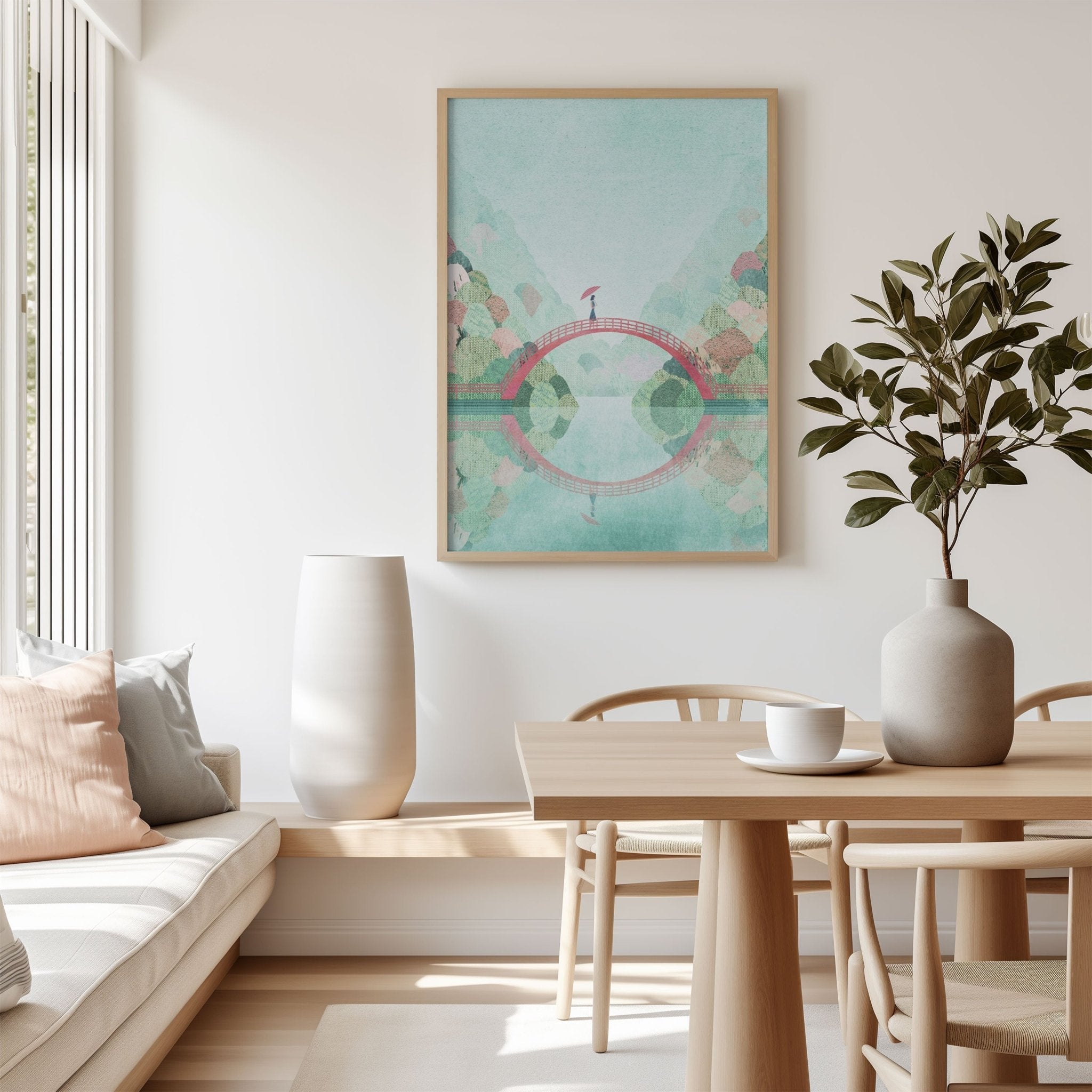 Japan in Autumn by Henry Rivers evokes the serene beauty of traditional Japanese landscapes through a masterfully rendered scene. A crimson bridge arcs gracefully over reflective waters, its bold hue creating striking contrast against the soft palette of surrounding foliage and sky. The composition demonstrates Rivers' sophisticated understanding of Eastern aesthetic principles, balancing architectural form with natural elements in harmonious proportion. Verdant trees frame the composition while the luminous light blue background establishes an atmosphere of peaceful contemplation. This artwork captures the essence of autumn's transitional beauty, making it an exceptional choice for those seeking to introduce cultural refinement and meditative calm into their interior spaces.