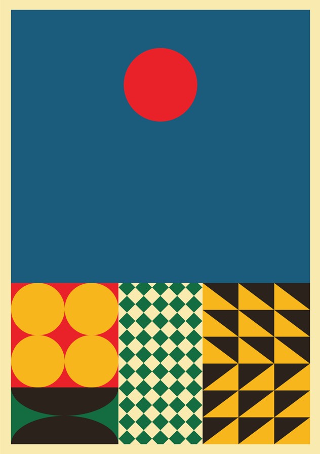 Modular Sunrise features a striking geometric composition set against a vibrant blue backdrop. The design combines a bold red circle as its focal point, complemented by cheerful yellow circular accents and a crisp green and white checkered section. Sharp black and yellow triangular elements add dynamic movement and visual interest. This contemporary pattern merges multiple geometric shapes and colour blocking for a modern aesthetic that works beautifully as wall art, bringing energy and sophistication to any interior space.