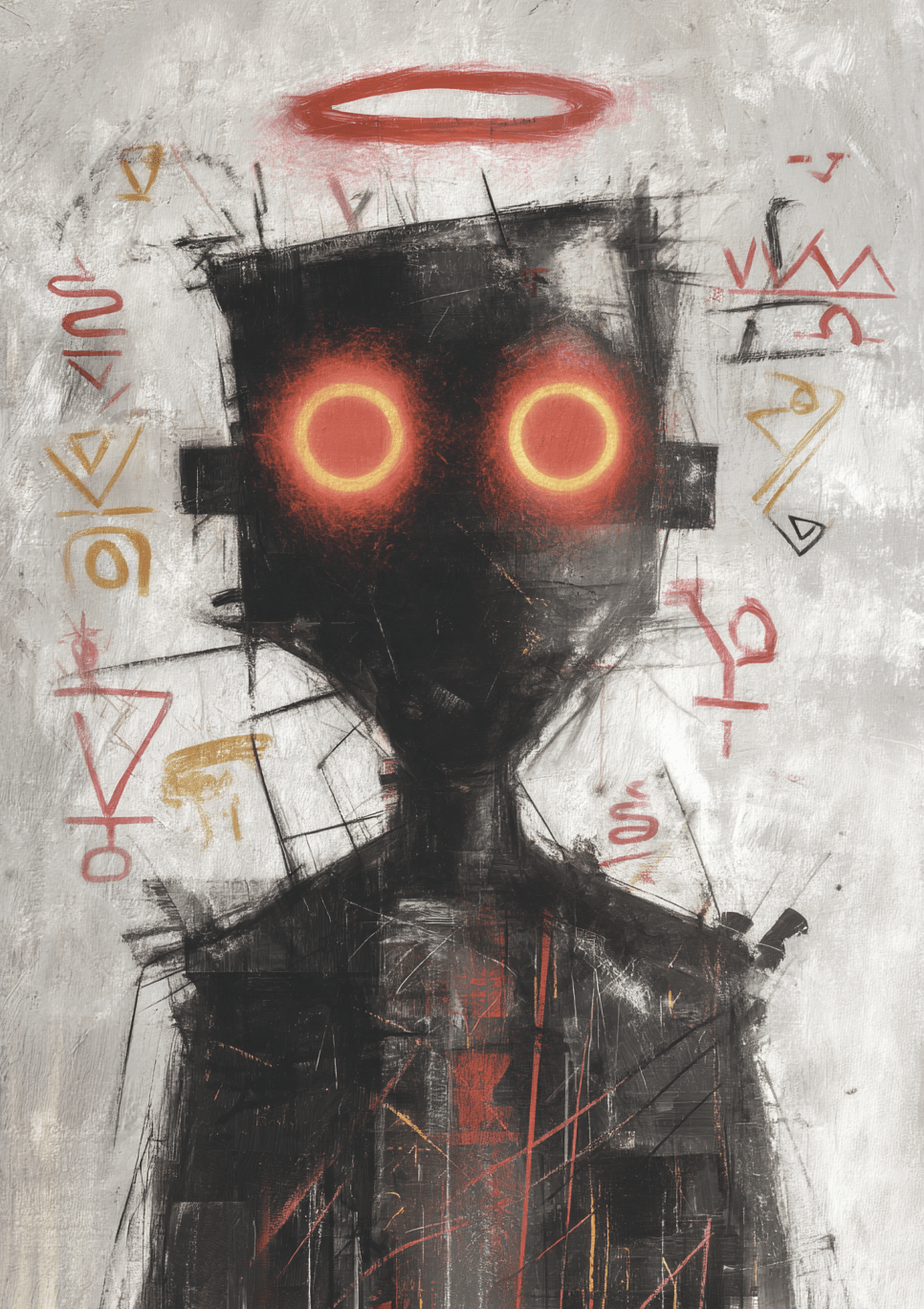 Milo Vex paints in fragments and frequencies cryptic symbols etched across the surface suggest messages from another realm, while the halo glows like a flicker of faith in a fractured system.