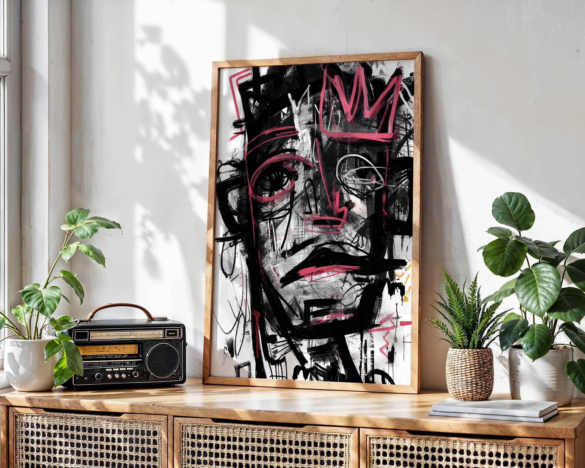 Commanding, chaotic, and deeply human - Ruler of Noise is a striking exploration of power in disorder. Milo Vex blends bold black strokes with raw pink linework, capturing the spirit of a crowned figure caught in the tension between thought and sound.