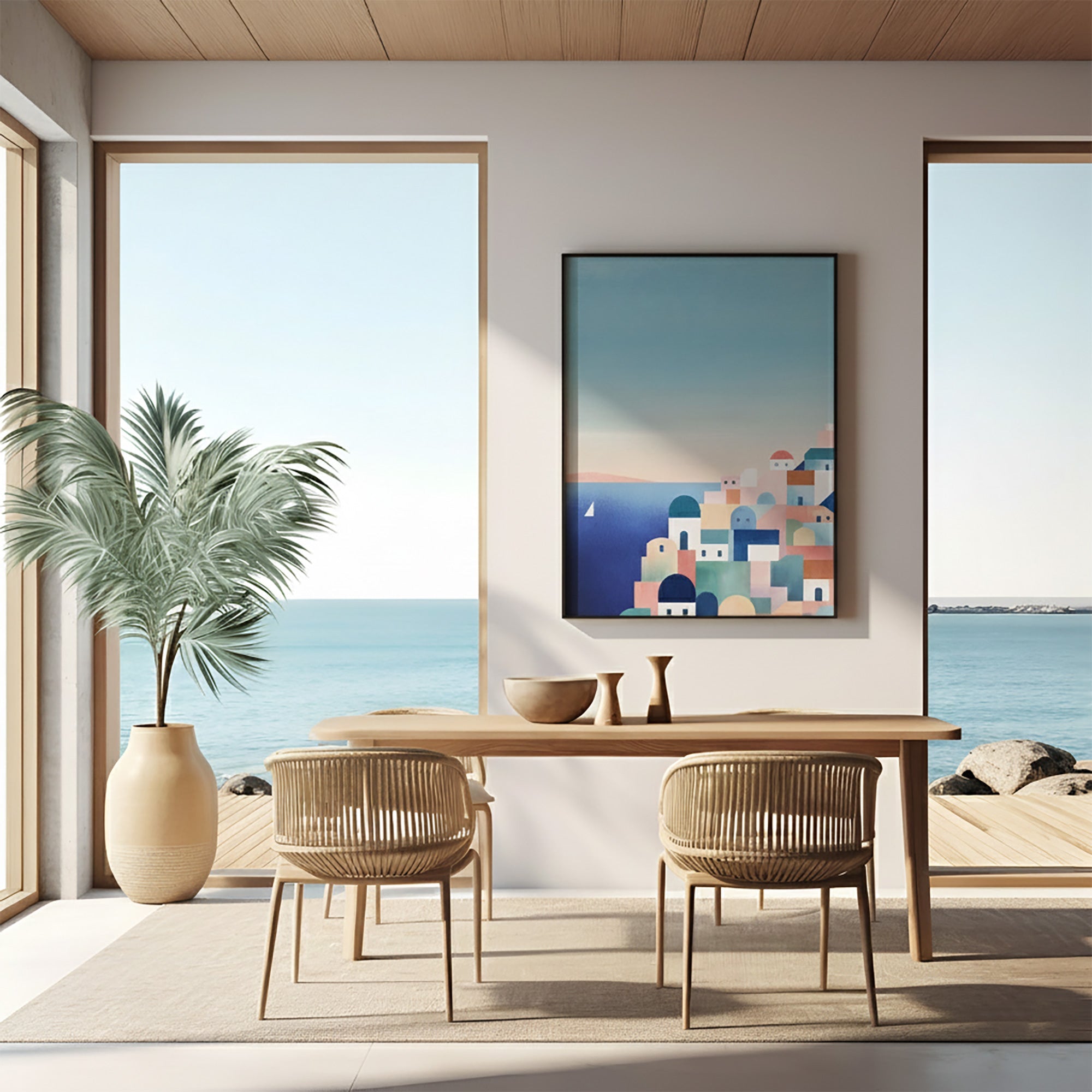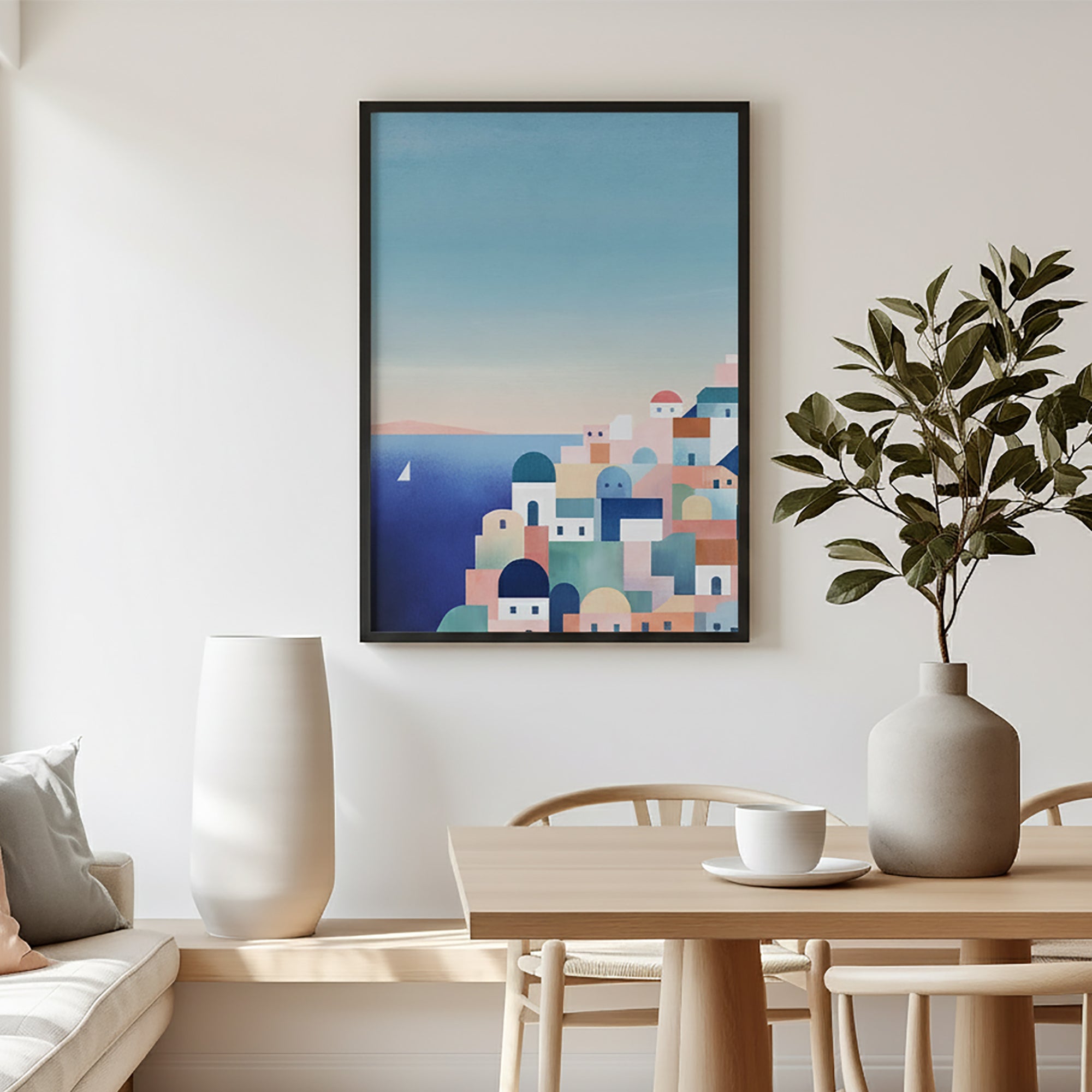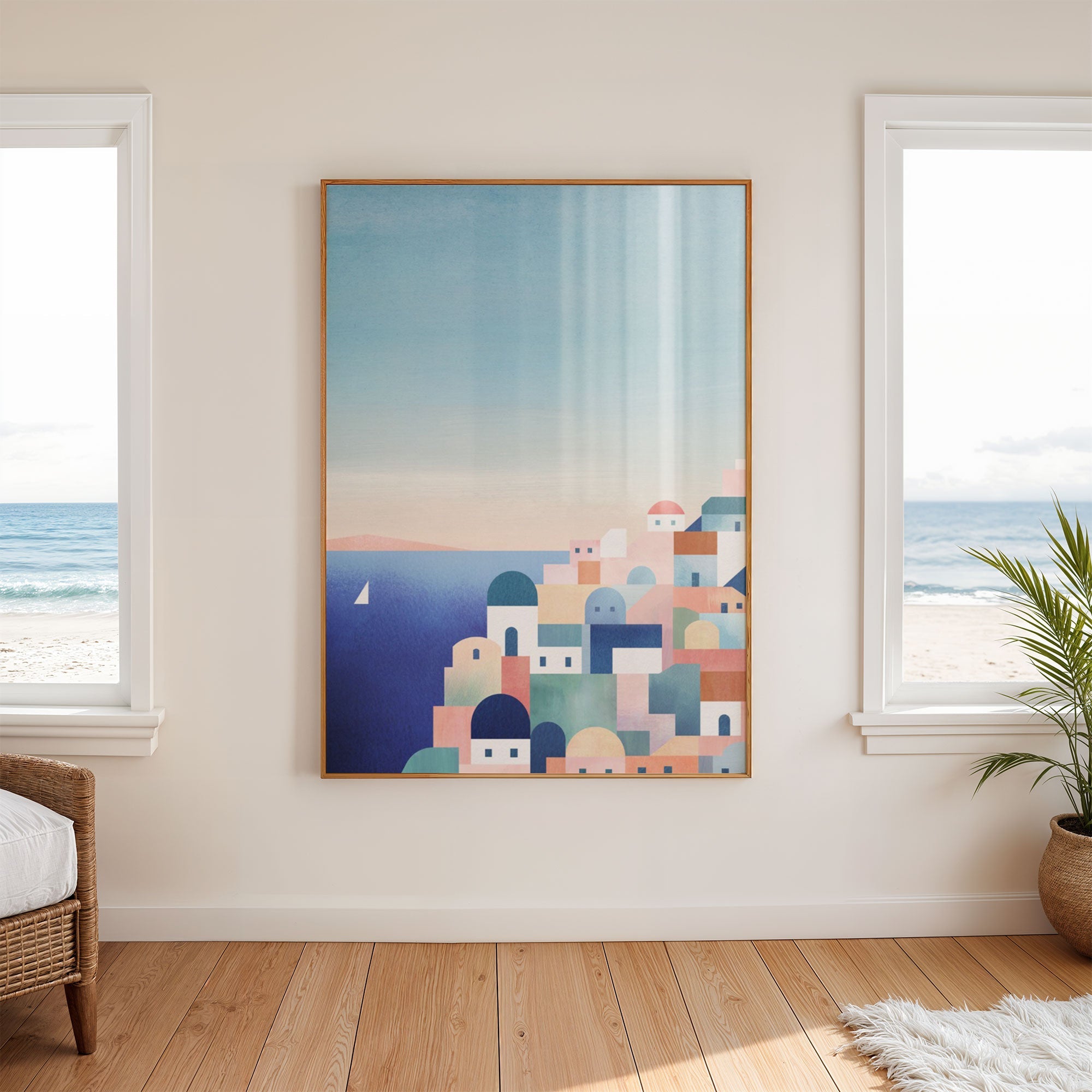 Santorini by Henry Rivers reimagines the iconic Greek island through a contemporary geometric lens. This striking artwork transforms the celebrated coastal landscape into a vibrant composition of angular buildings in rich, saturated hues that cascade toward the sea. Rivers employs precise geometric forms to distil the essence of Santorini's architectural character while infusing the piece with dynamic colour and modern sensibility. The interplay between structured shapes and the fluid seascape creates visual tension that rewards sustained viewing. An ideal selection for collectors who appreciate how traditional subjects can be elevated through innovative artistic interpretation and bold chromatic choices.