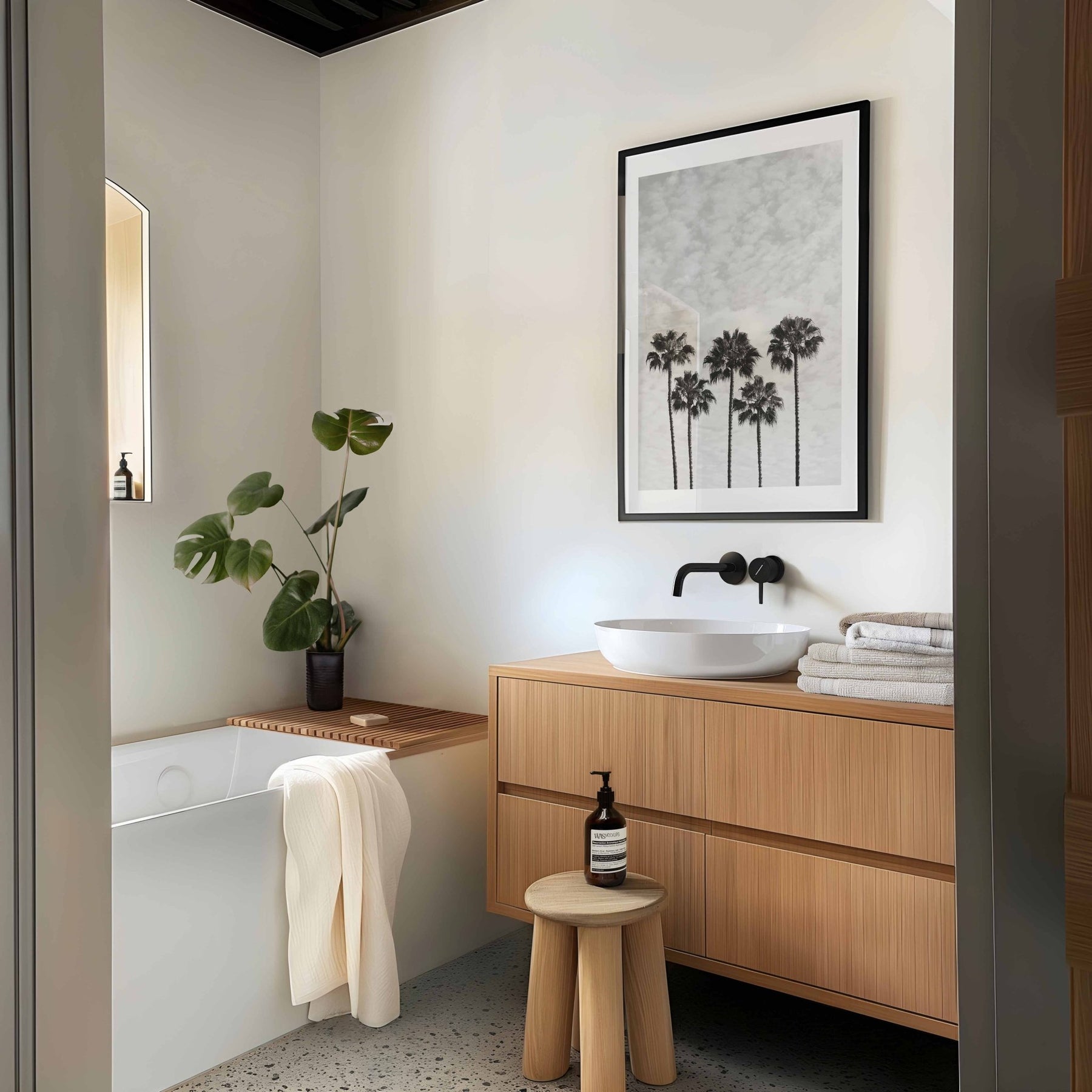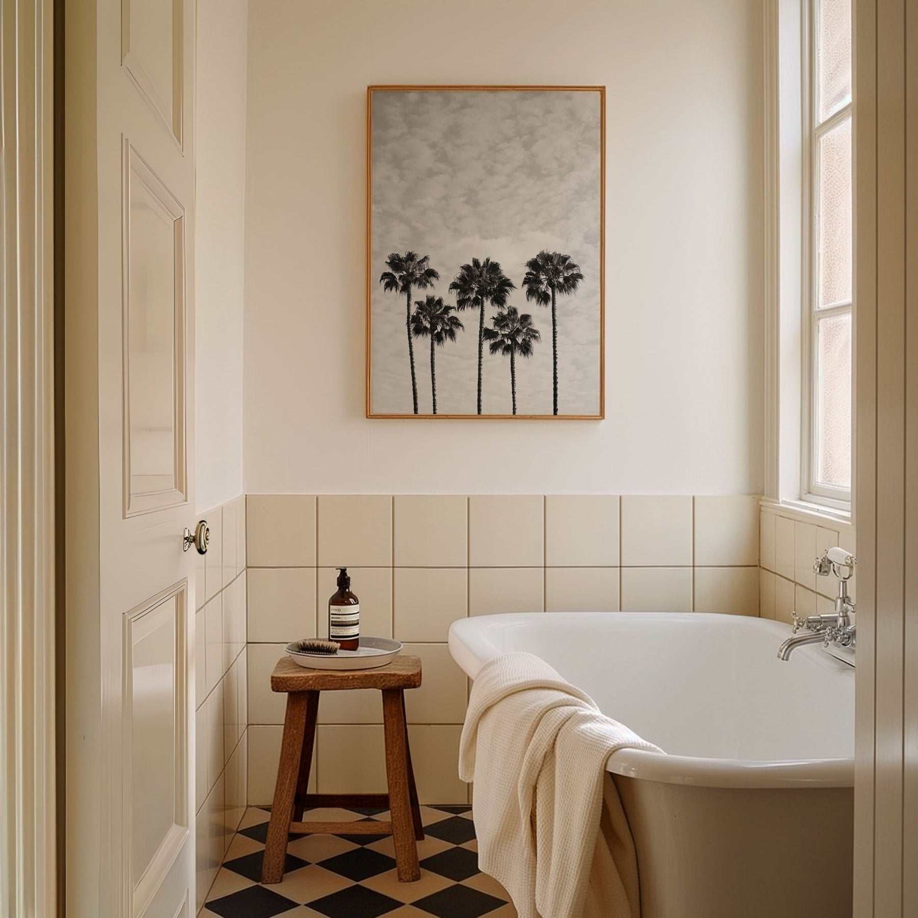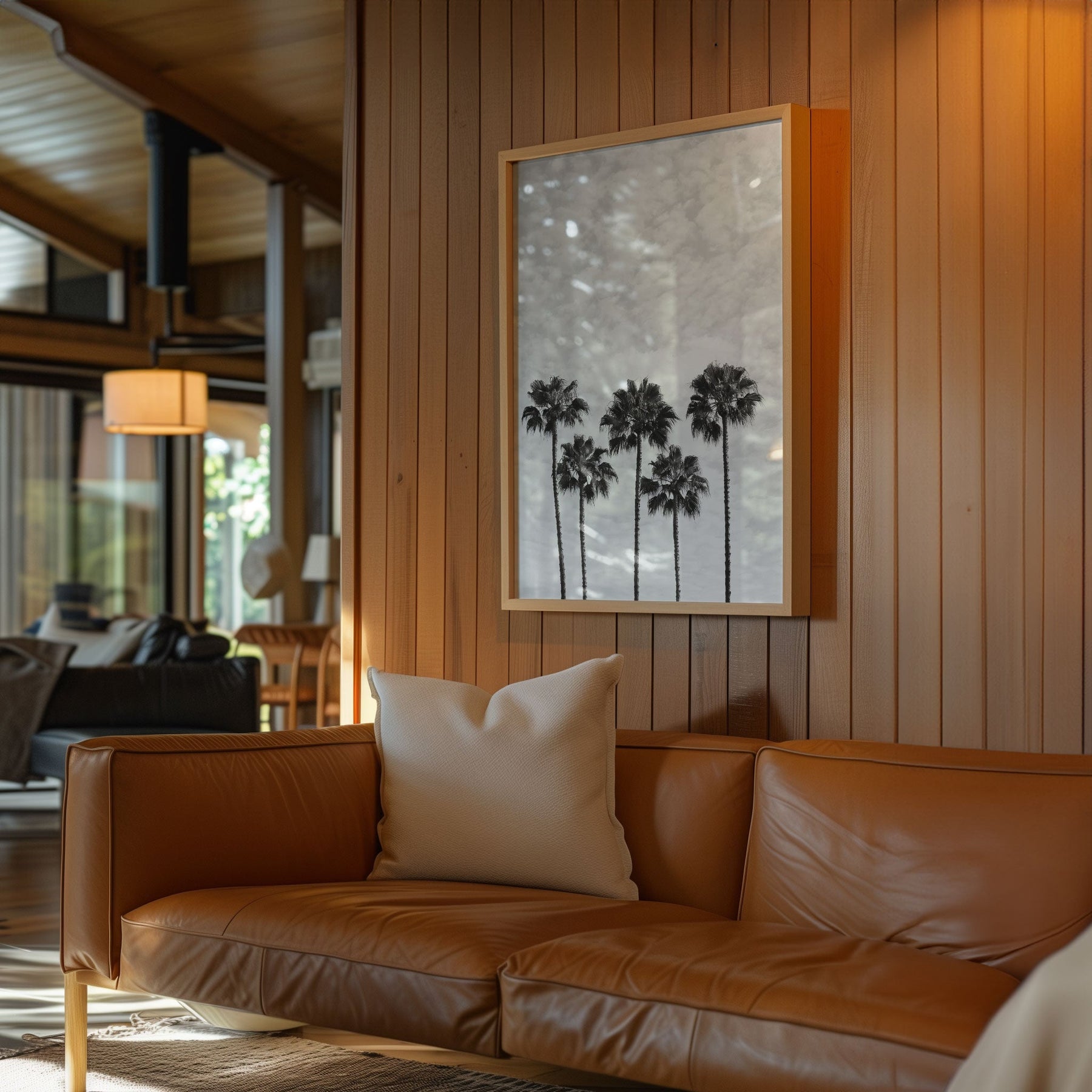 Capture the tranquil beauty of coastal life with this sophisticated black and white photograph of serene palm trees by Julian Van Bausch. Its timeless monochrome palette enhances the natural elegance of the scene, making it a refined addition to any space seeking calm and understated style.