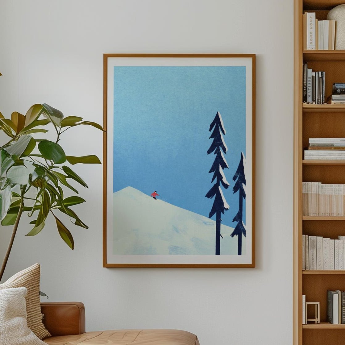 Ski Day by Henry Rivers distils the exhilaration of alpine adventure into a compelling visual statement. The composition centres on a dynamic skier navigating pristine snow-covered slopes, framed by two sentinel trees that anchor the composition with vertical strength. Set against a crystalline blue sky, Rivers employs bold colour contrasts and simplified forms to convey both movement and serenity. The artist's distinctive approach transforms a winter sports scene into something more contemplative, exploring themes of freedom, solitude, and humanity's relationship with untamed landscapes. A sophisticated addition to any collection, particularly suited to those who appreciate modern art that balances narrative clarity with aesthetic refinement.