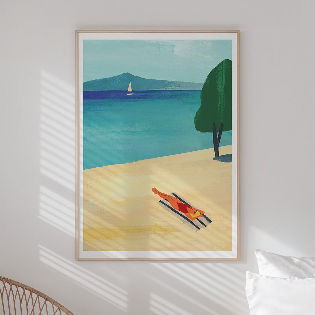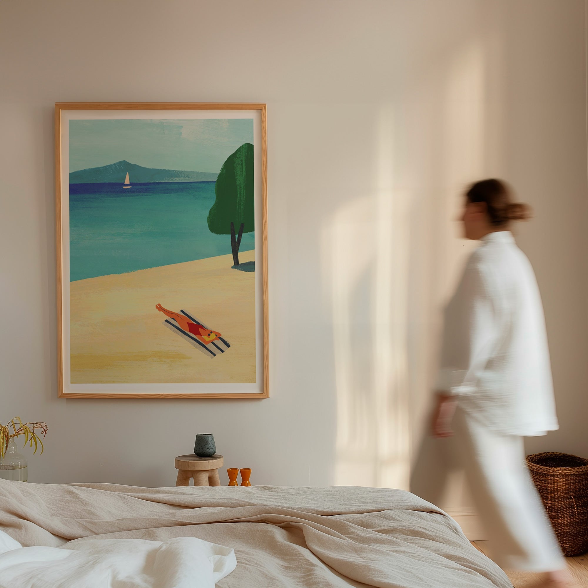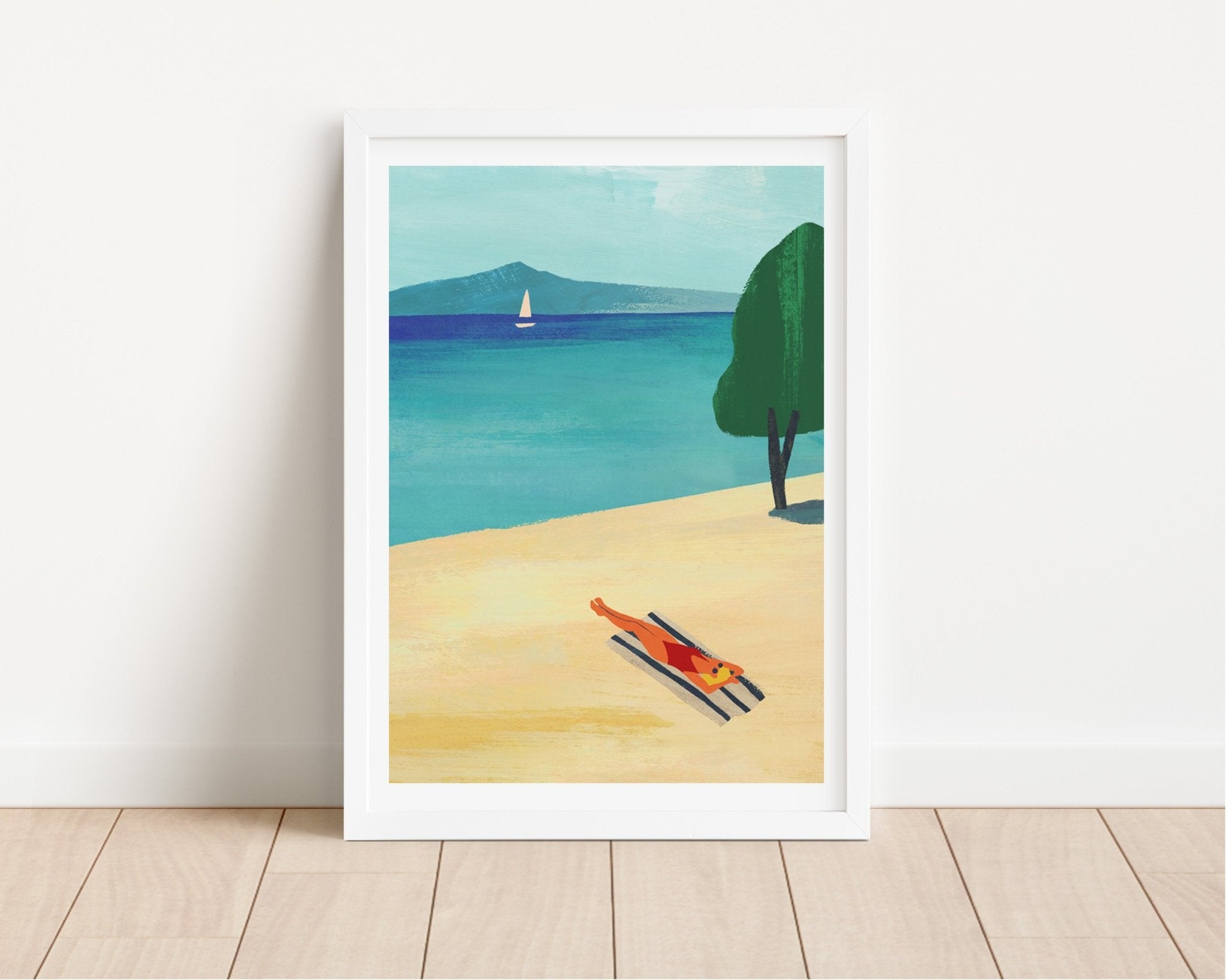 Sunbathing by Henry Rivers captures the languid essence of coastal leisure through a deceptively simple yet layered composition. A recumbent figure relaxes upon a towel, anchoring the foreground whilst a solitary tree provides organic counterpoint to the scene's geometry. Beyond, a distant sailboat punctuates the horizon, suggesting narrative possibility and the allure of adventure beyond the immediate moment. Rivers' restrained colour palette and deliberate spatial arrangement transform what might be a conventional beach scene into a meditation on stillness, aspiration, and the psychological distance between repose and wanderlust. The work demonstrates the artist's sophisticated understanding of compositional balance and his ability to imbue quotidian subjects with contemplative depth. An excellent acquisition for those seeking contemporary art that rewards sustained viewing.