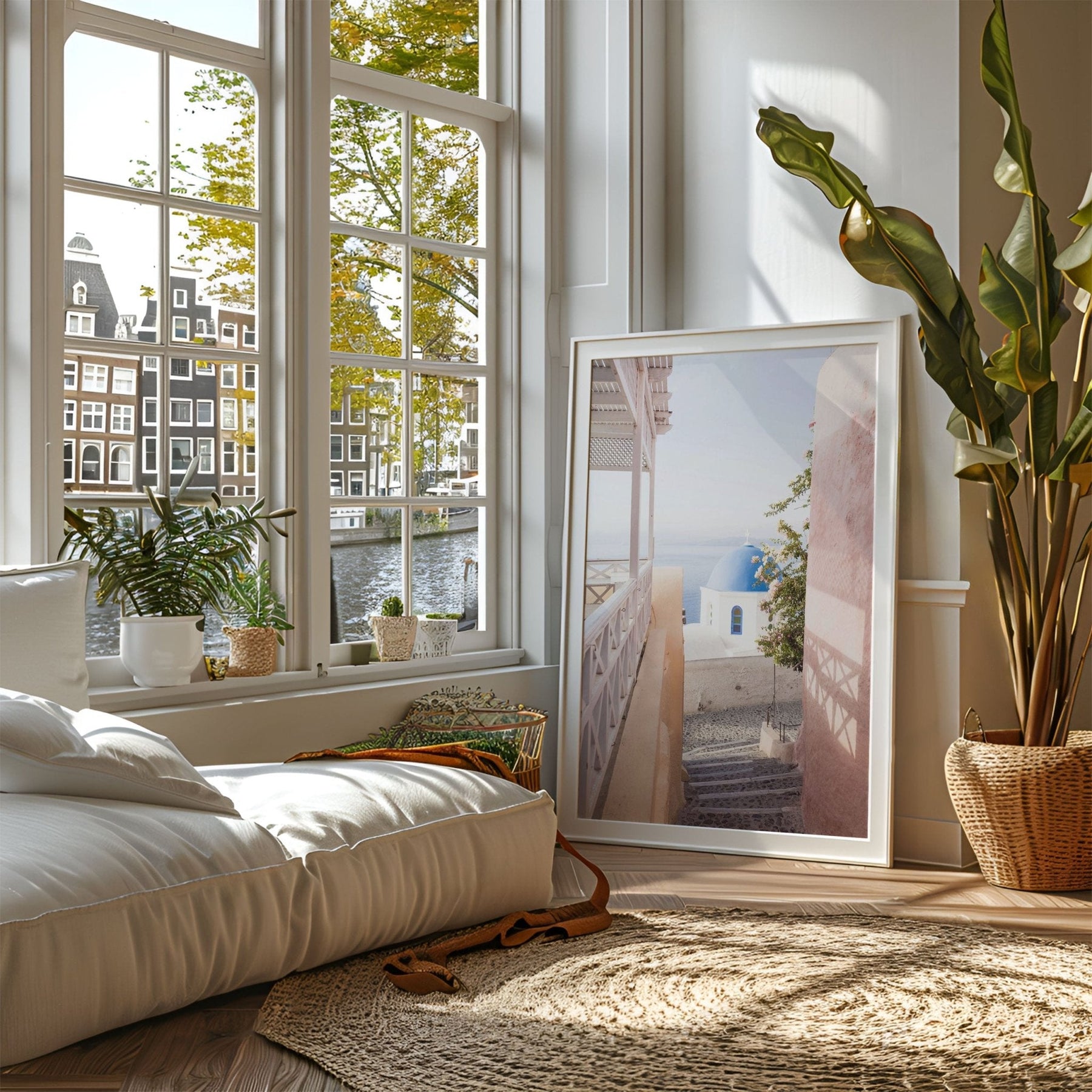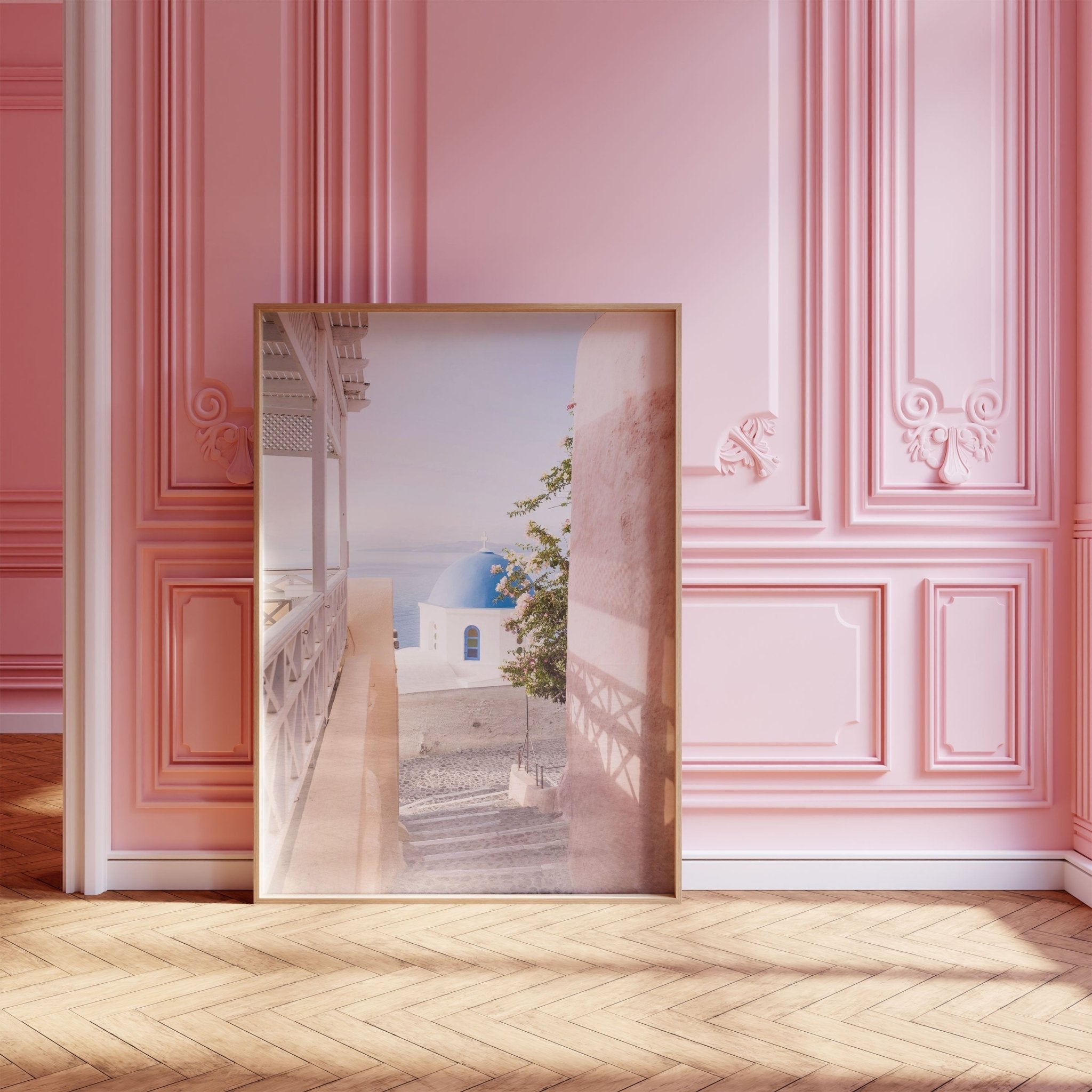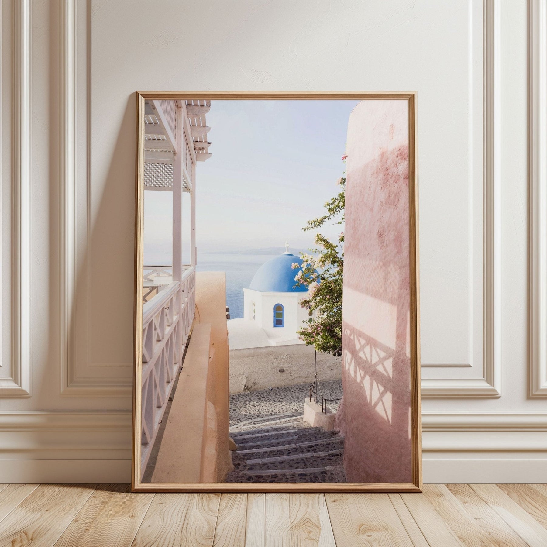 Enhance your living space with a touch of Greek charm by adding this stunning framed photograph of a blue door and flowers to your wall decor. Capturing the essence of Greek sunshine in Santorini Island, this wall art piece will bring a sense of tranquility and beauty to any room in your home.