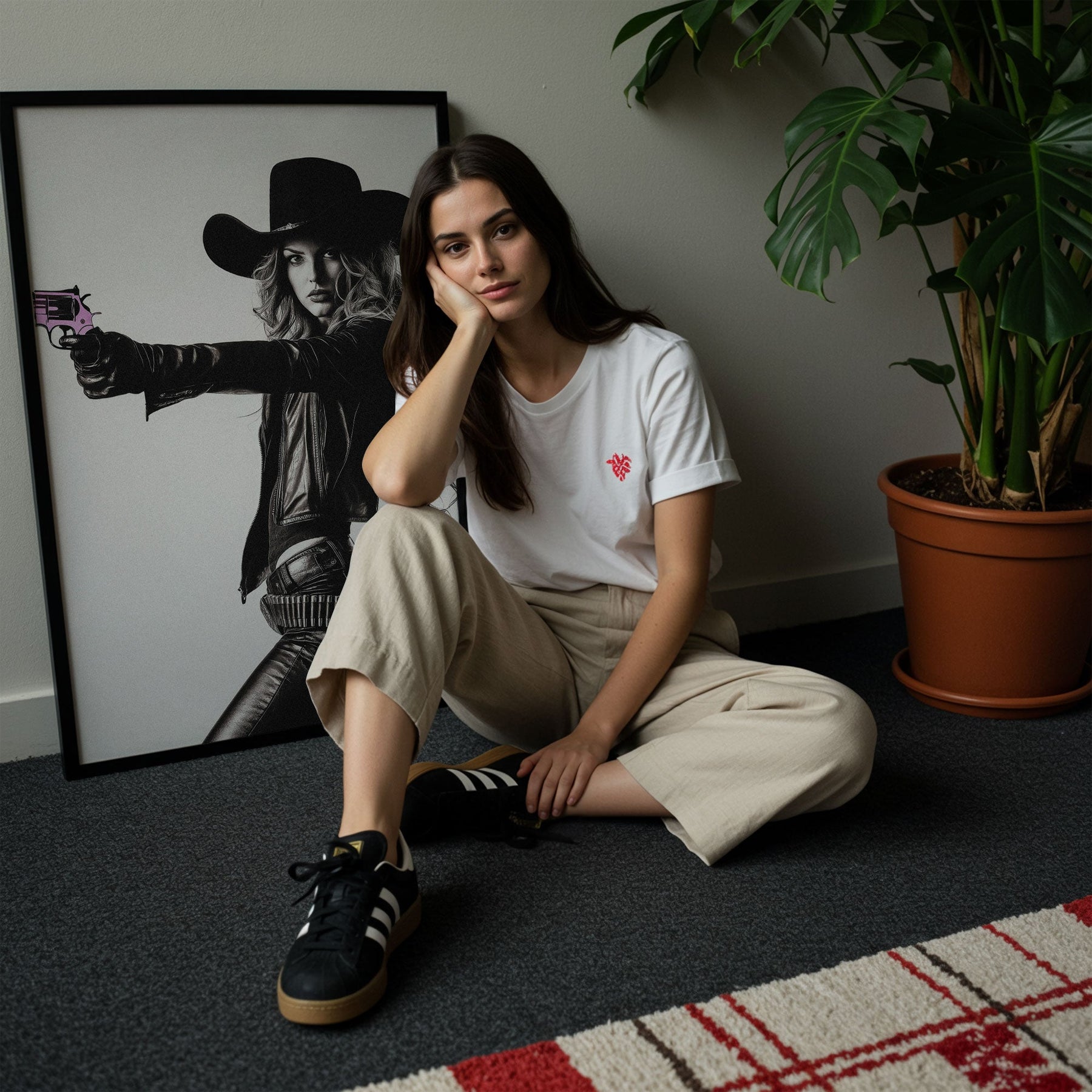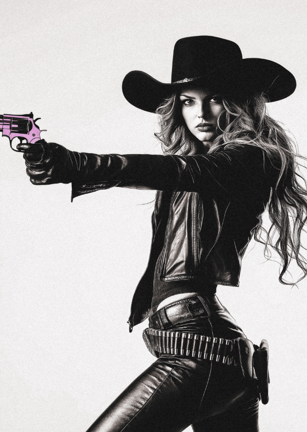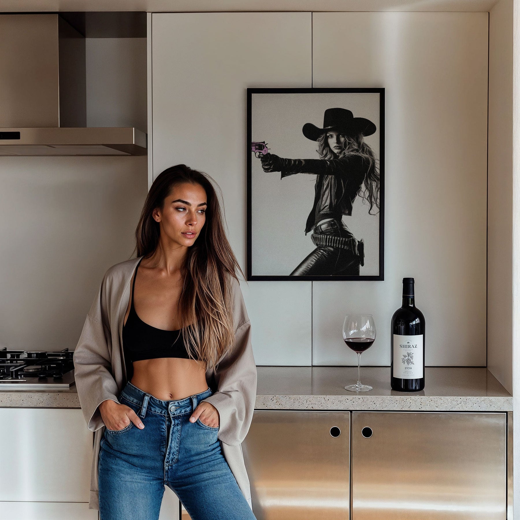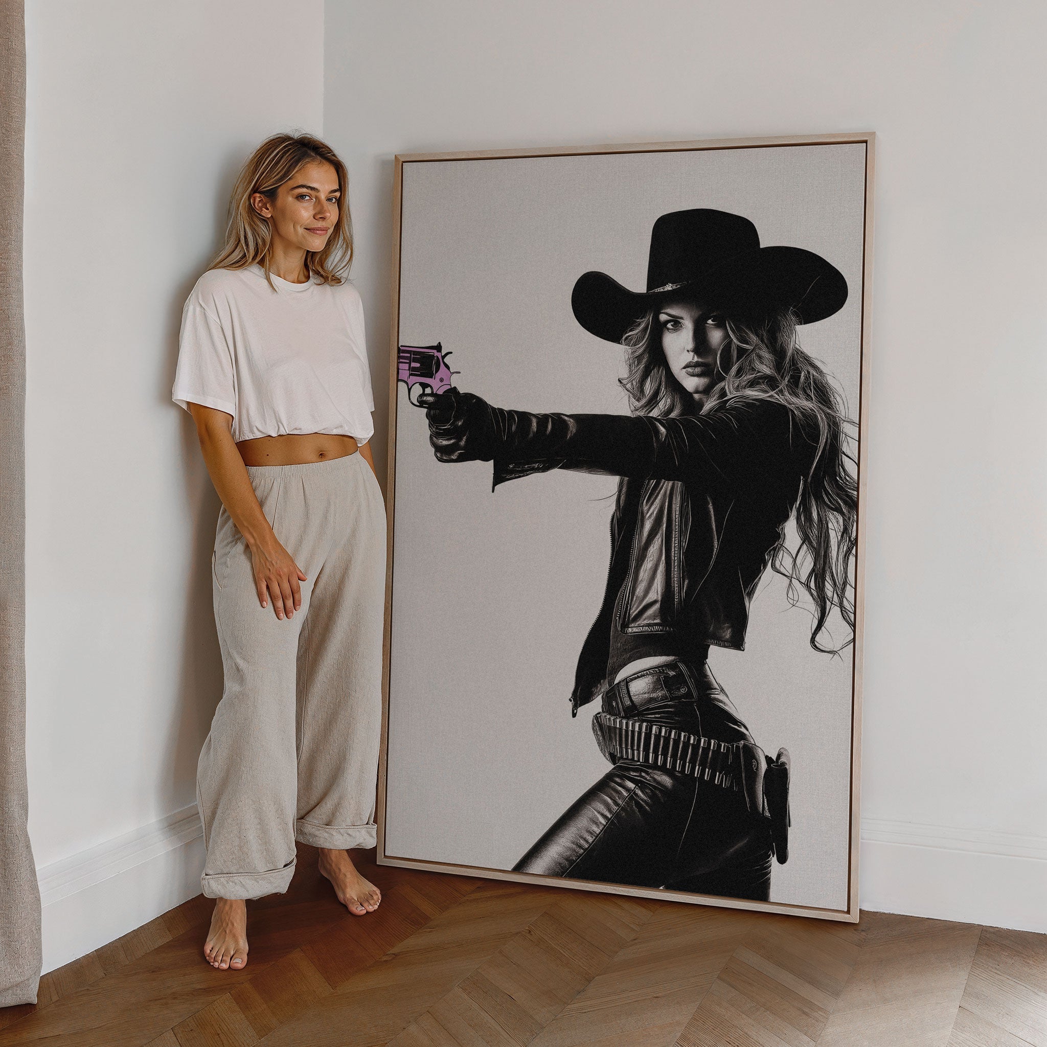 Capture the fierce spirit of the wild west with "Trigger Femme," an exclusive print that blends cowgirl grit and outlaw edge. Featuring a bold fashion photography moment where a pink gun is pulled in a daring stand-off, this striking image commands attention and celebrates fearless femininity. Perfect for those who embrace rebellion with style.