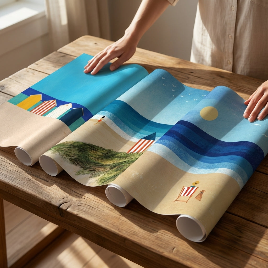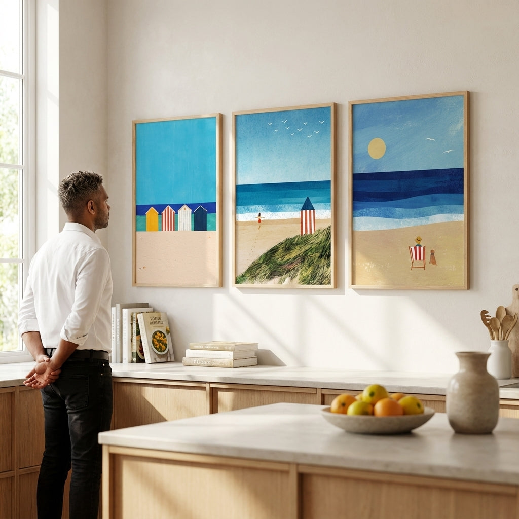 Bring coastal charm into your home with this captivating trio of beach-inspired artworks. This curated set features three distinct illustrations celebrating seaside moments: vibrant beach huts nestled on golden sand beneath a brilliant sky, a charming scene of a beachgoer with their canine companion enjoying the sun, and a figure strolling toward the shoreline. Each piece captures the relaxed essence of coastal living through bold colours and dynamic composition. Perfect for creating a cohesive gallery wall or refreshing individual spaces, these artworks by Henry Rivers infuse any room with warmth, movement, and the timeless appeal of beach culture. Ideal for those seeking to evoke holiday nostalgia or establish a breezy, contemporary aesthetic.