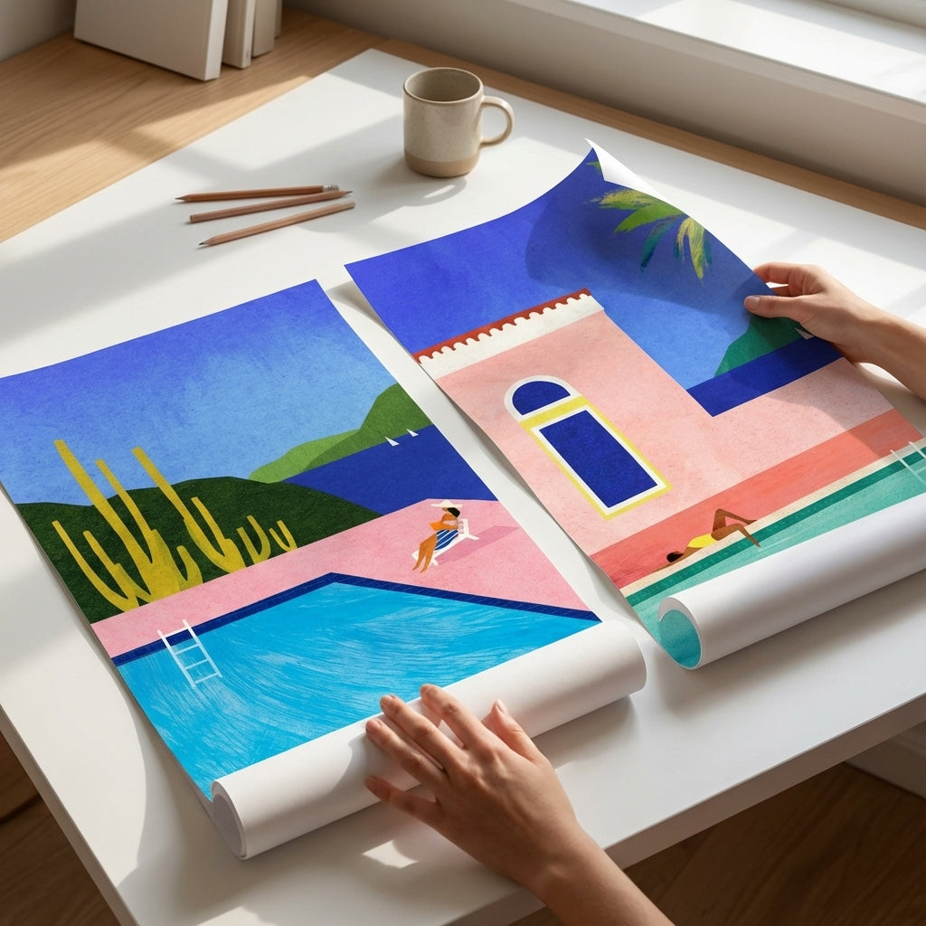 Elevate your space with this curated pair of artworks by Henry Rivers, capturing the essence of leisurely coastal living. The first piece showcases a serene pink villa nestled beside a sparkling pool, evoking Mediterranean charm and relaxation. The companion illustration presents a dreamy poolside scene complete with a cactus, lounge chair, and sailboats dotting a hillside vista. Together, these prints create a cohesive narrative of sophisticated leisure, perfect for transforming any room into a tranquil retreat that celebrates the art of living well.