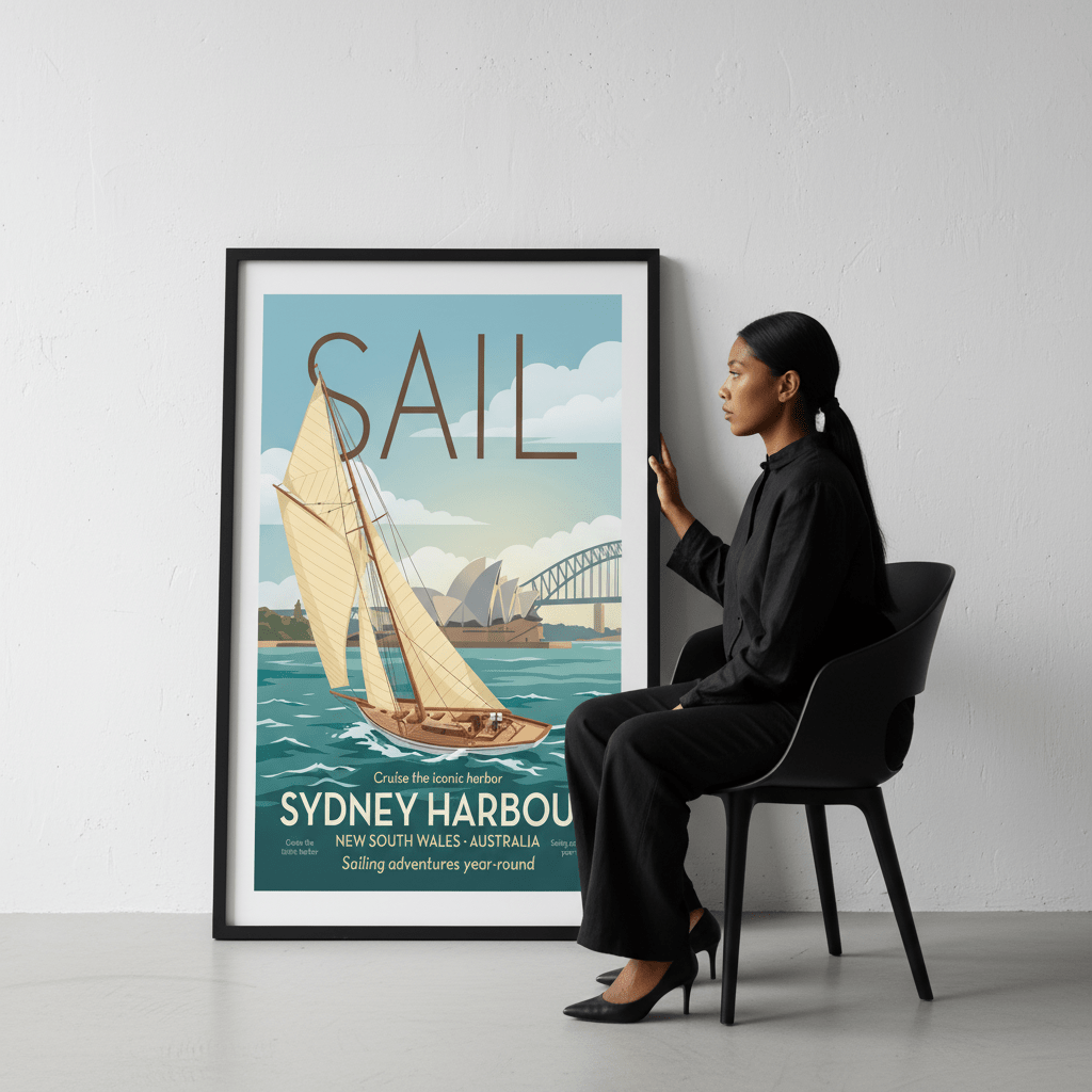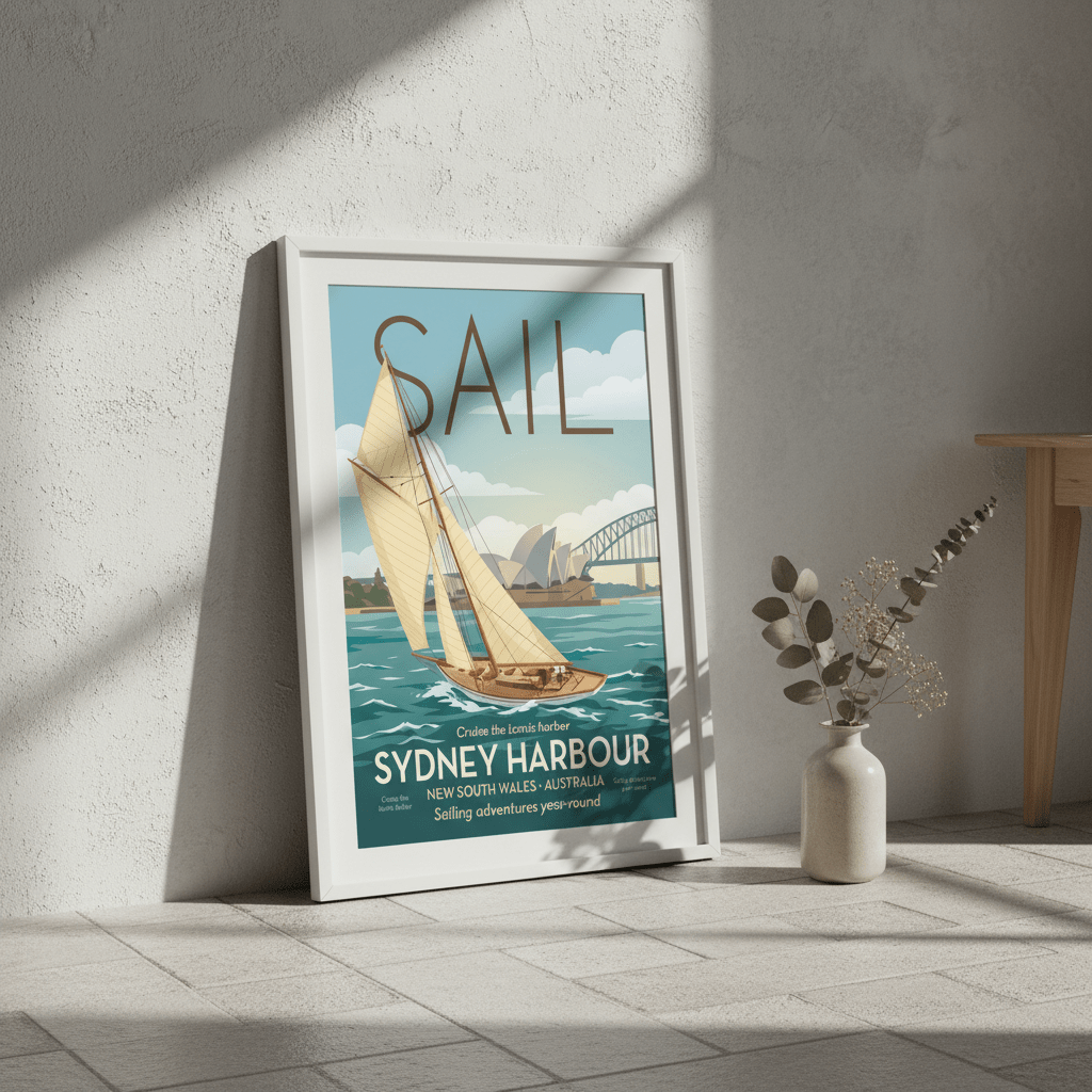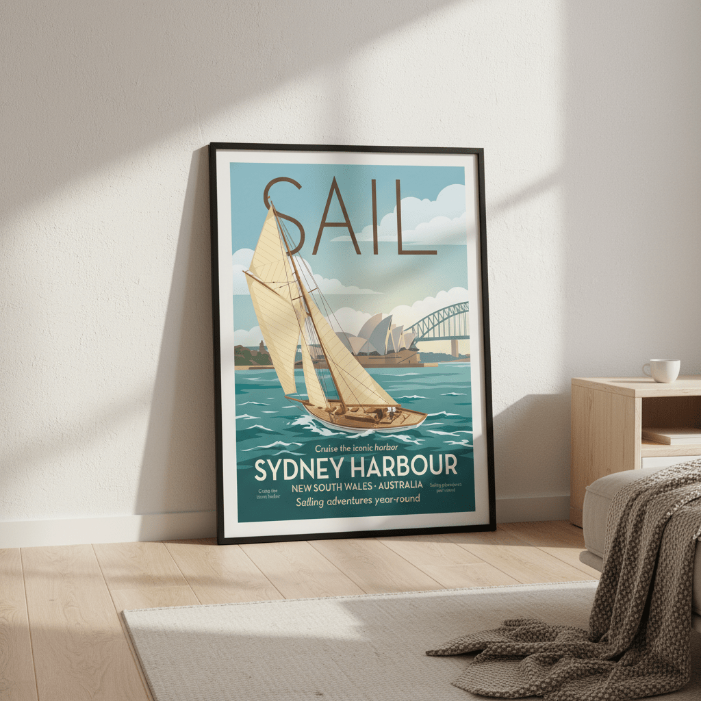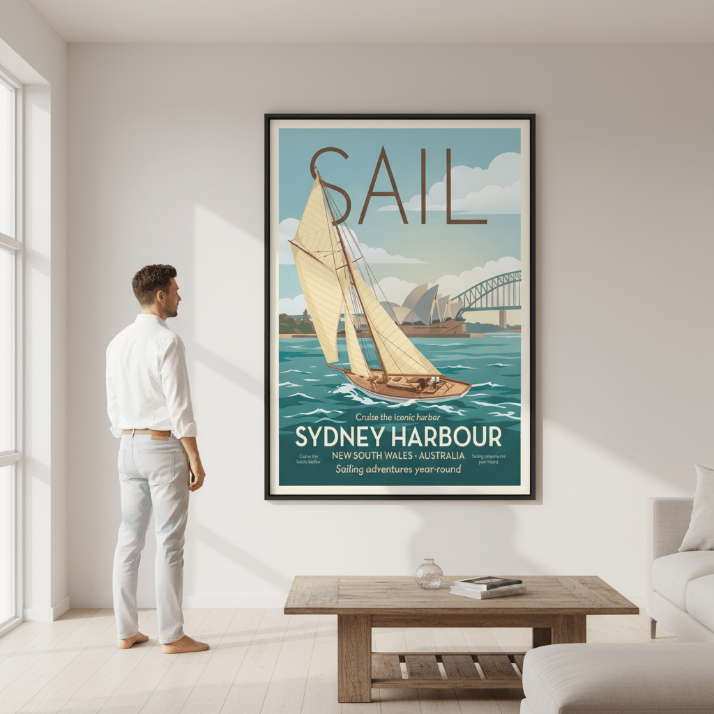 Capture the spirit of Sydney's maritime heritage with this striking vintage advertisement poster. Rendered in classic mid-century design, this piece celebrates the iconic Sail Sydney event with authentic period typography and colour palette. Perfect for nautical-themed interiors, coastal homes, or anyone drawn to Australian cultural nostalgia. The timeless aesthetic pairs beautifully with gallery walls or as a standalone statement piece. A conversation starter that brings vintage charm and historical character to any room.