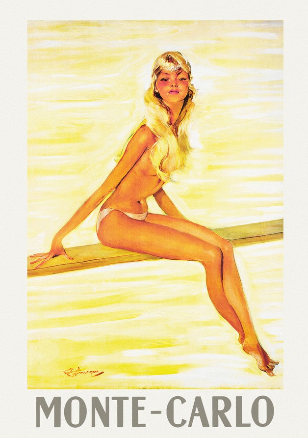 This striking 1937 Monte Carlo travel poster captures the glamour of the French Riviera's golden age. Featuring a sophisticated woman in vintage swimwear against a vibrant yellow background, the design exemplifies the Art Deco aesthetic that defined 1930s luxury tourism. The retro composition and period typography evoke nostalgia for an era of elegance and leisure. Perfect for adding authentic vintage character to any space, this reproduction print celebrates classic travel advertising and timeless style. A curated piece for collectors of vintage posters and those seeking to infuse their interiors with historical charm and sophisticated design.