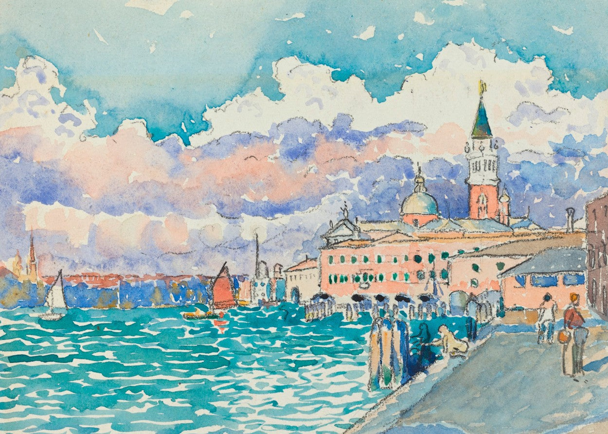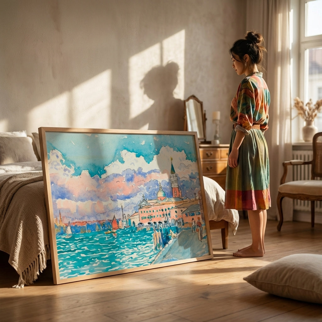 Capture the enchanting essence of Venice with this striking watercolor cityscape. Featuring luminous blue skies, delicate cloud formations, and a serene river reflecting the architectural beauty of historic buildings, this art print showcases masterful watercolor technique. The vibrant palette and atmospheric composition create a window into timeless European charm, perfect for adding sophistication and wanderlust to any interior space. An ideal choice for art collectors and those seeking to infuse their walls with cultural elegance and artistic refinement.