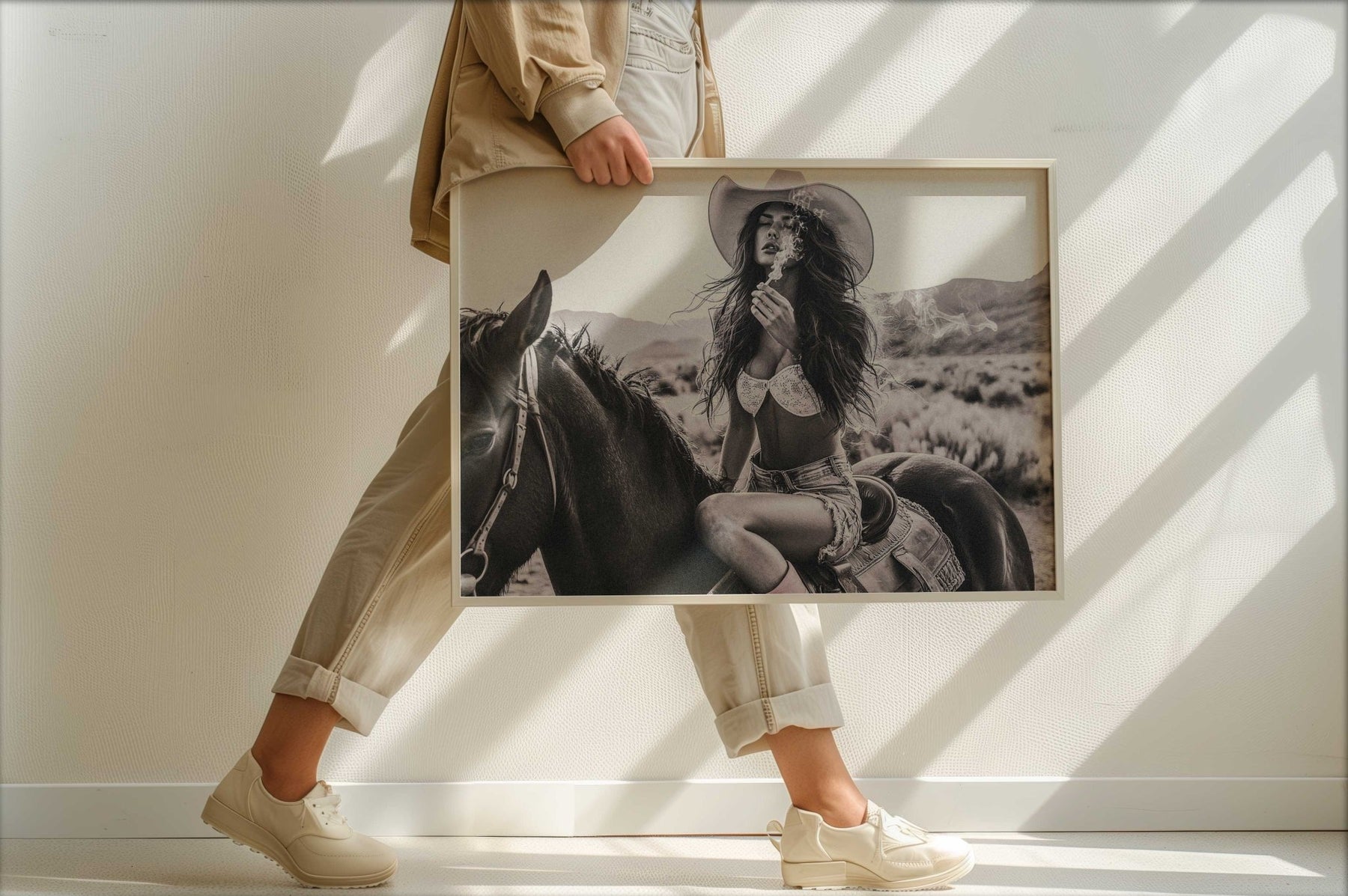Experience the bold allure of "Wild Ride" by Julian Van Bausch, a striking black and white photograph capturing an alluring cowgirl in a sophisticated, modern style. This daring piece blends fashion luxury with raw, untamed spirit, perfect for adding an edgy yet elegant statement to your space.