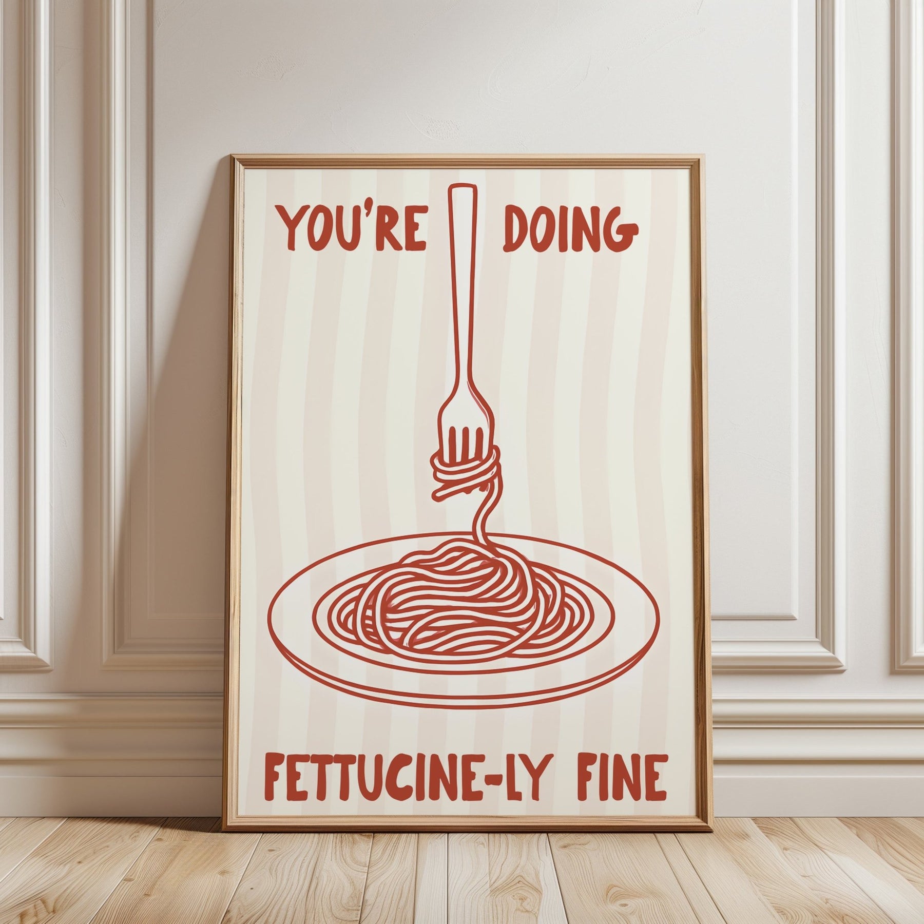 You're Doing Fettucinely Fine is a charming kitchen wall art print that brings culinary humour and sophistication to your cooking space. Featuring witty pasta-themed typography, this artwork celebrates the art of home cooking with style and personality. Perfect for food enthusiasts and kitchen lovers, it combines playful wordplay with contemporary design aesthetics. The print works beautifully as a standalone statement piece or as part of a gallery wall arrangement. Ideal for adding character to kitchens, dining areas, or any space where culinary passion meets interior design. A delightful choice for those who appreciate both good food and good design.