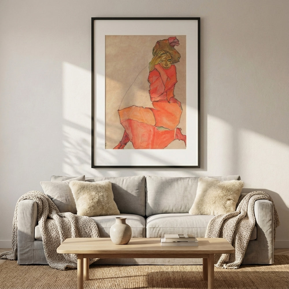 Egon Schiele Kneeling Female in Orange Red Dress 1910