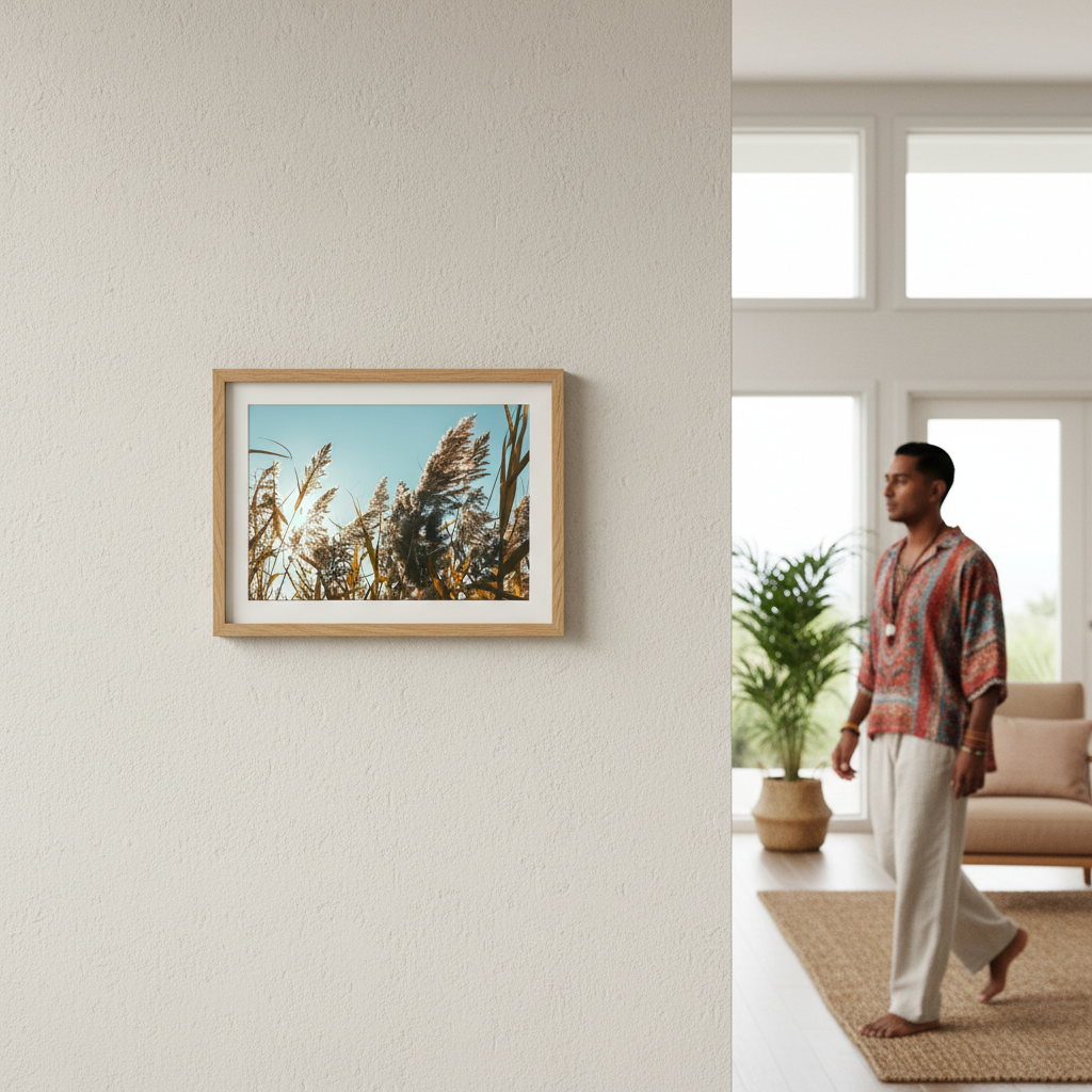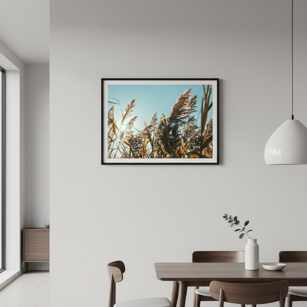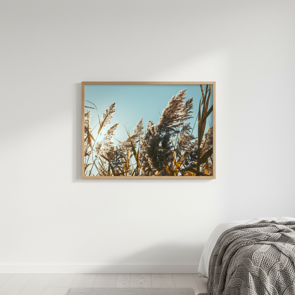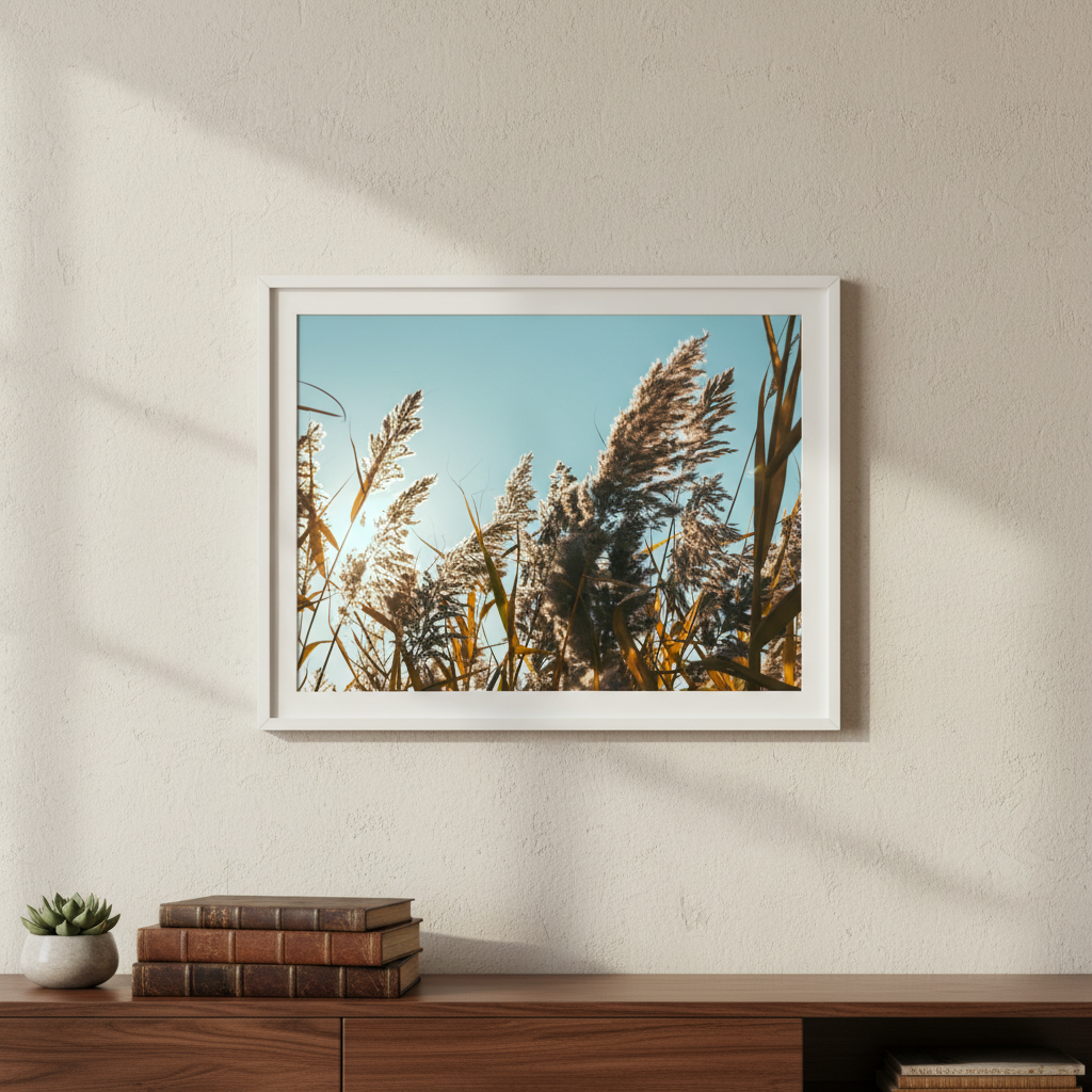 Capture the serene beauty of nature with this stunning photograph of reeds swaying gently in the wind against a clear blue sky. This artwork brings a sense of calm and movement to any space, perfect for those seeking a connection to the natural world.