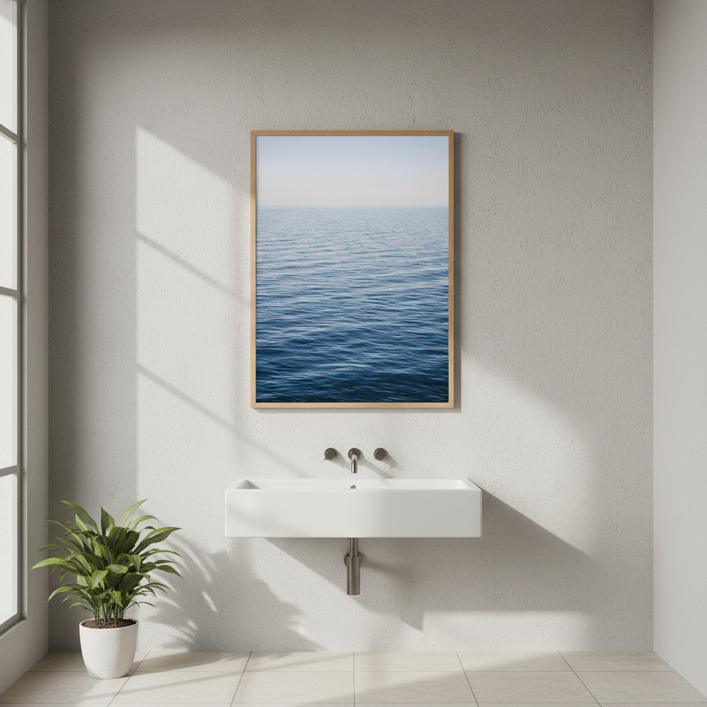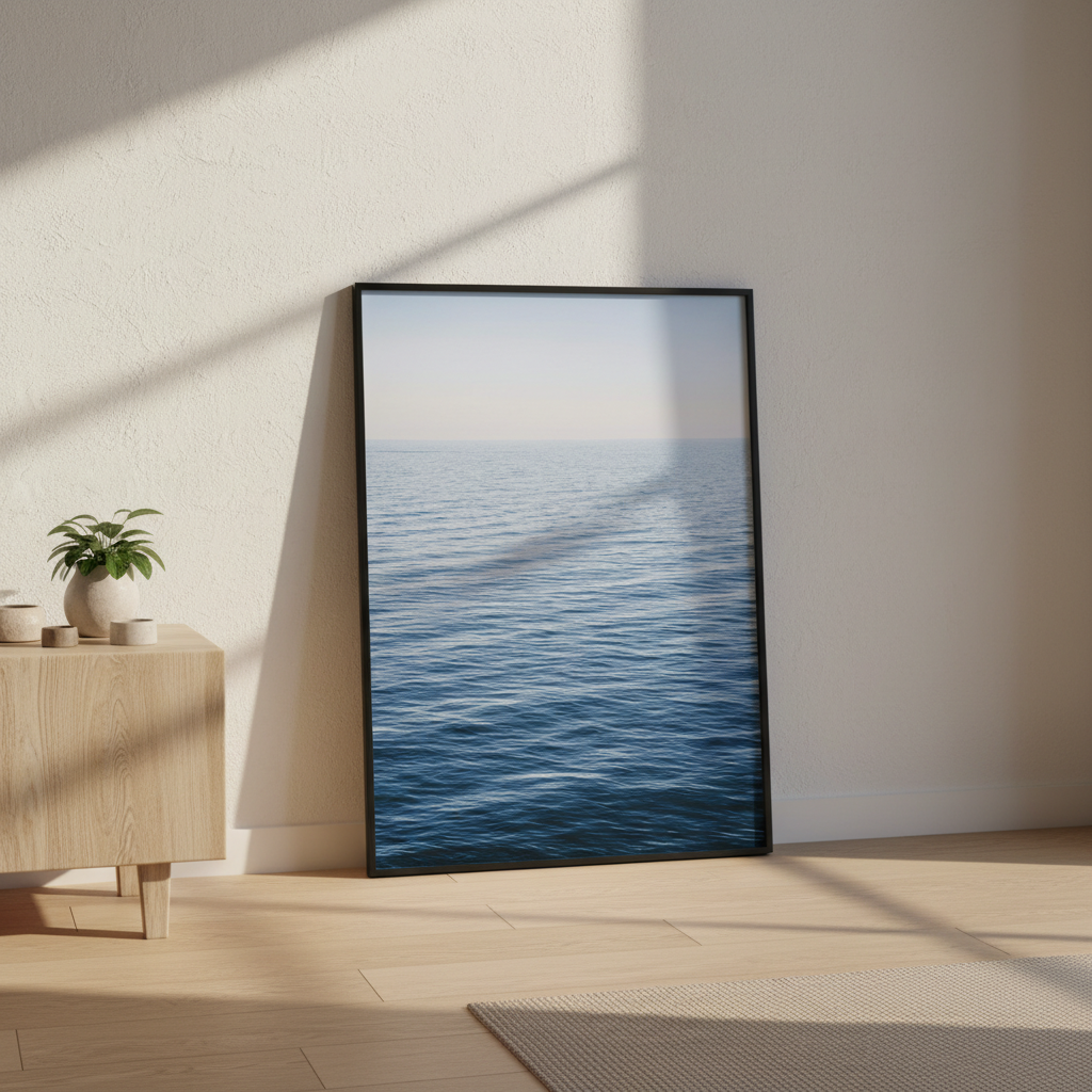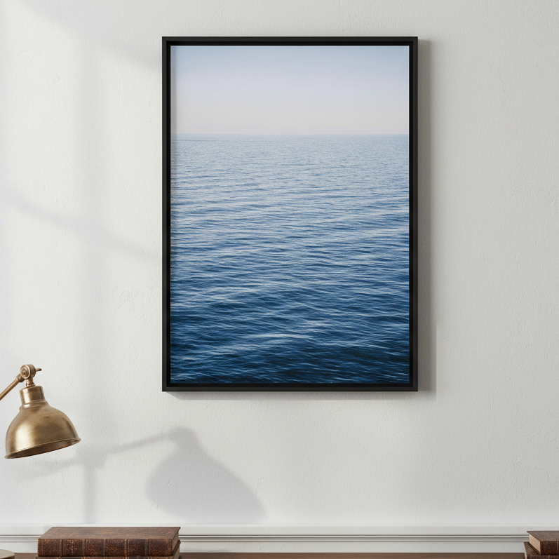 Immerse yourself in serene coastal beauty with this stunning photograph capturing a tranquil ocean meeting a crystalline sky. Perfect for creating a peaceful sanctuary in any room.