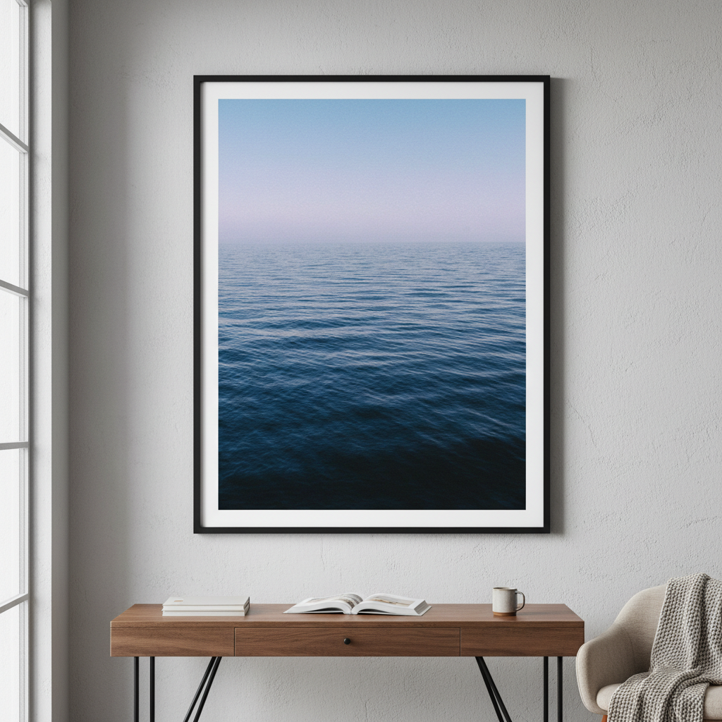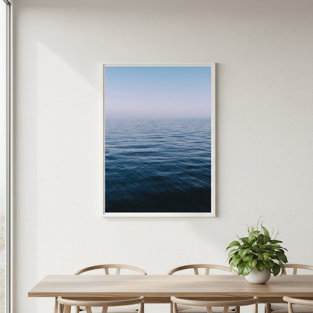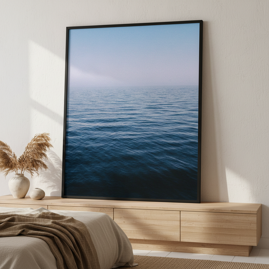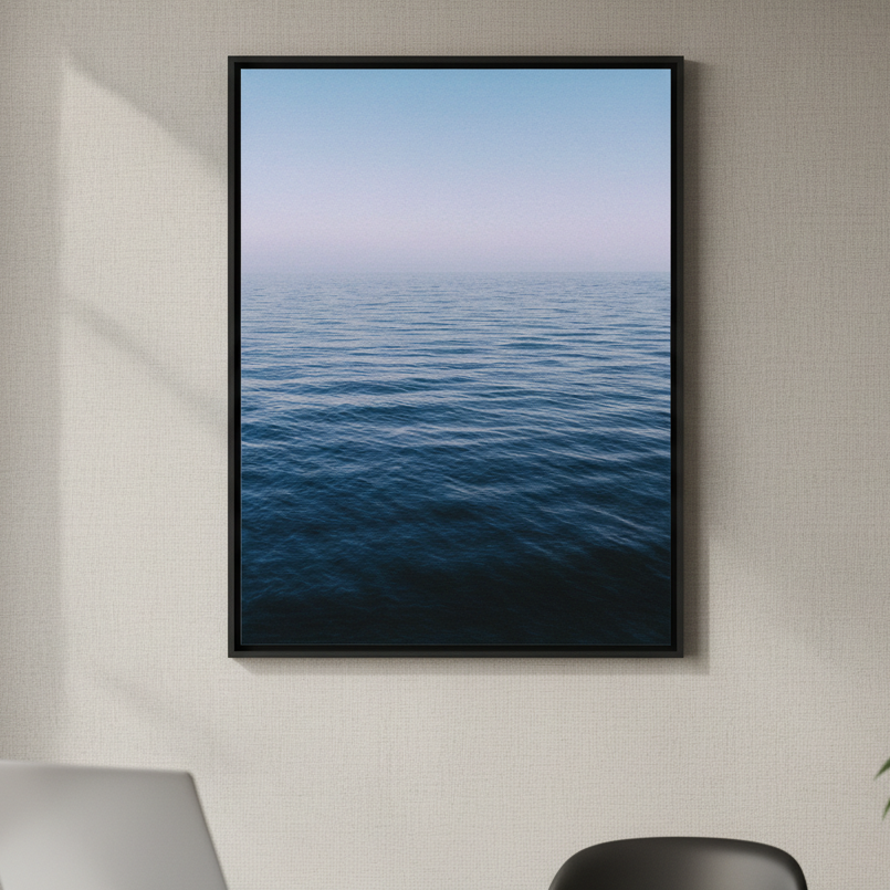 Immerse yourself in the serene beauty of a calm blue ocean meeting a crystalline sky. This stunning artwork captures the peaceful essence of endless horizons, bringing tranquility to any space.
