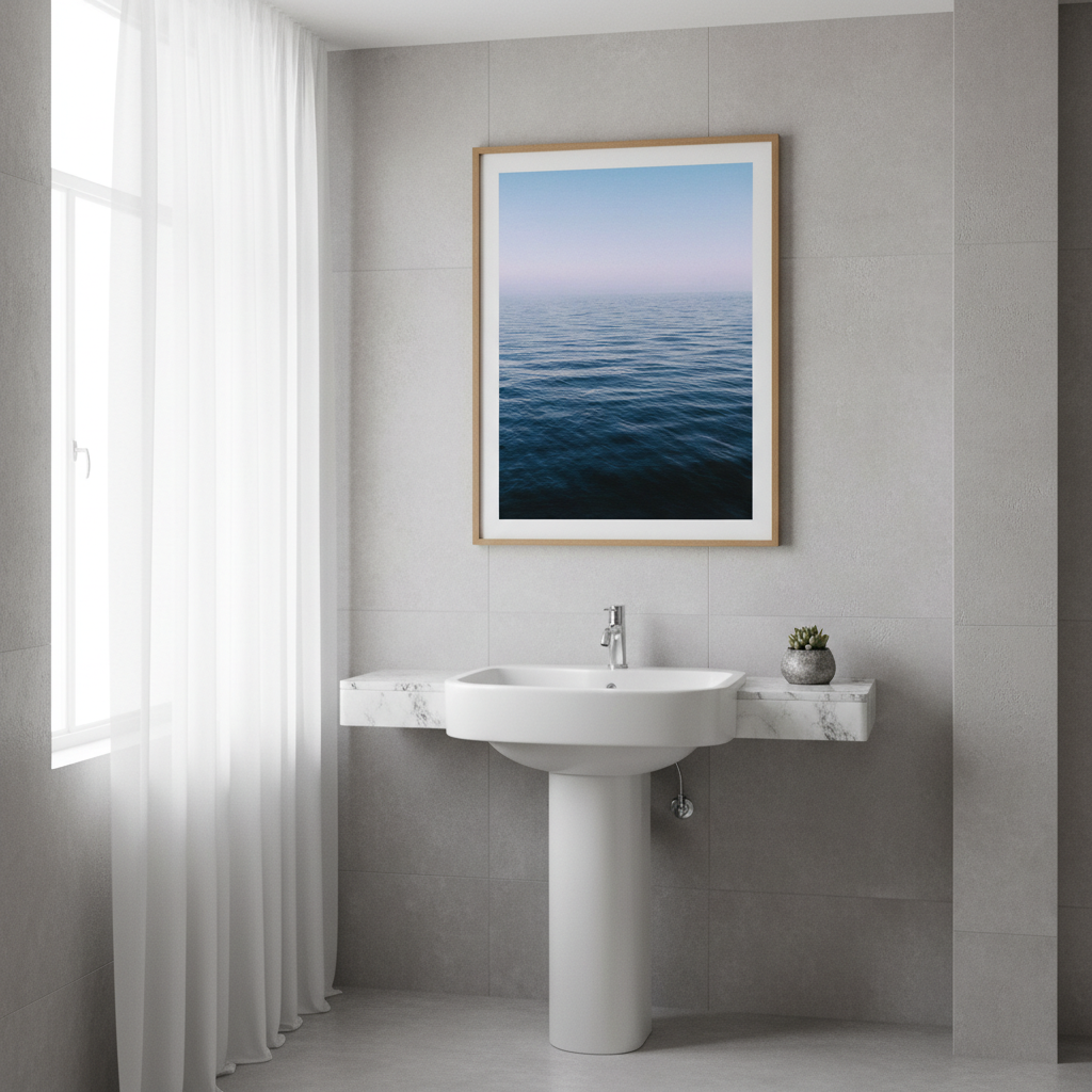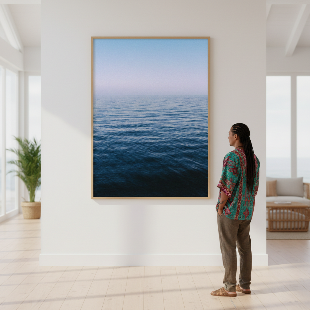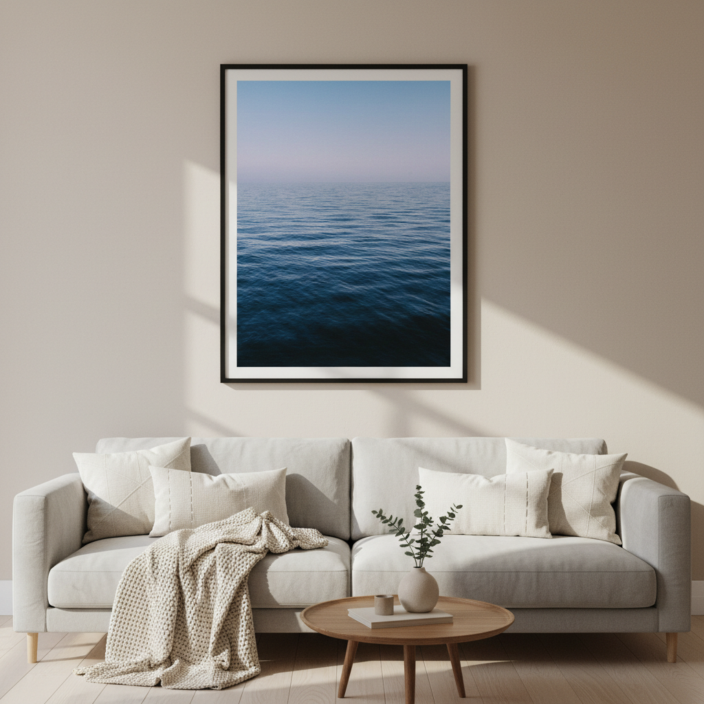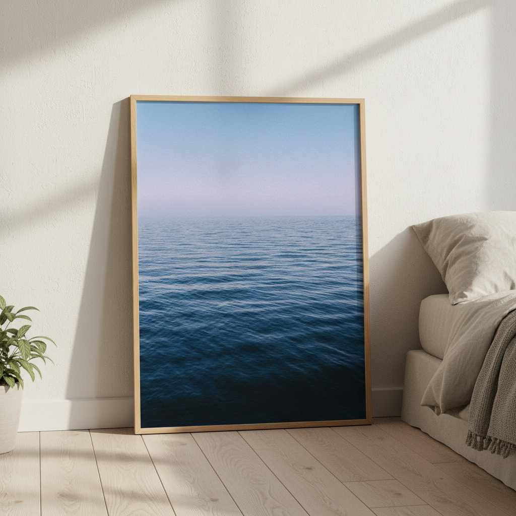 Immerse yourself in the serene beauty of a calm blue ocean meeting a crystalline sky. This stunning artwork captures the peaceful essence of endless horizons, bringing tranquility to any space.