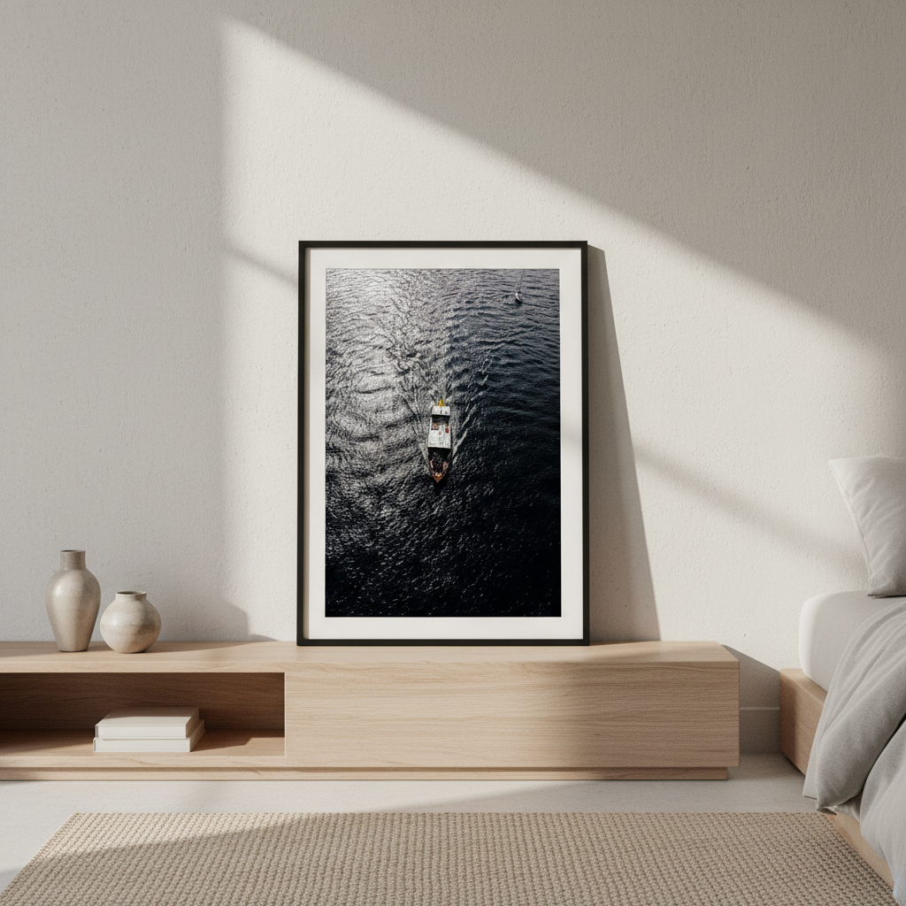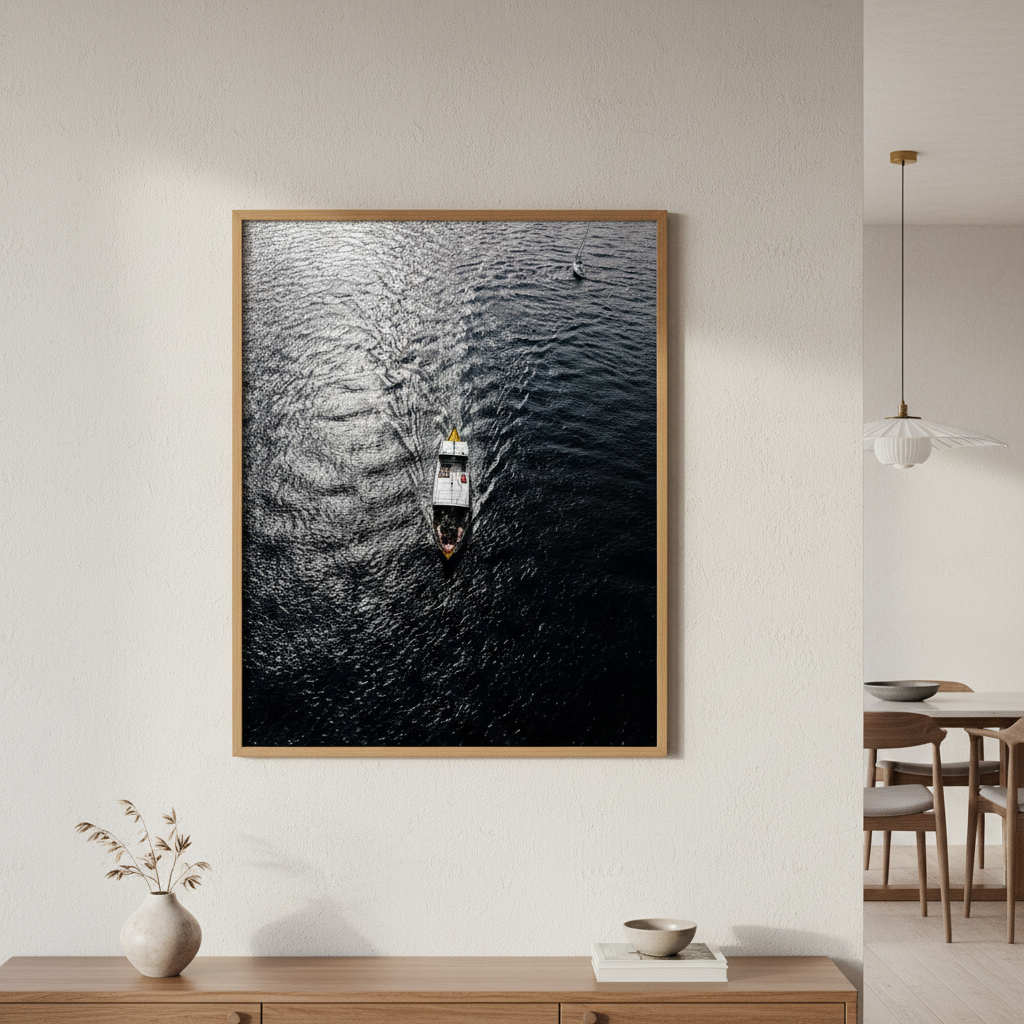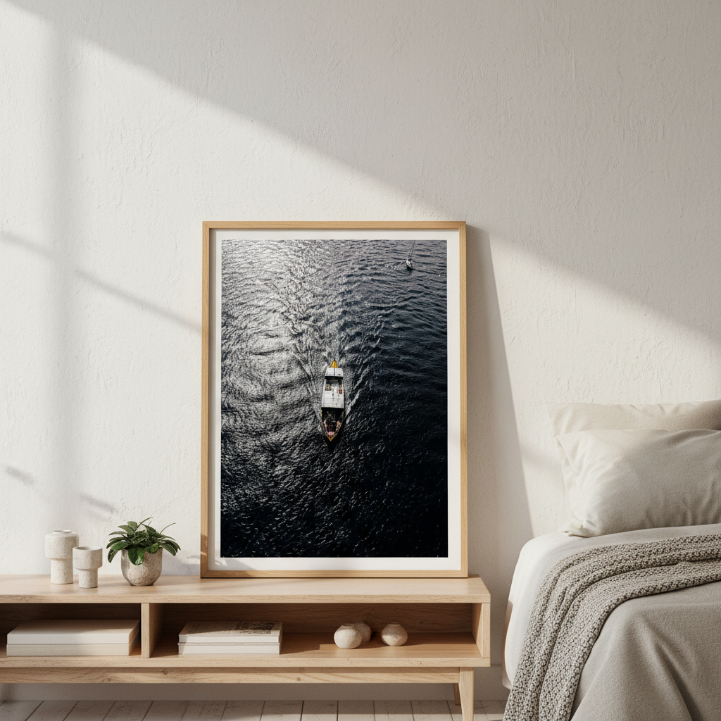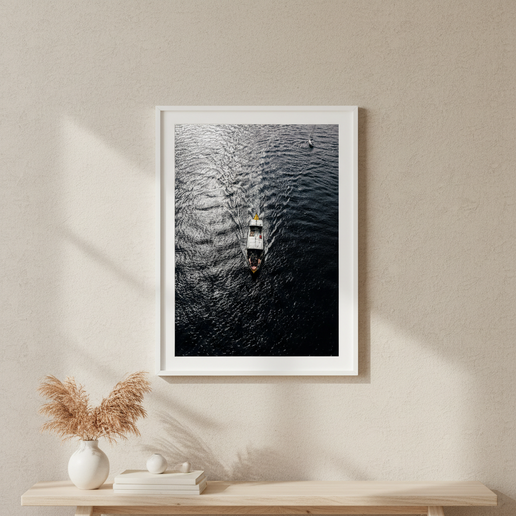 Capture the serene beauty of water in motion with this stunning photography print. A solitary boat glides across rippling waters while another vessel rests peacefully in the distance, creating depth and narrative within the frame. The interplay of light on the water's surface brings movement and tranquility to any space.