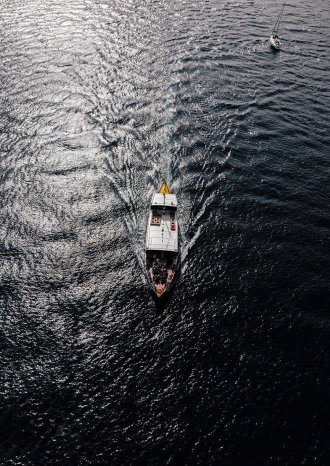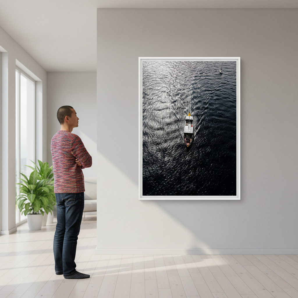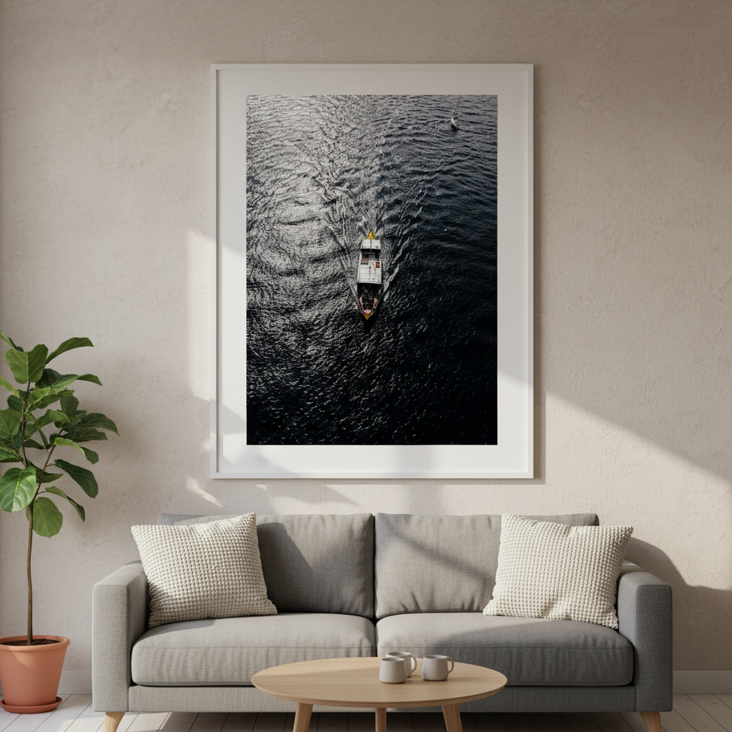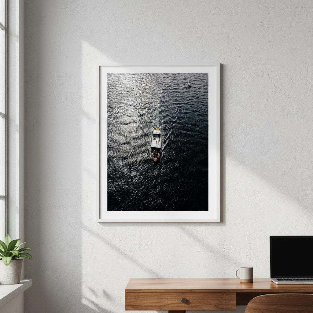 Capture the serene beauty of water in motion with this stunning photography print. A solitary boat glides across rippling waters while another vessel rests peacefully in the distance, creating depth and narrative within the frame. The interplay of light on the water's surface brings movement and tranquility to any space.