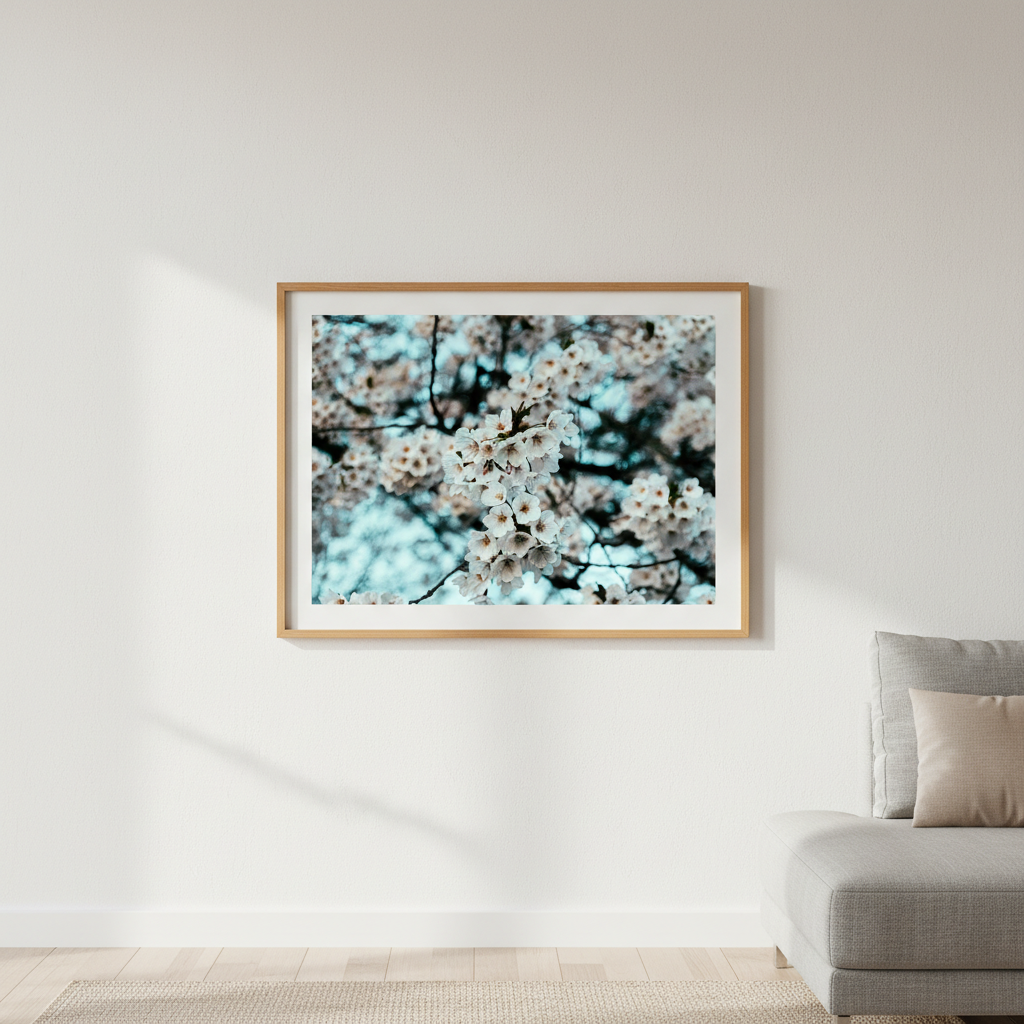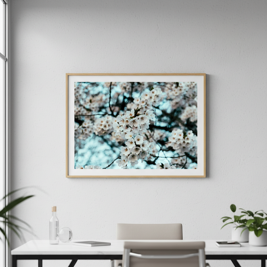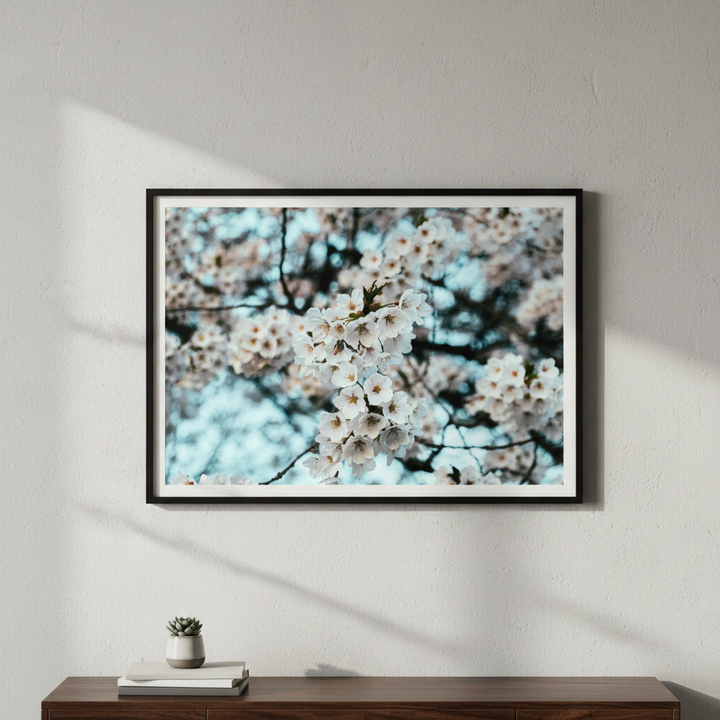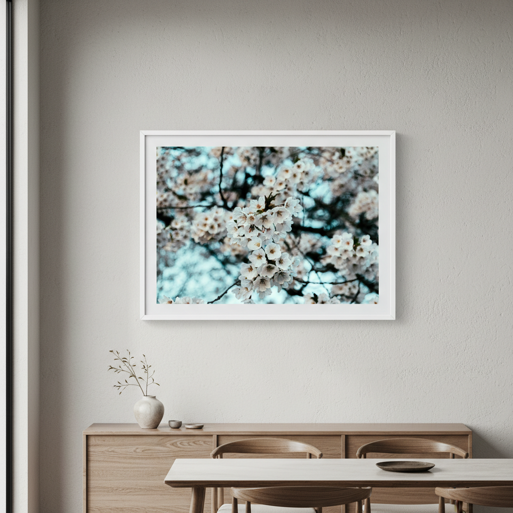 Capture the delicate beauty of nature's renewal with this stunning close-up photograph of white cherry blossoms. Soft petals emerge against a dreamy blurred background, creating an ethereal composition that brings springtime serenity into your space.