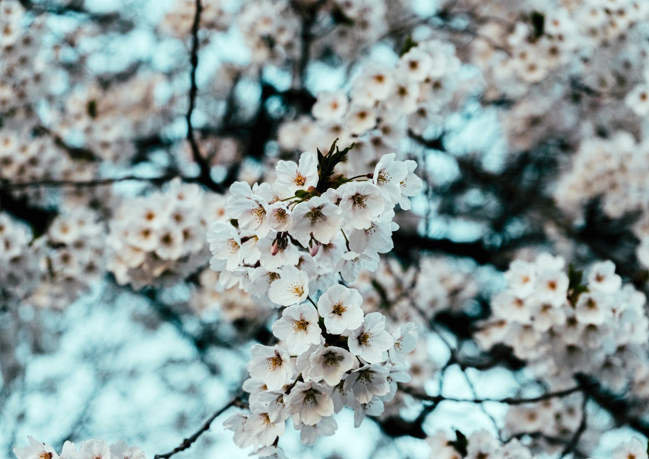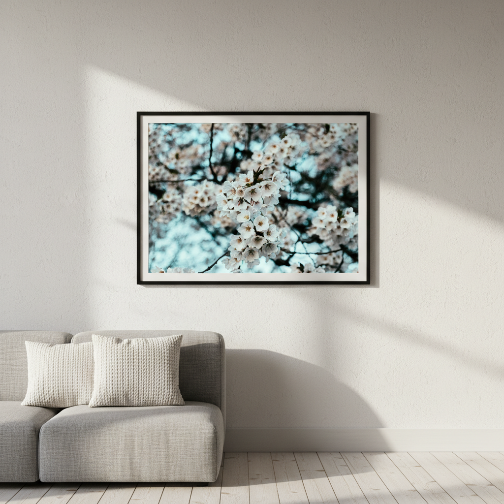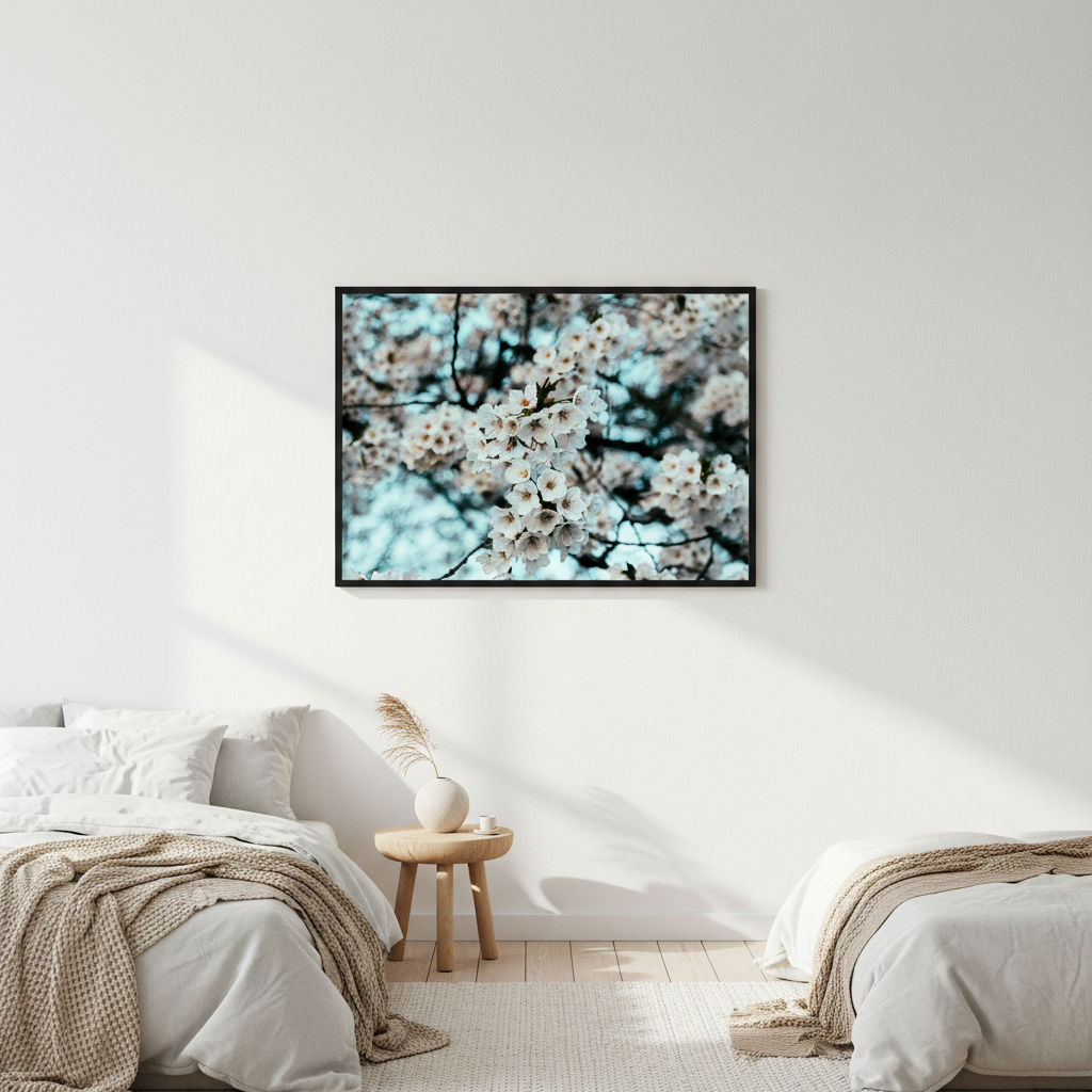 Capture the delicate beauty of nature's renewal with this stunning close-up photograph of white cherry blossoms. Soft petals emerge against a dreamy blurred background, creating an ethereal composition that brings springtime serenity into your space.