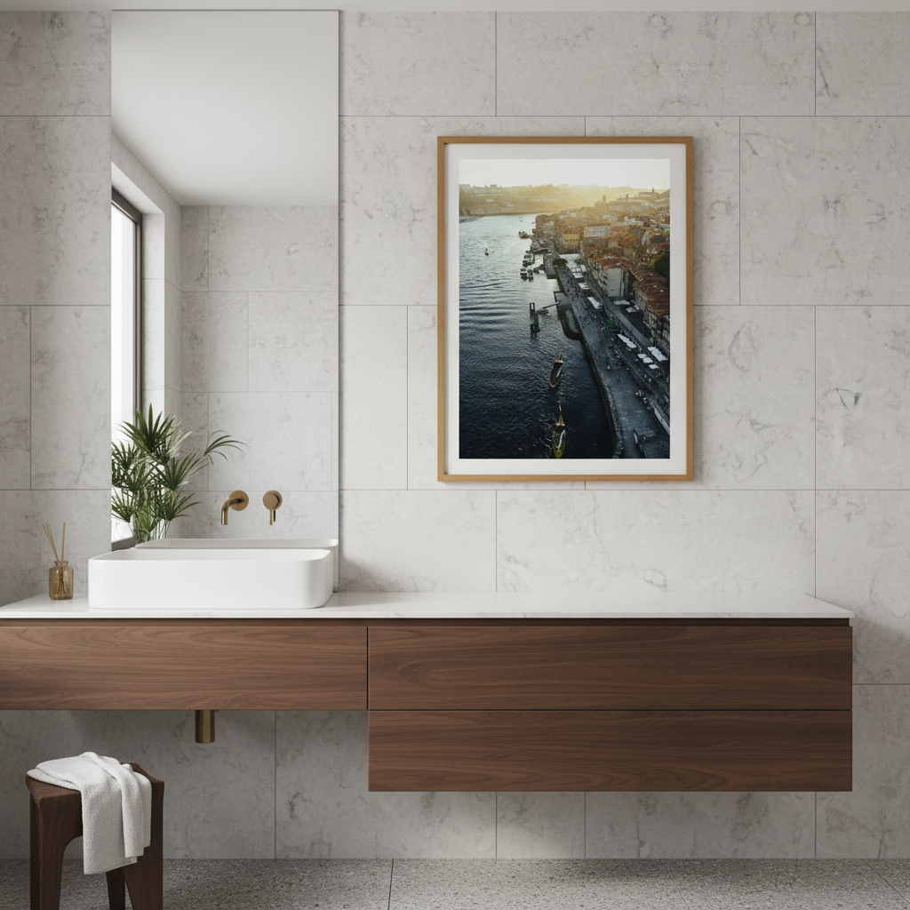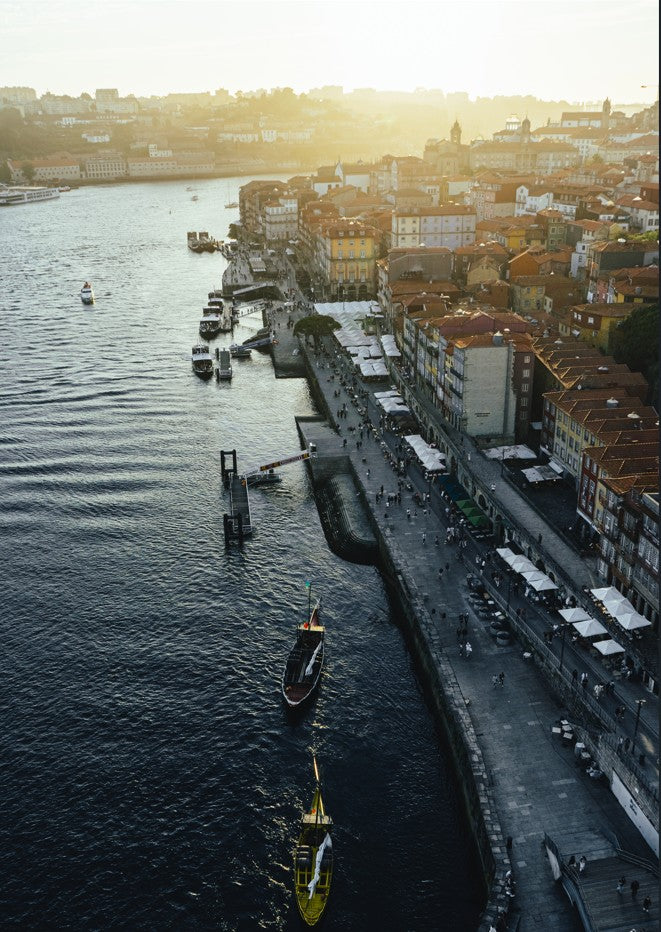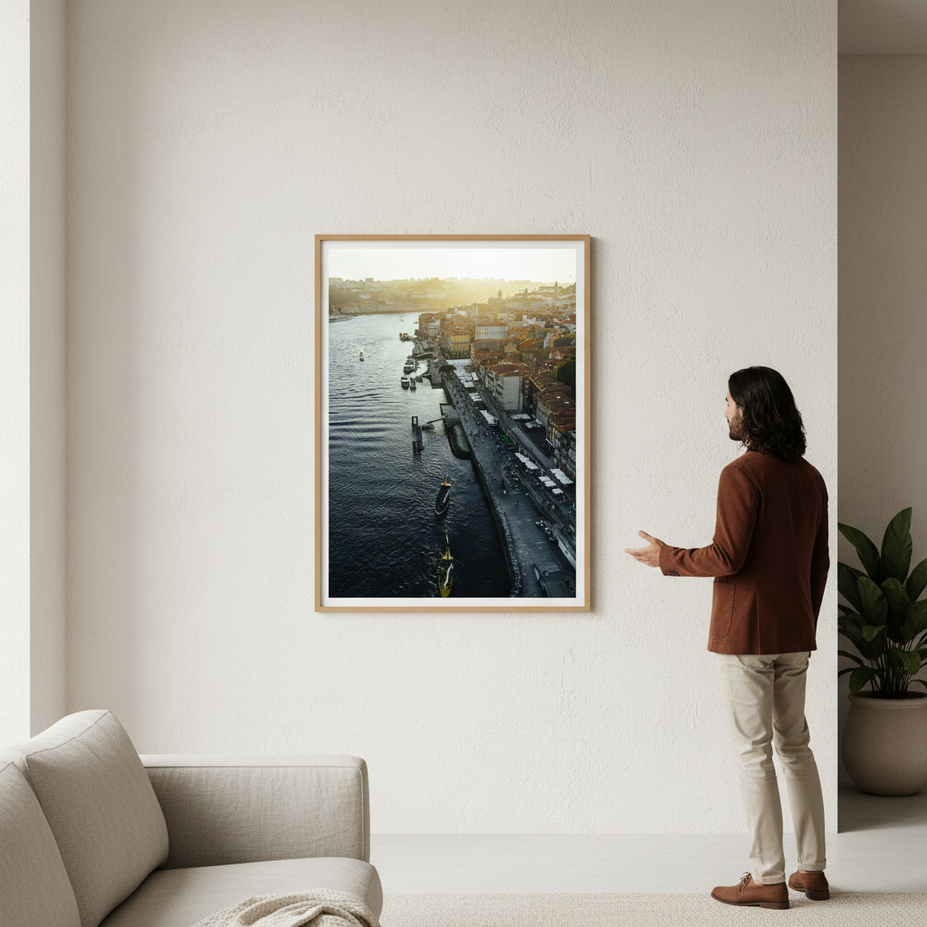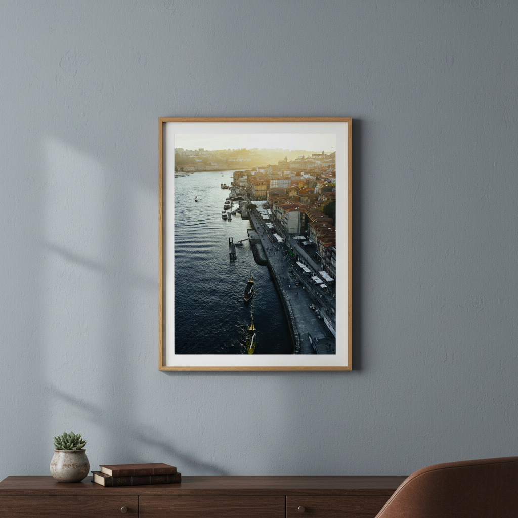 Capture the serene beauty of a waterfront at sunset with this stunning cityscape artwork. Watch as golden light dances across the water, illuminating moored boats and reflecting off the tranquil harbour. This evocative scene brings warmth and coastal charm to any space.