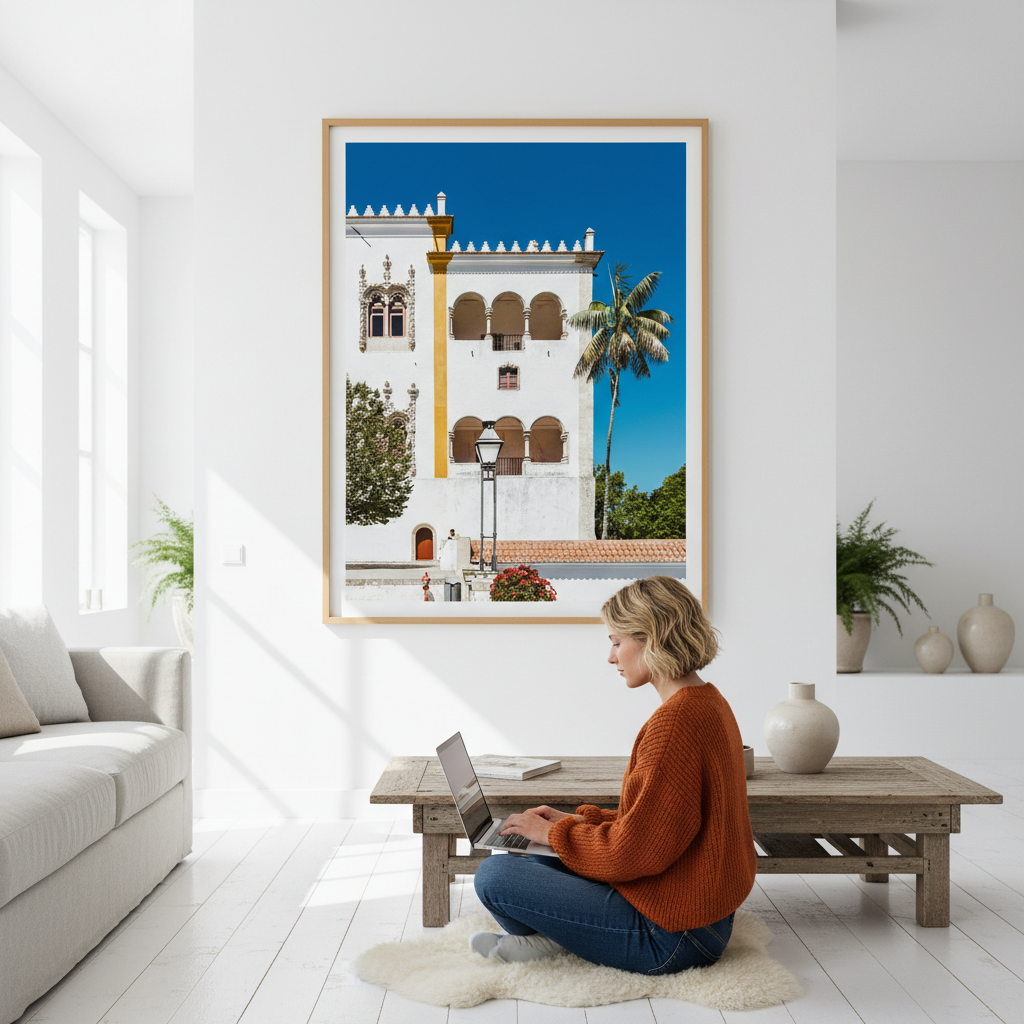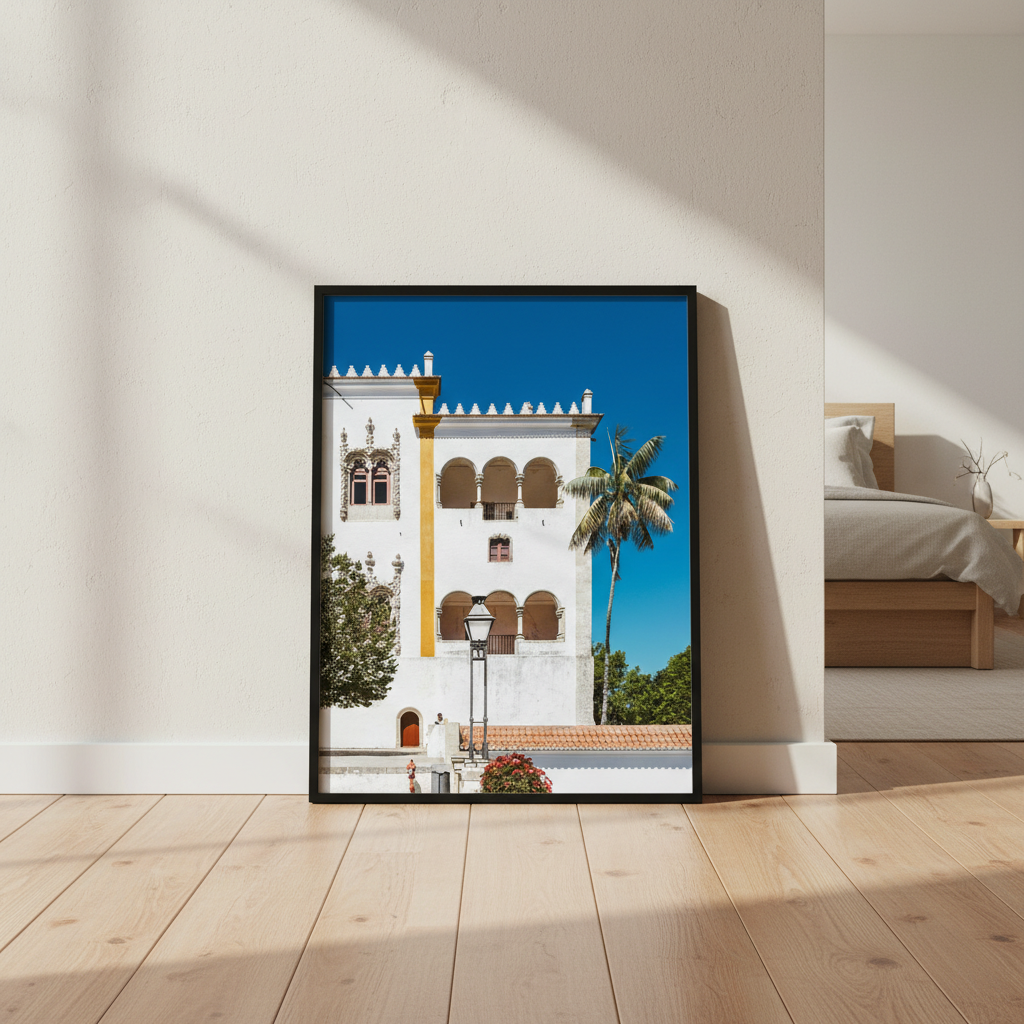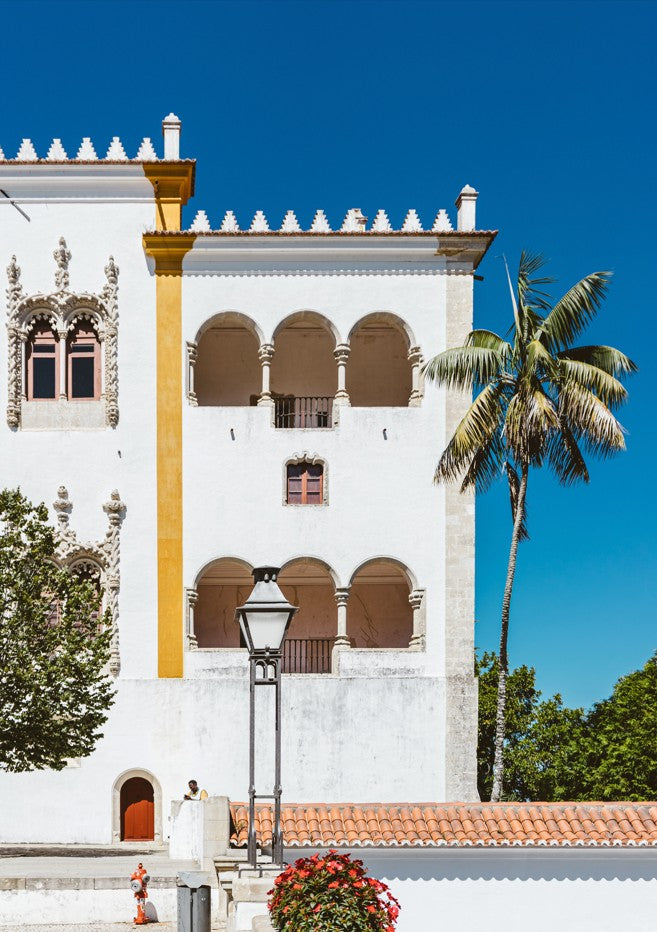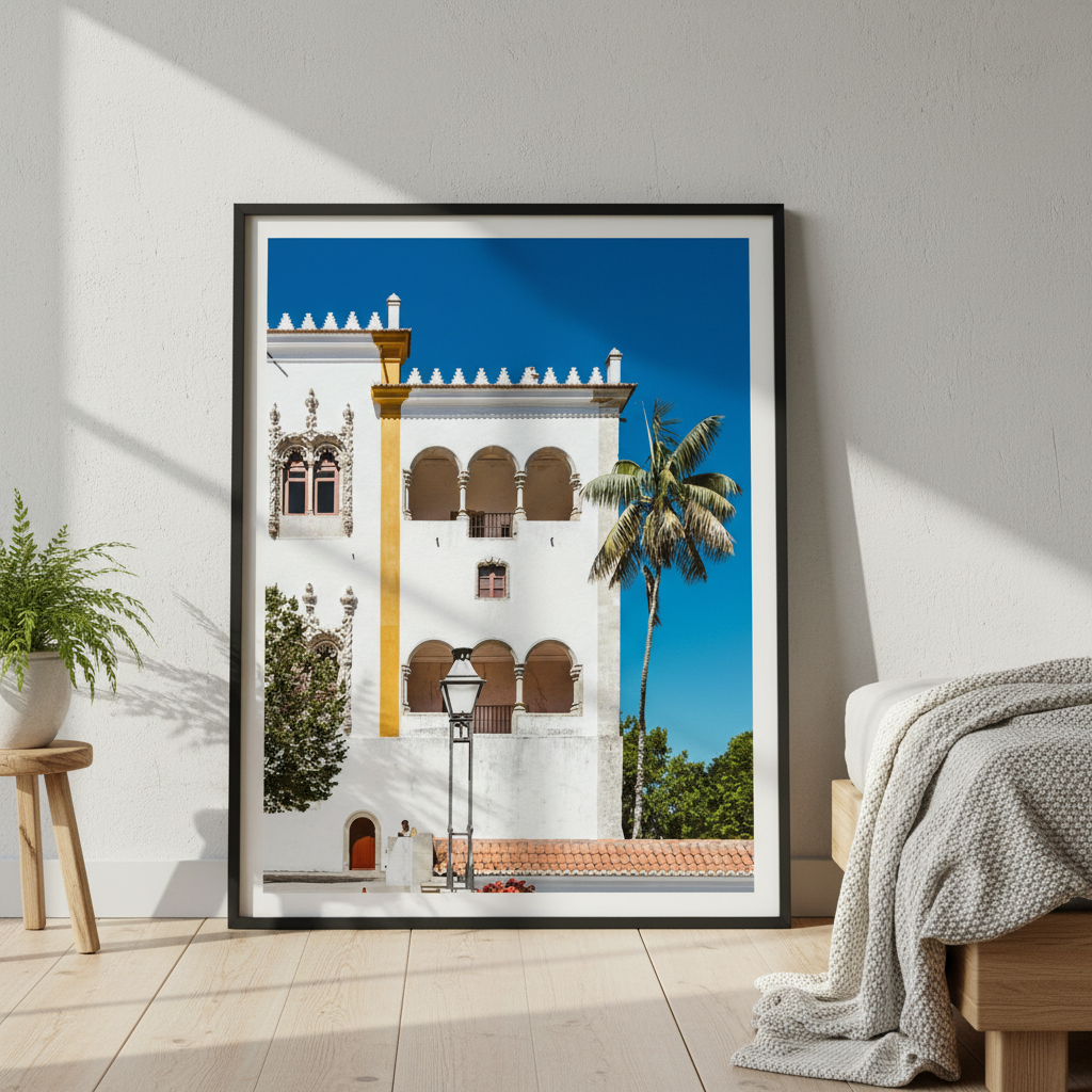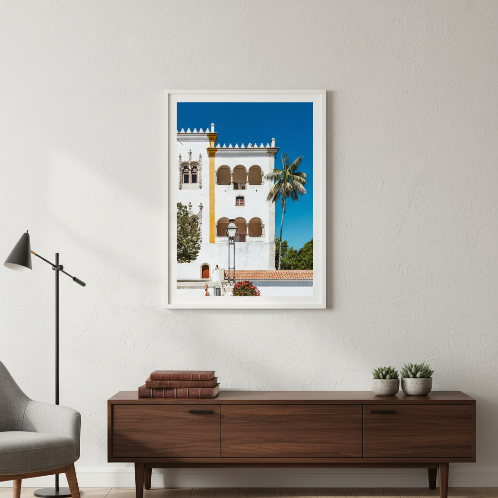 Capture the timeless elegance of Mediterranean architecture with this stunning photograph featuring a pristine white building adorned with decorative details, framed by a graceful palm tree against a brilliant blue sky. A serene and sophisticated addition to any space.