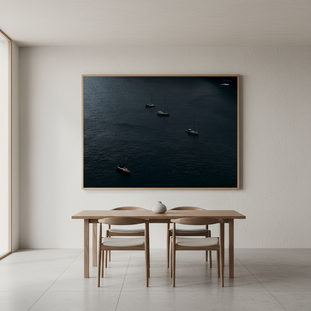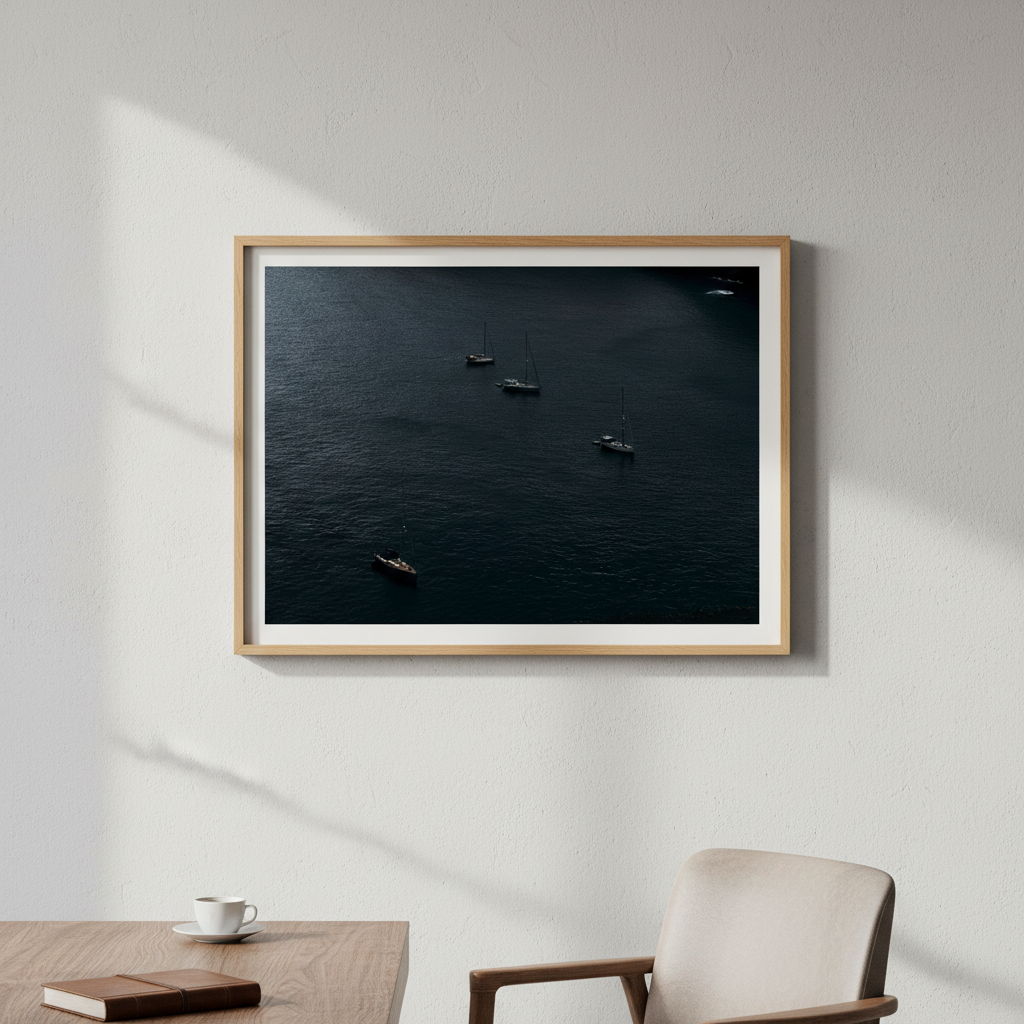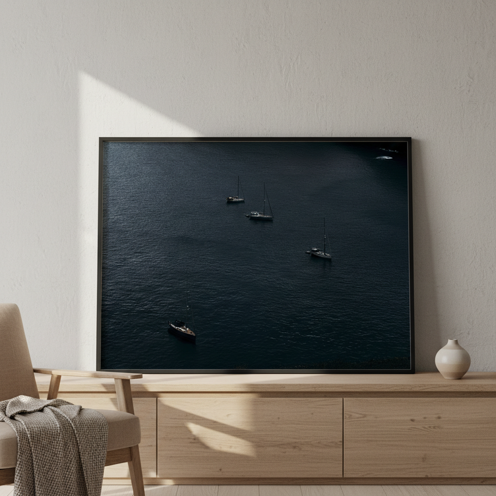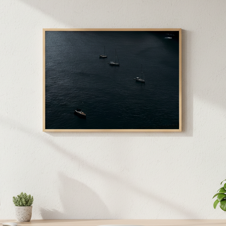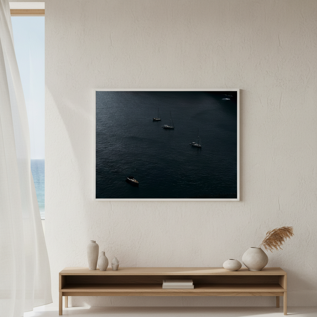 Capture the serene beauty of four sailboats anchored in a dark blue body of water with this stunning artwork. This piece evokes a sense of calm anticipation and maritime tranquility, perfect for adding coastal charm to any space.
