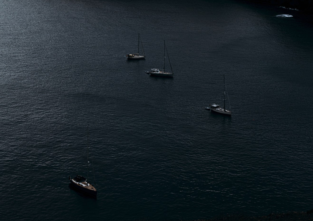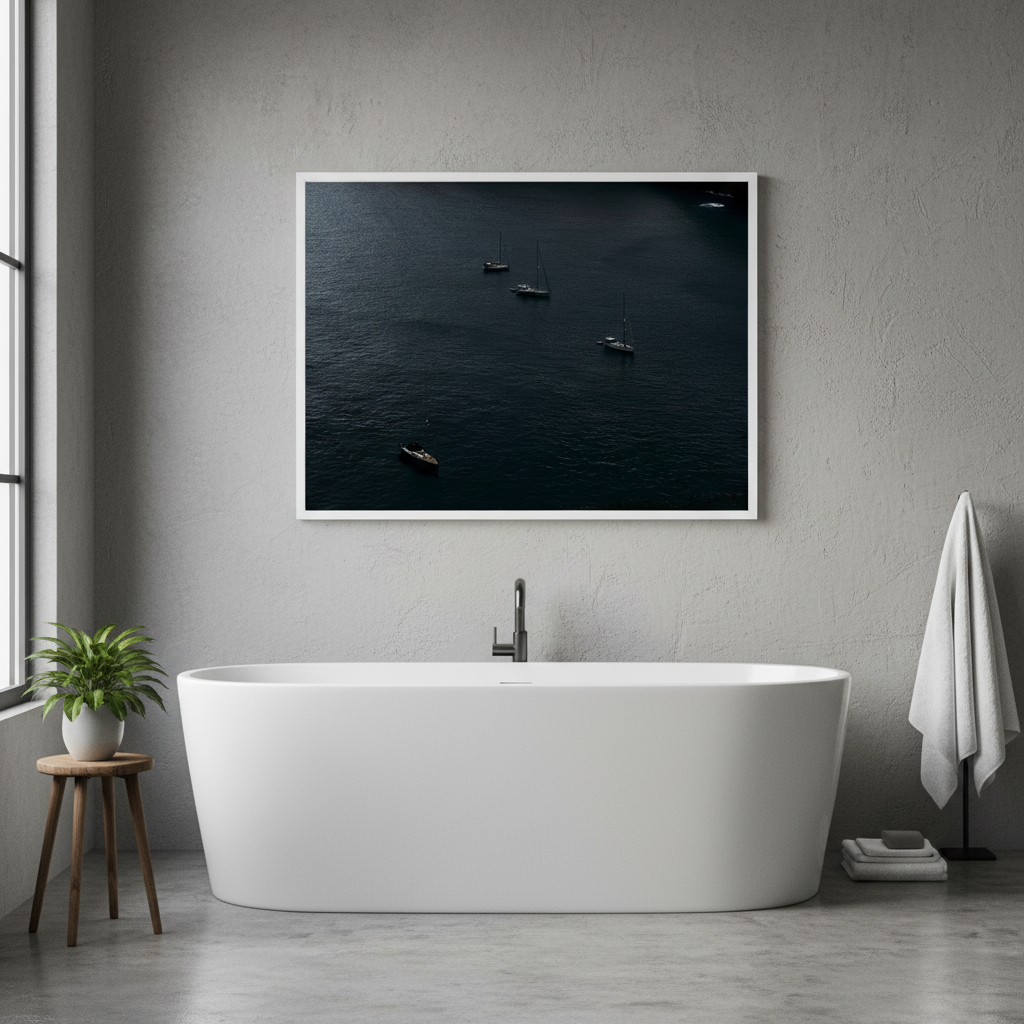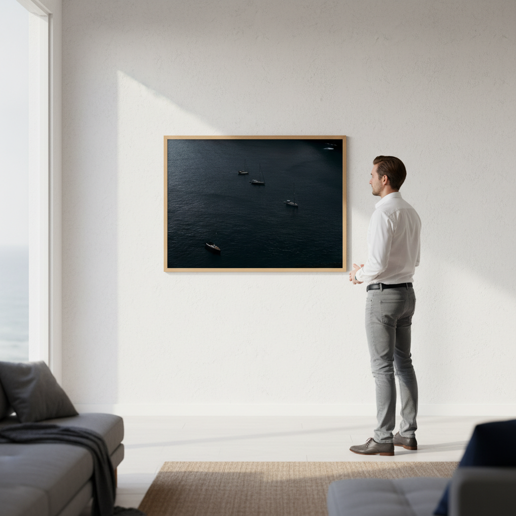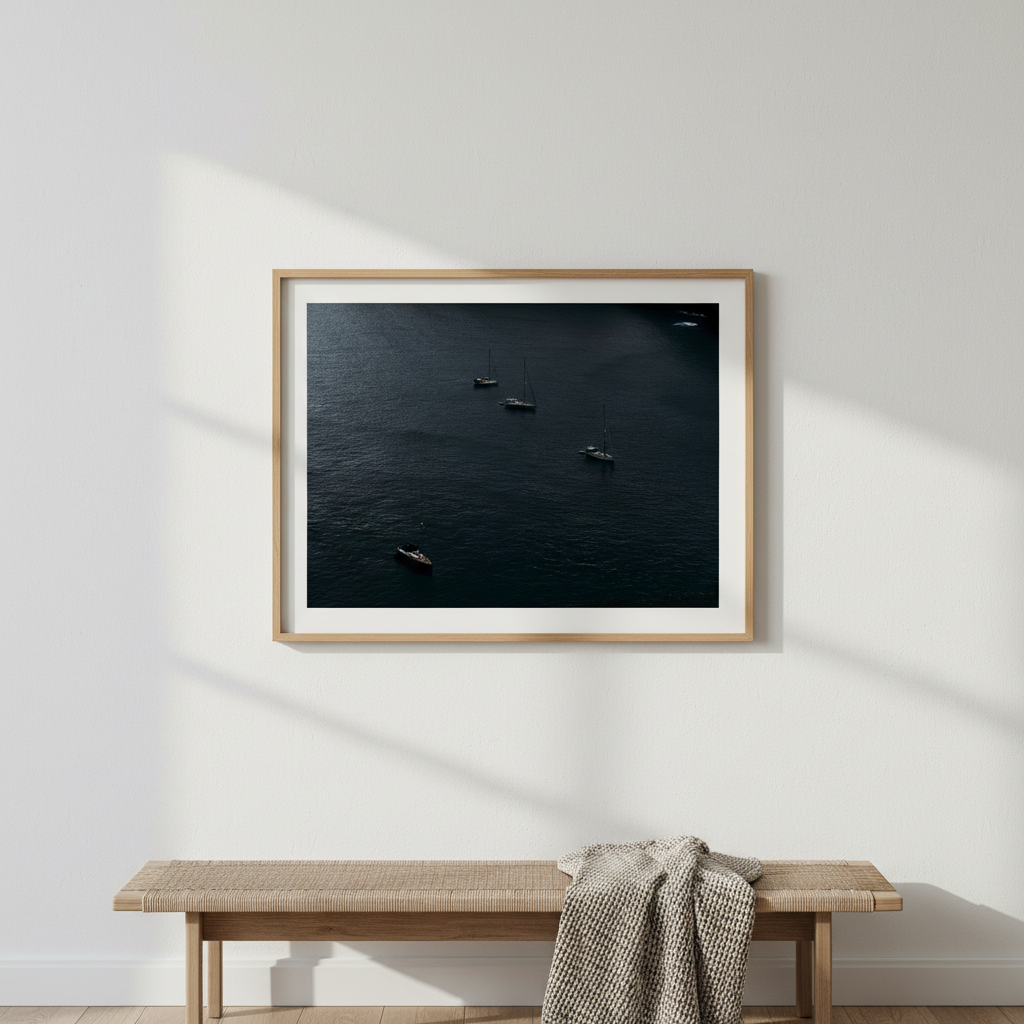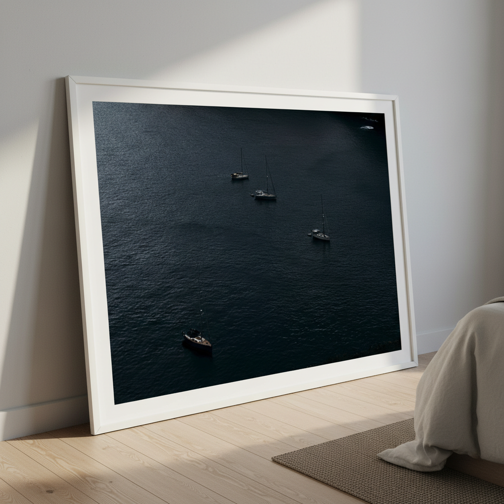 Capture the serene beauty of four sailboats anchored in a dark blue body of water with this stunning artwork. This piece evokes a sense of calm anticipation and maritime tranquility, perfect for adding coastal charm to any space.