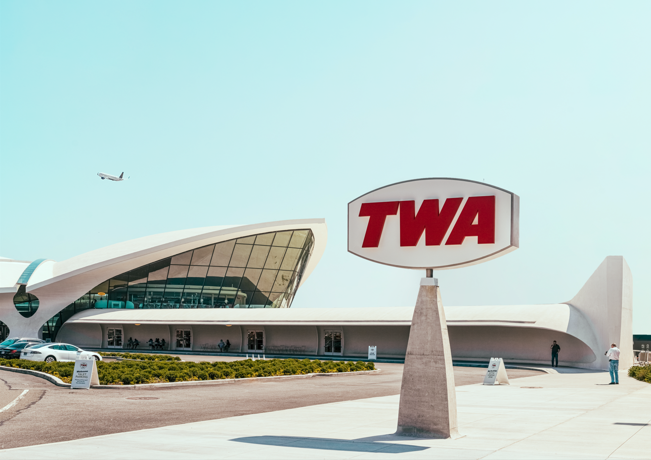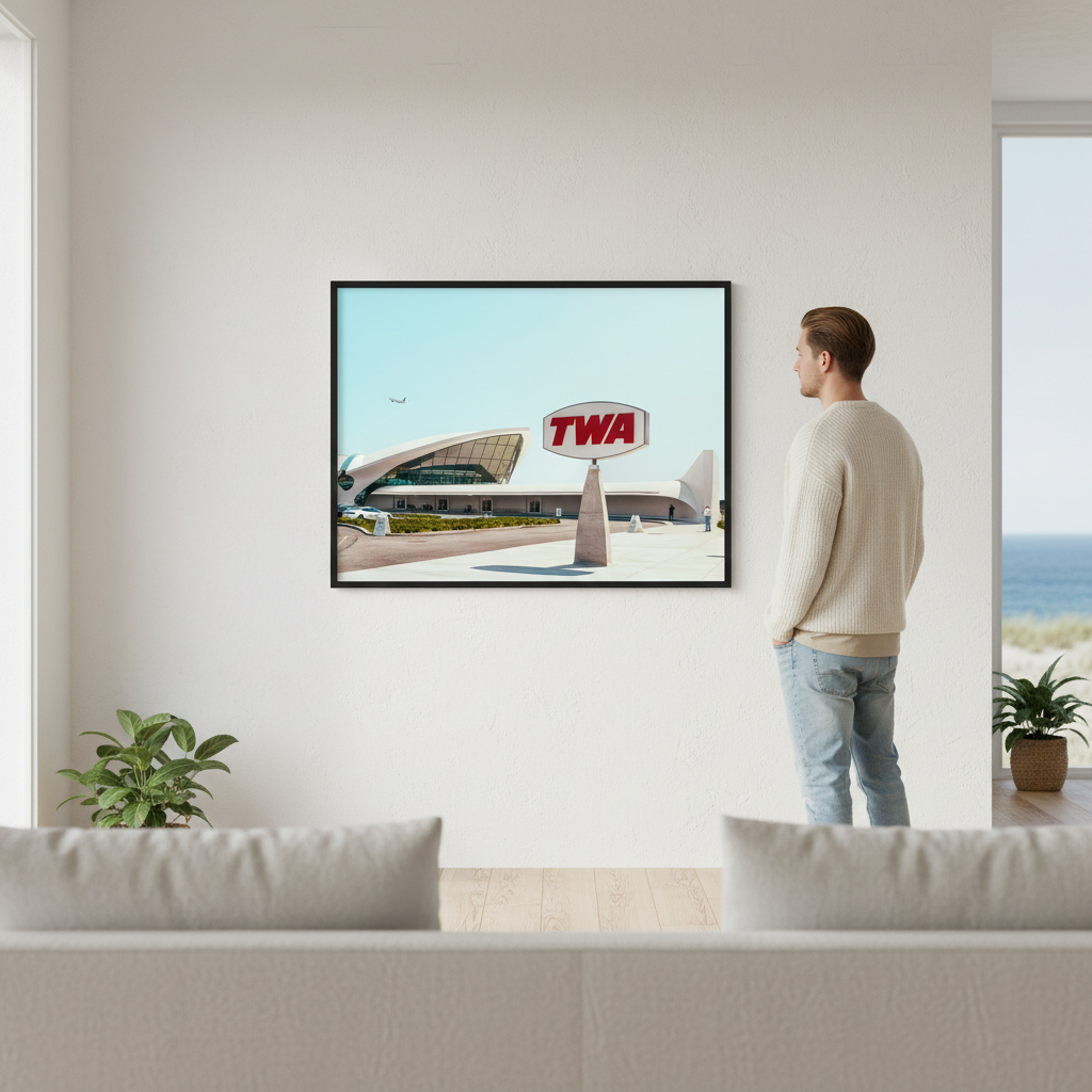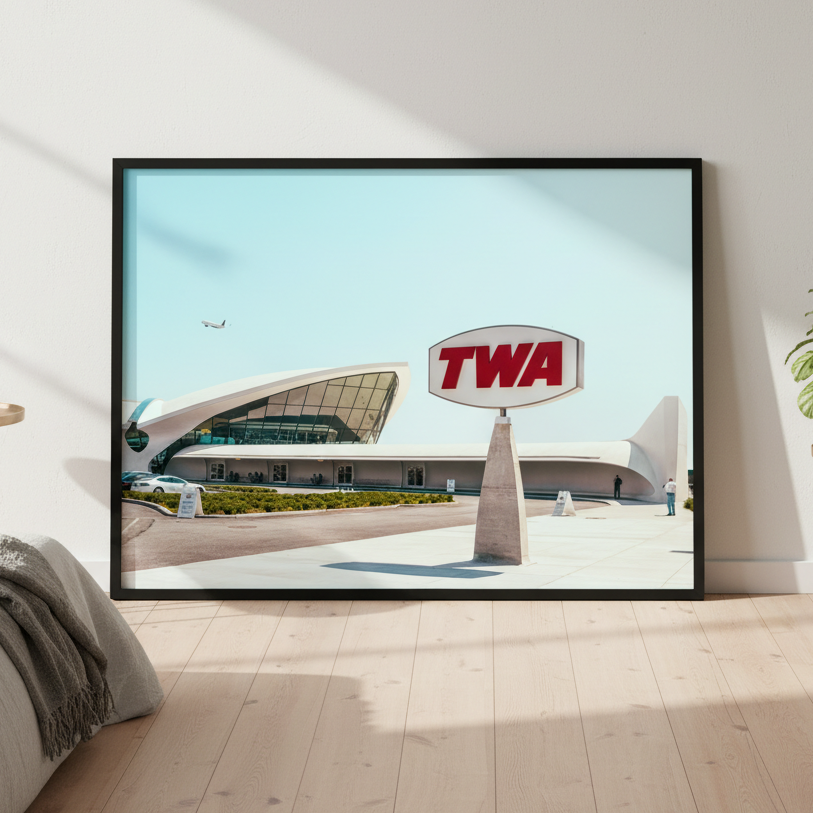 Stunning photograph capturing the iconic TWA building with its distinctive TWA logo and vintage aircraft in the background—a timeless tribute to aviation history and mid-century design.