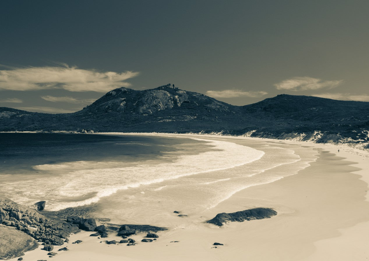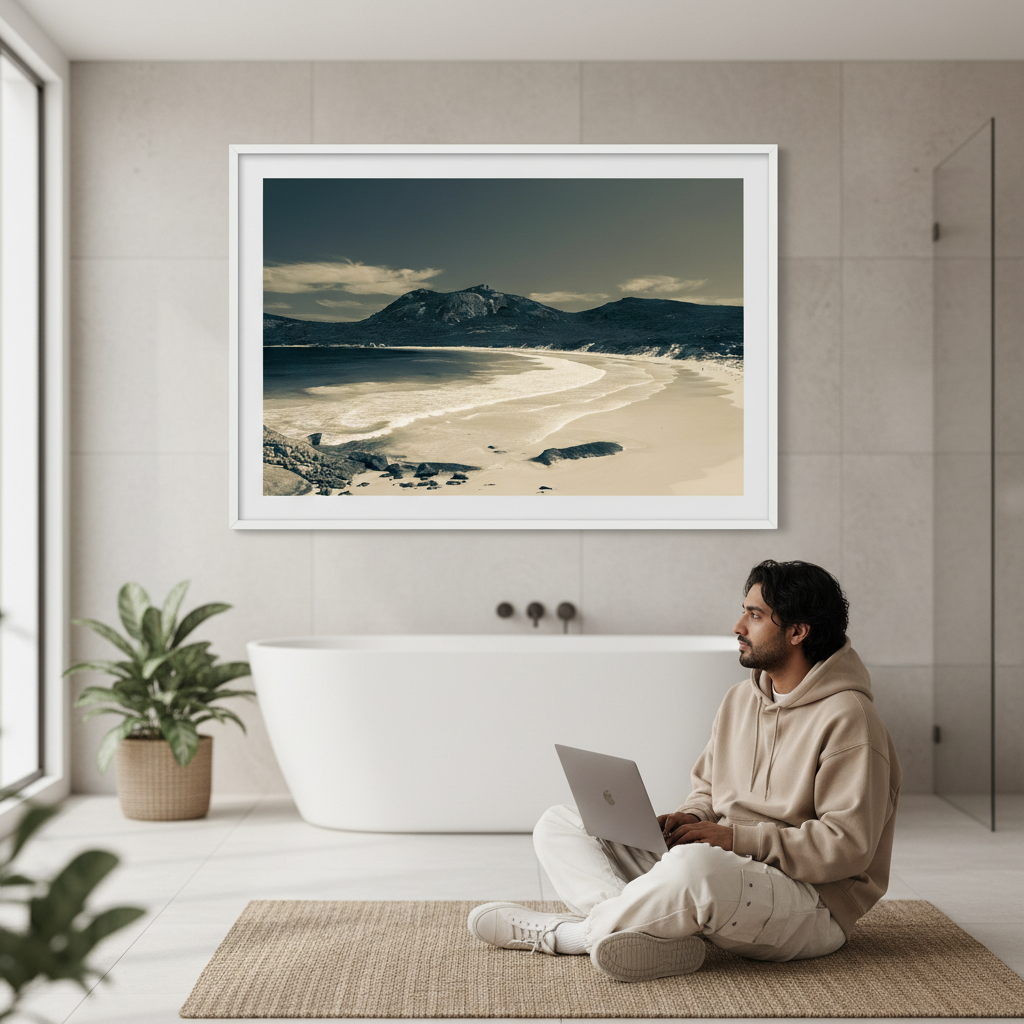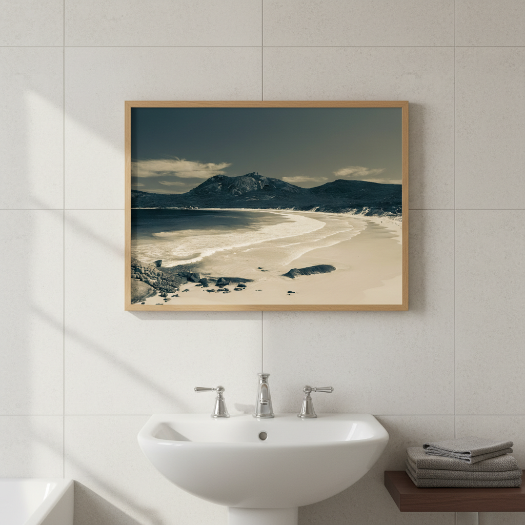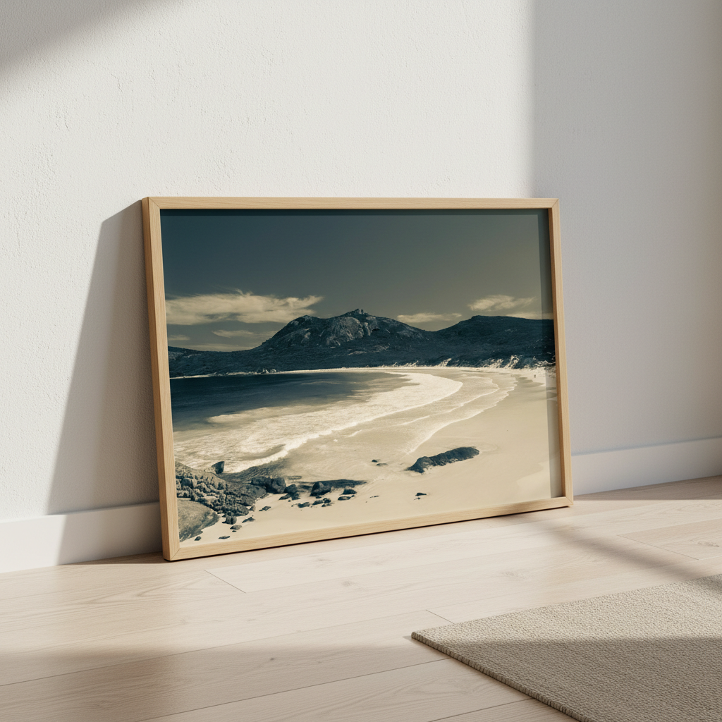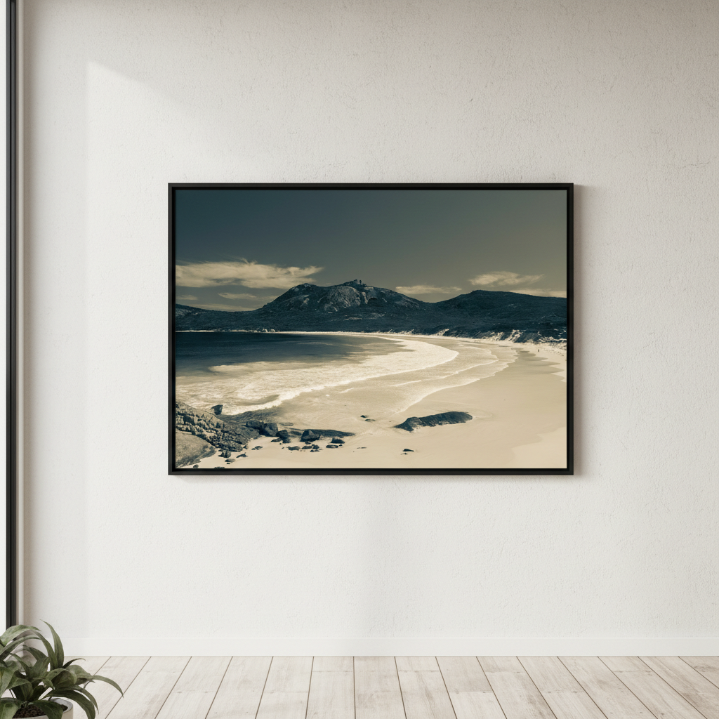 Escape to a serene shoreline with this stunning artwork capturing wet sand kissed by gentle waves, with majestic mountains rising in the distance. A moment of peaceful solitude frozen in time.