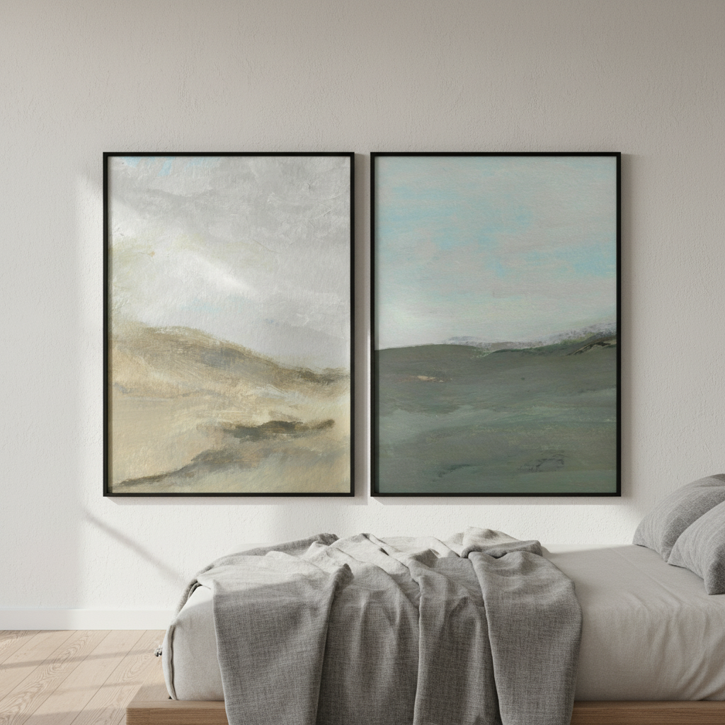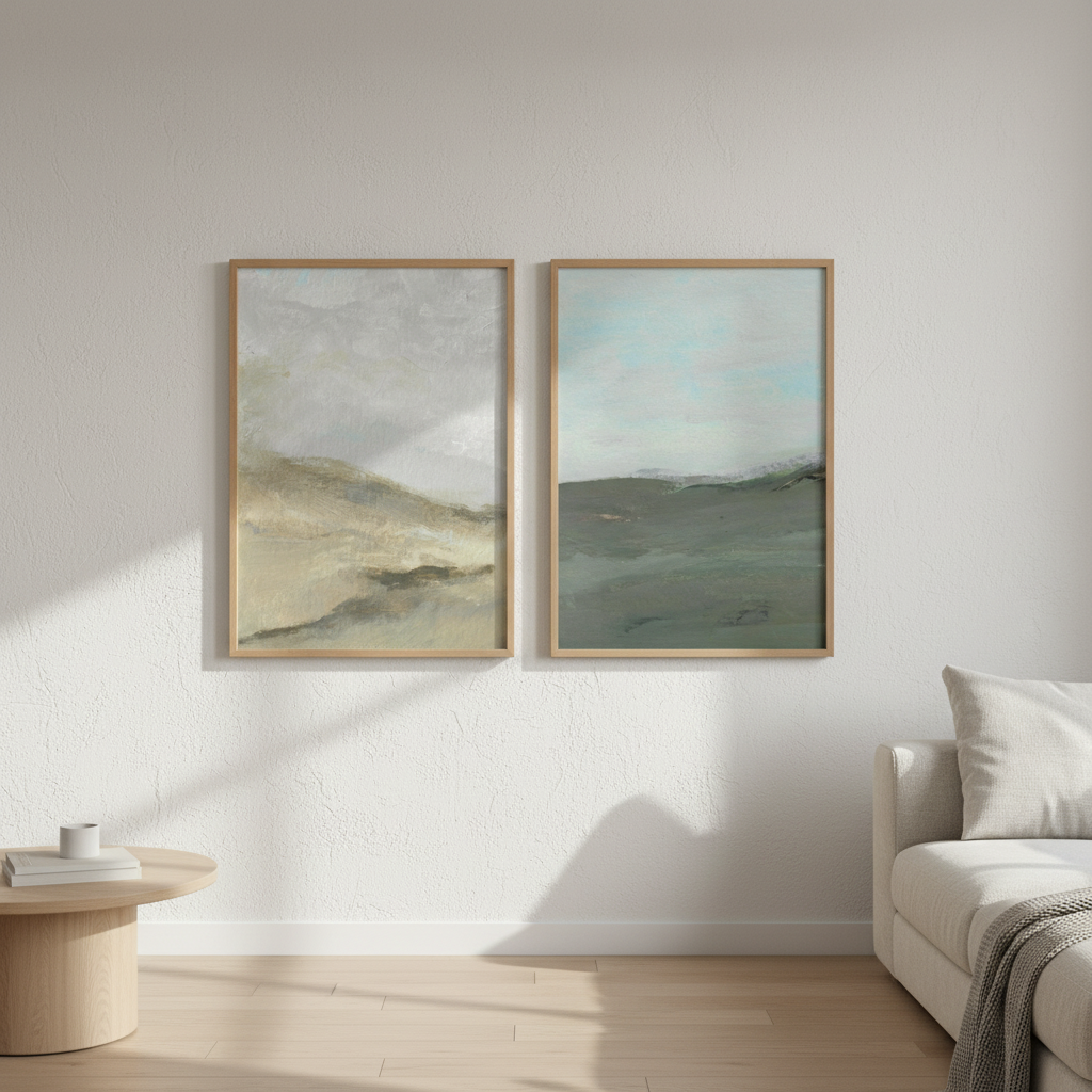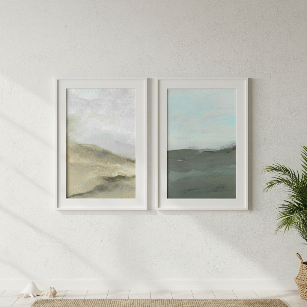 Elevate your space with this captivating pair of abstract watercolor landscapes by Josephine Wianto. Each piece features soft, blended hues that evoke natural beauty—one capturing the essence of wind-swept terrain, the other depicting rolling hills beneath a moody, cloud-laden sky. The fluid watercolor technique creates an ethereal quality that draws the eye while maintaining sophisticated restraint. Perfect for creating a cohesive gallery wall or anchoring a contemporary interior, these complementary works offer depth and movement without overwhelming the senses. An ideal choice for collectors seeking understated elegance and artistic refinement.
