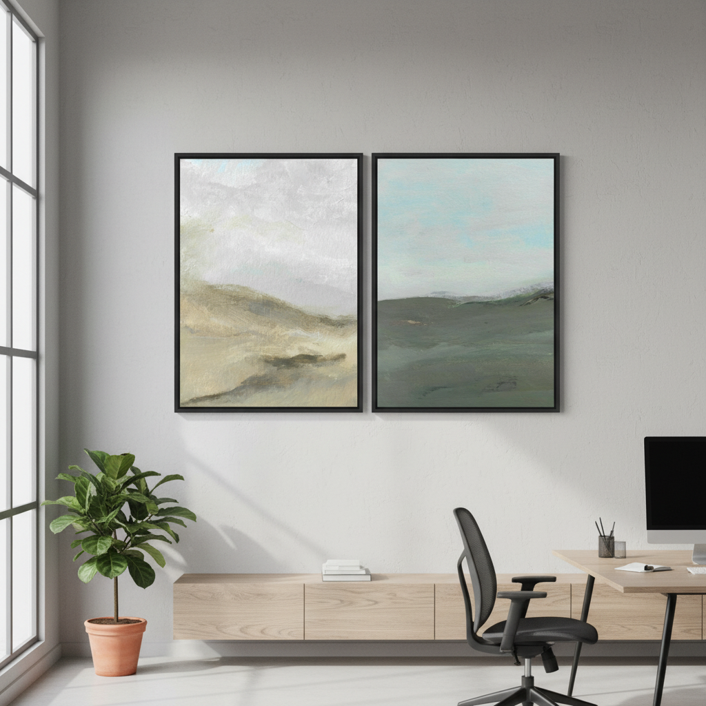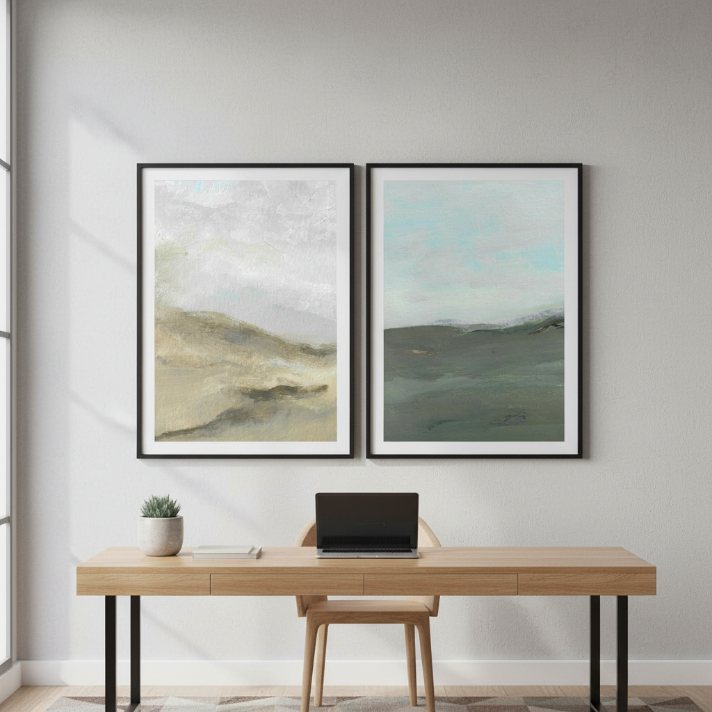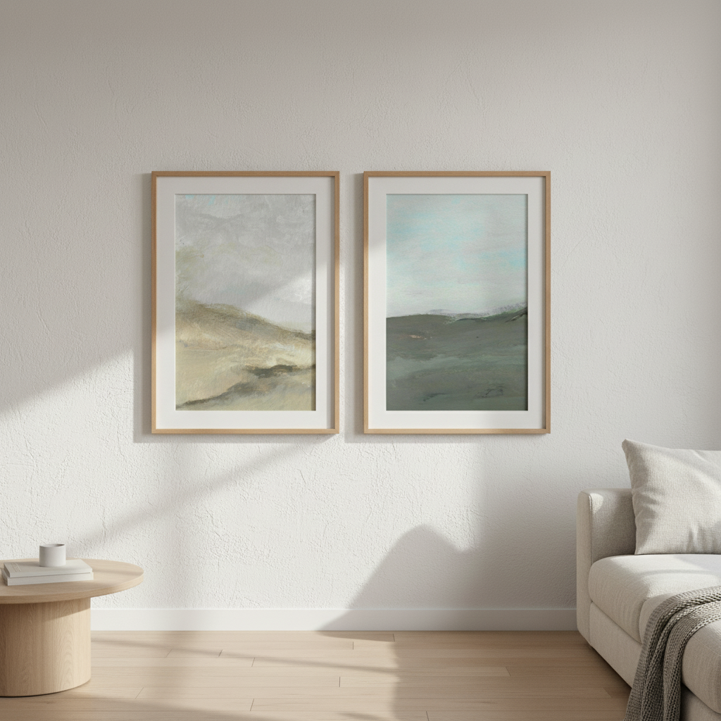 Elevate your space with this captivating pair of abstract watercolor landscapes by Josephine Wianto. Each piece features soft, blended hues that evoke natural beauty—one capturing the essence of wind-swept terrain, the other depicting rolling hills beneath a moody, cloud-laden sky. The fluid watercolor technique creates an ethereal quality that draws the eye while maintaining sophisticated restraint. Perfect for creating a cohesive gallery wall or anchoring a contemporary interior, these complementary works offer depth and movement without overwhelming the senses. An ideal choice for collectors seeking understated elegance and artistic refinement.