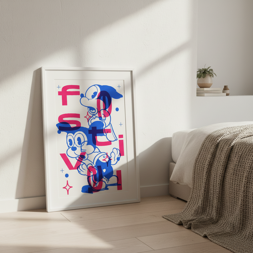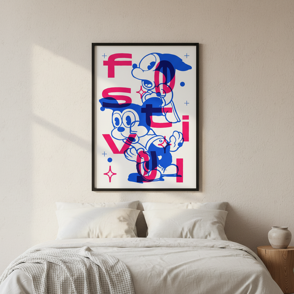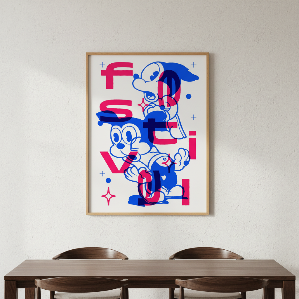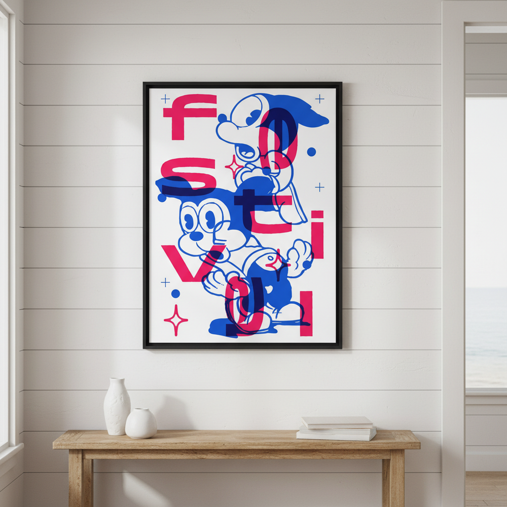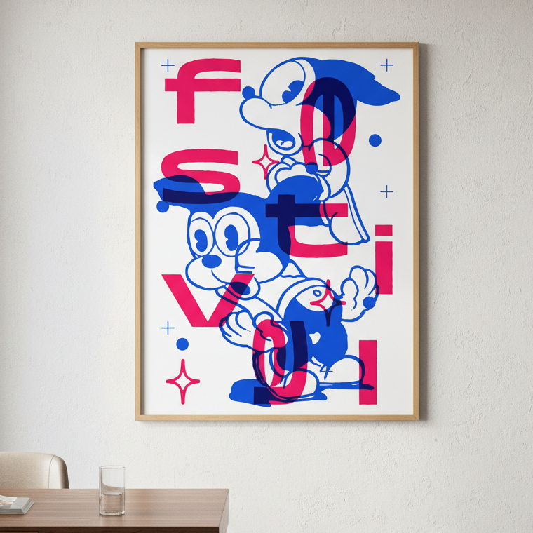 Bring joy to your walls with this vibrant artwork featuring whimsical cartoon characters dancing across a crisp white canvas. Bold, colorful text and playful graphics create an energetic focal point that sparks conversation and smiles. Perfect for adding personality to bedrooms, playrooms, or creative spaces, this piece by Jérôme Bizien captures the spirit of celebration and fun. A delightful choice for anyone who loves colour, character, and a touch of artistic whimsy.